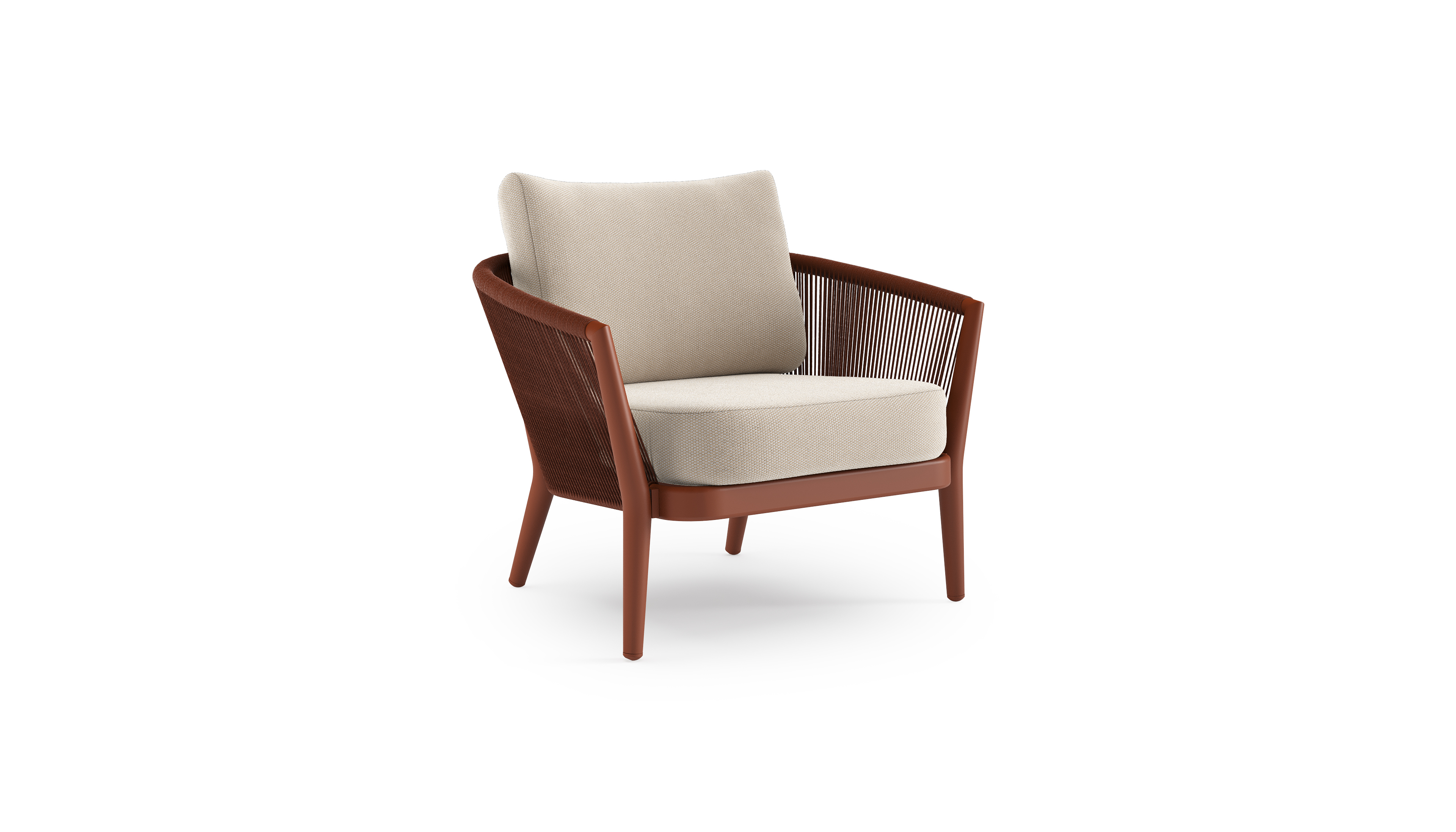 Fauteuil de jardin Orso en aluminium brun rouille en corde ronde tissée verticalement brun rouille et coussins en all weather sunbrella® luxe Lopi Antique | Exterioo mobilier de jardin