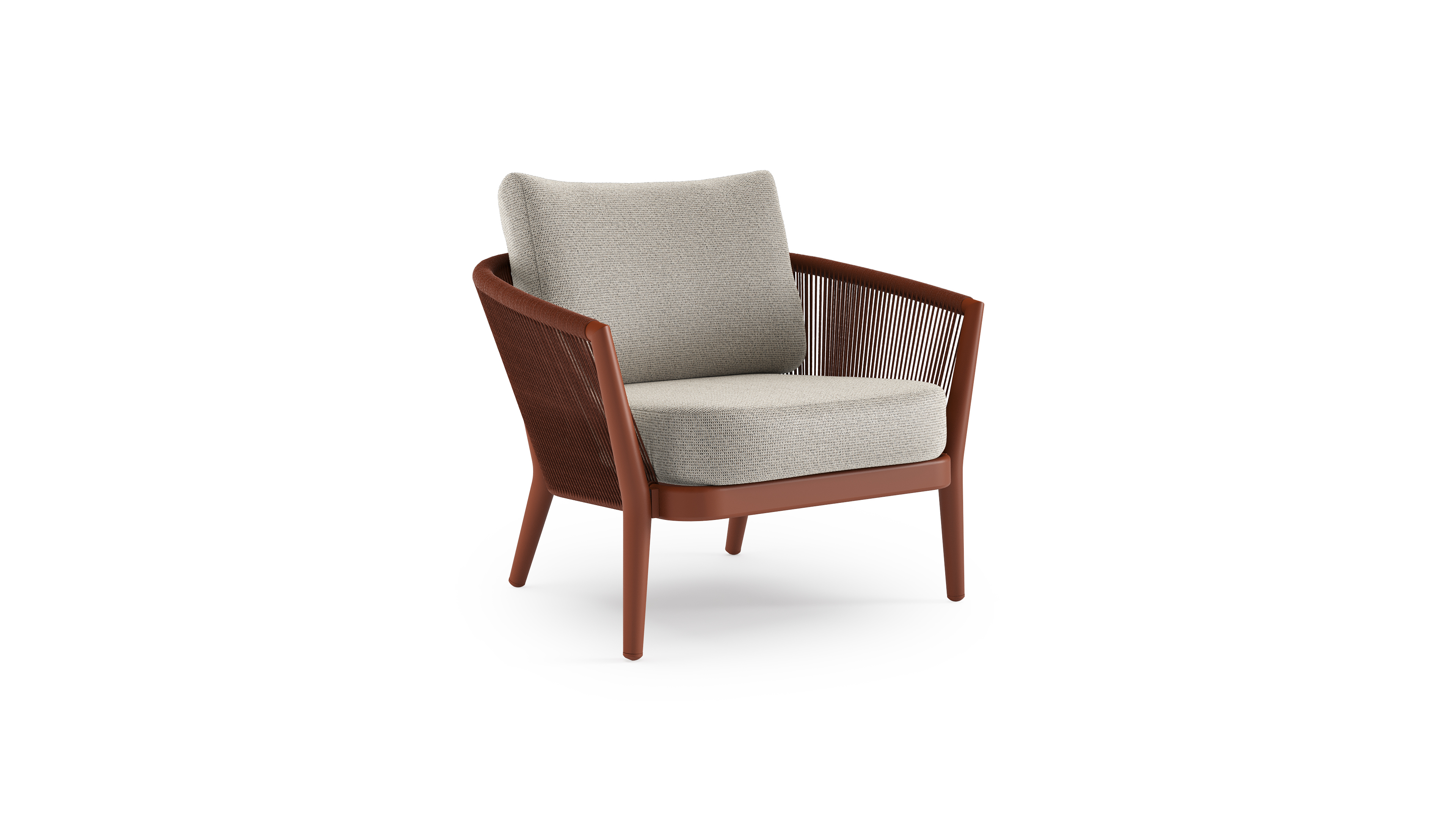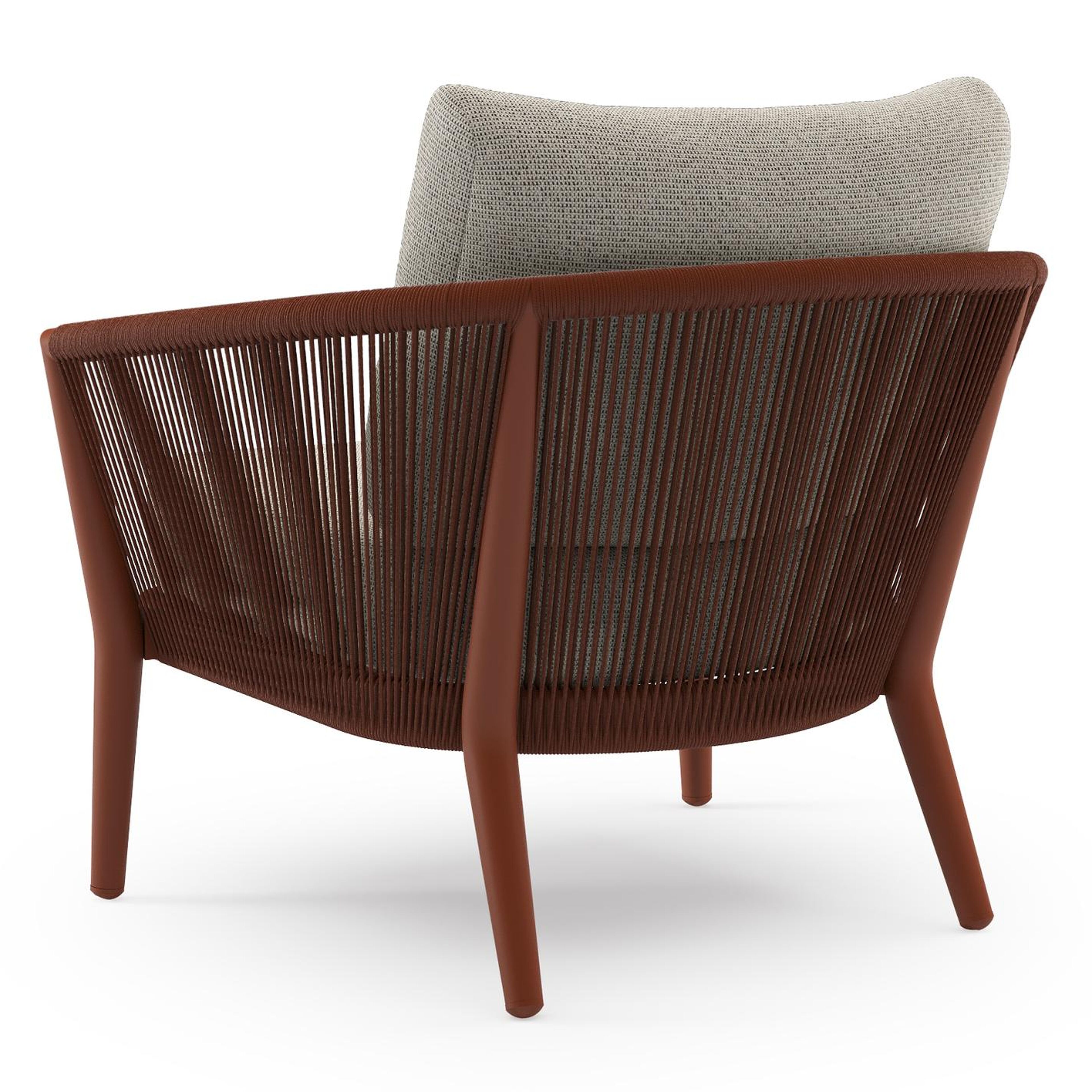 Fauteuil de jardin Orso en aluminium brun rouille en corde ronde tissée verticalement brun rouille et coussins en all weather solica Firenze Sand | Exterioo mobilier de jardin