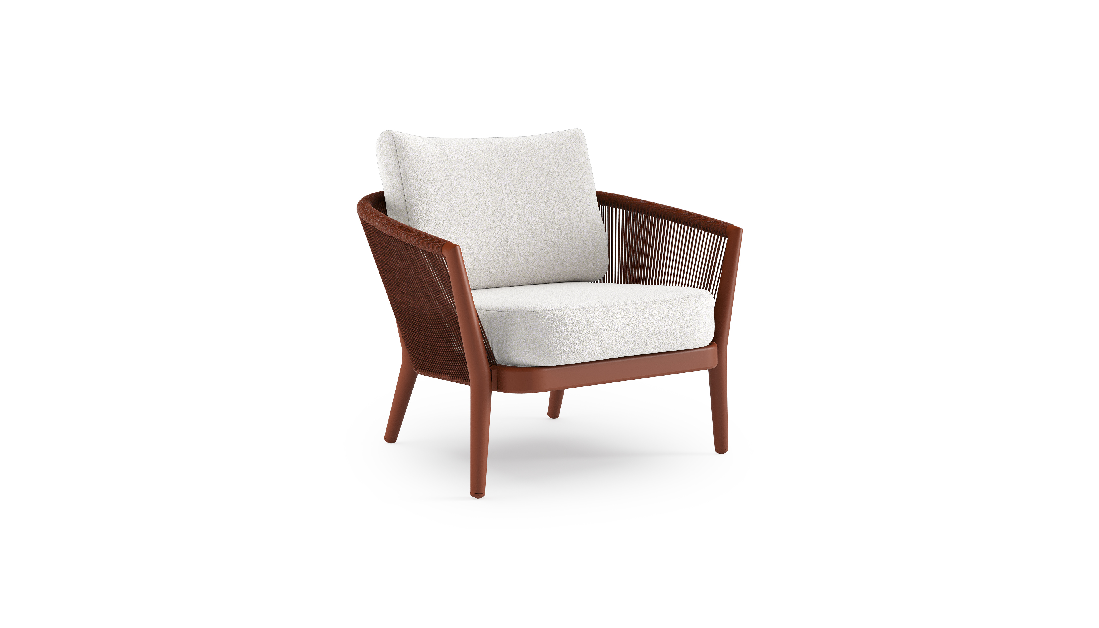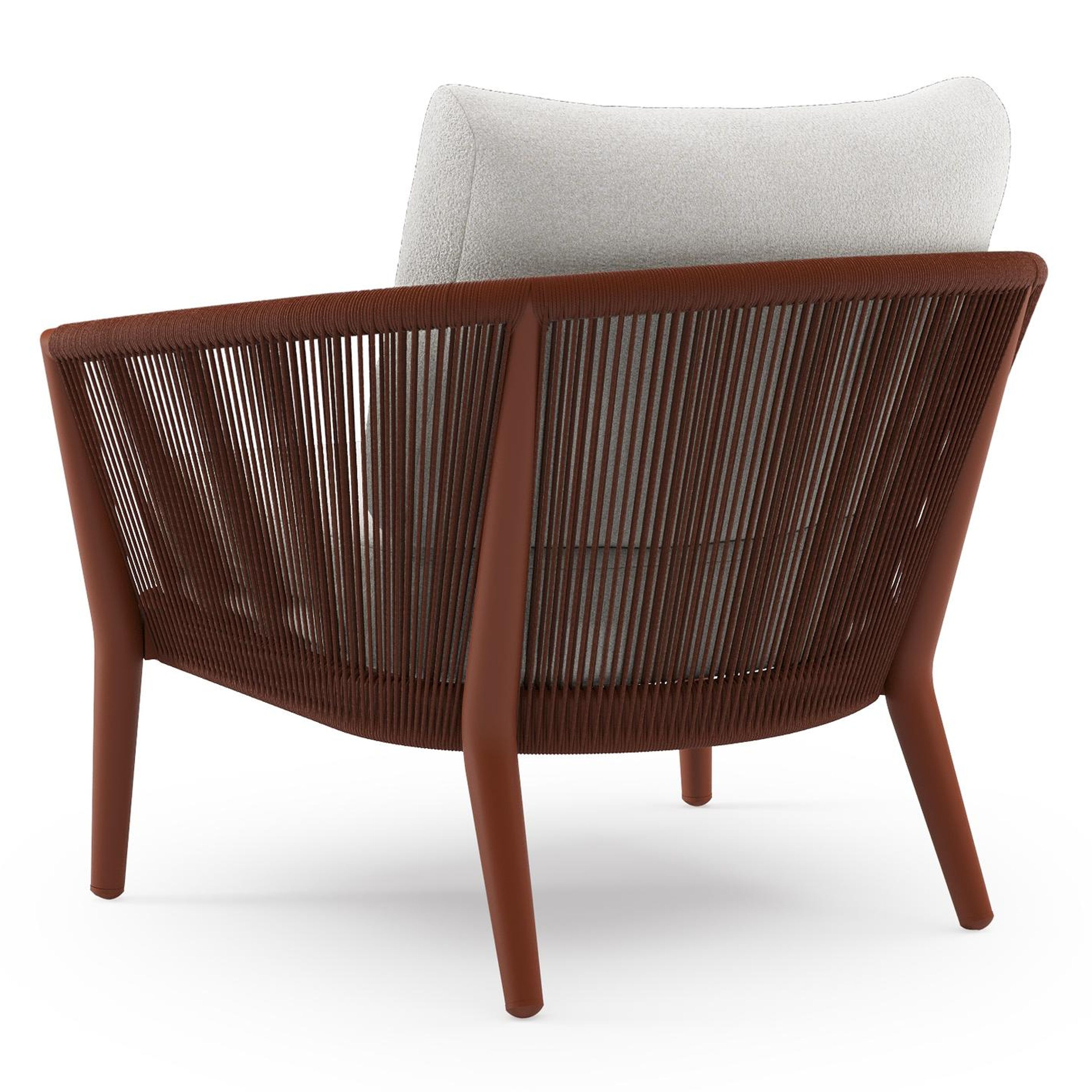 Fauteuil de jardin Orso en aluminium brun rouille en corde ronde tissée verticalement brun rouille et coussins en all weather solica Soul Optik | Exterioo mobilier de jardin