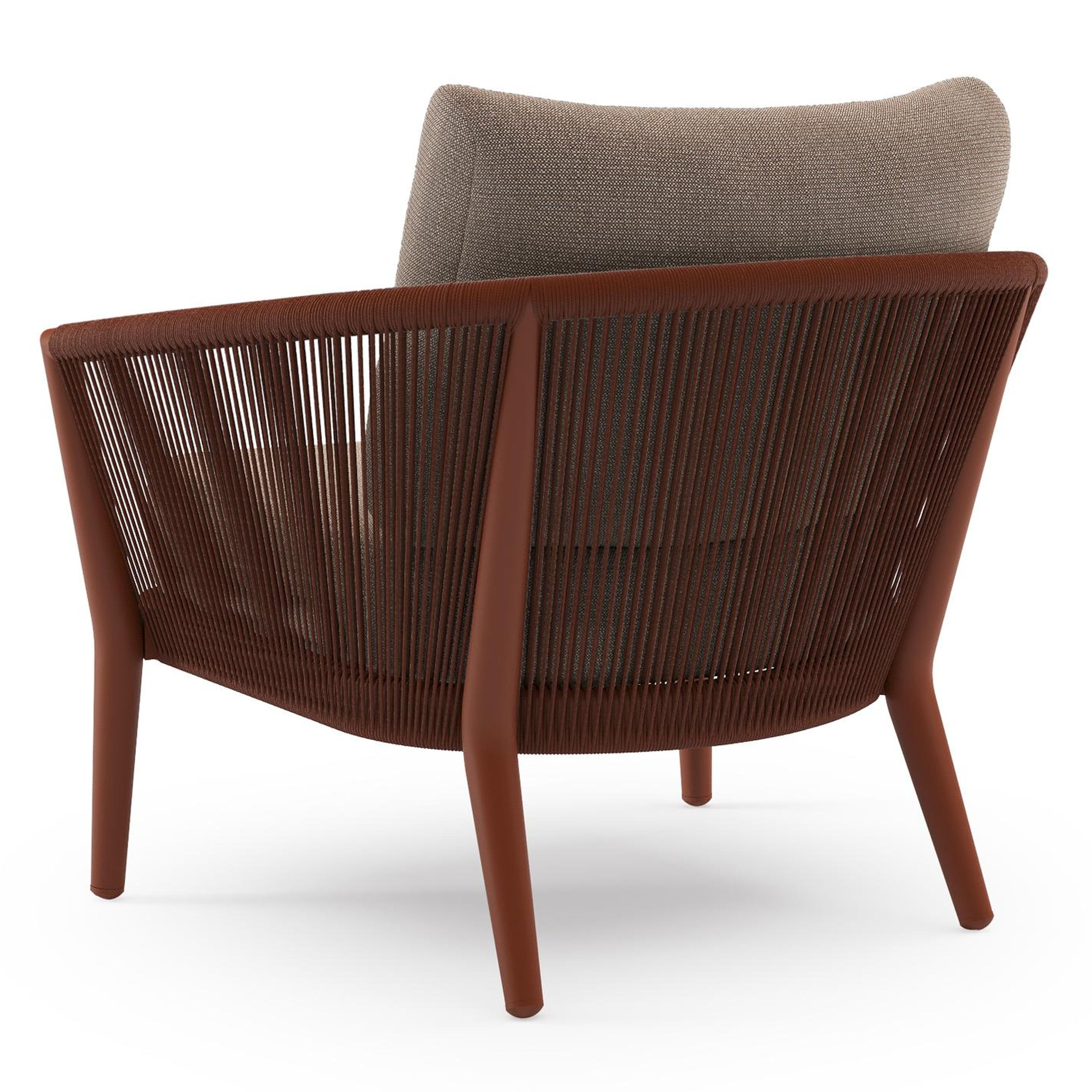 Fauteuil de jardin Orso en aluminium brun rouille en corde ronde tissée verticalement brun rouille et coussins en all weather sunbrella® luxe Savane Earth | Exterioo mobilier de jardin