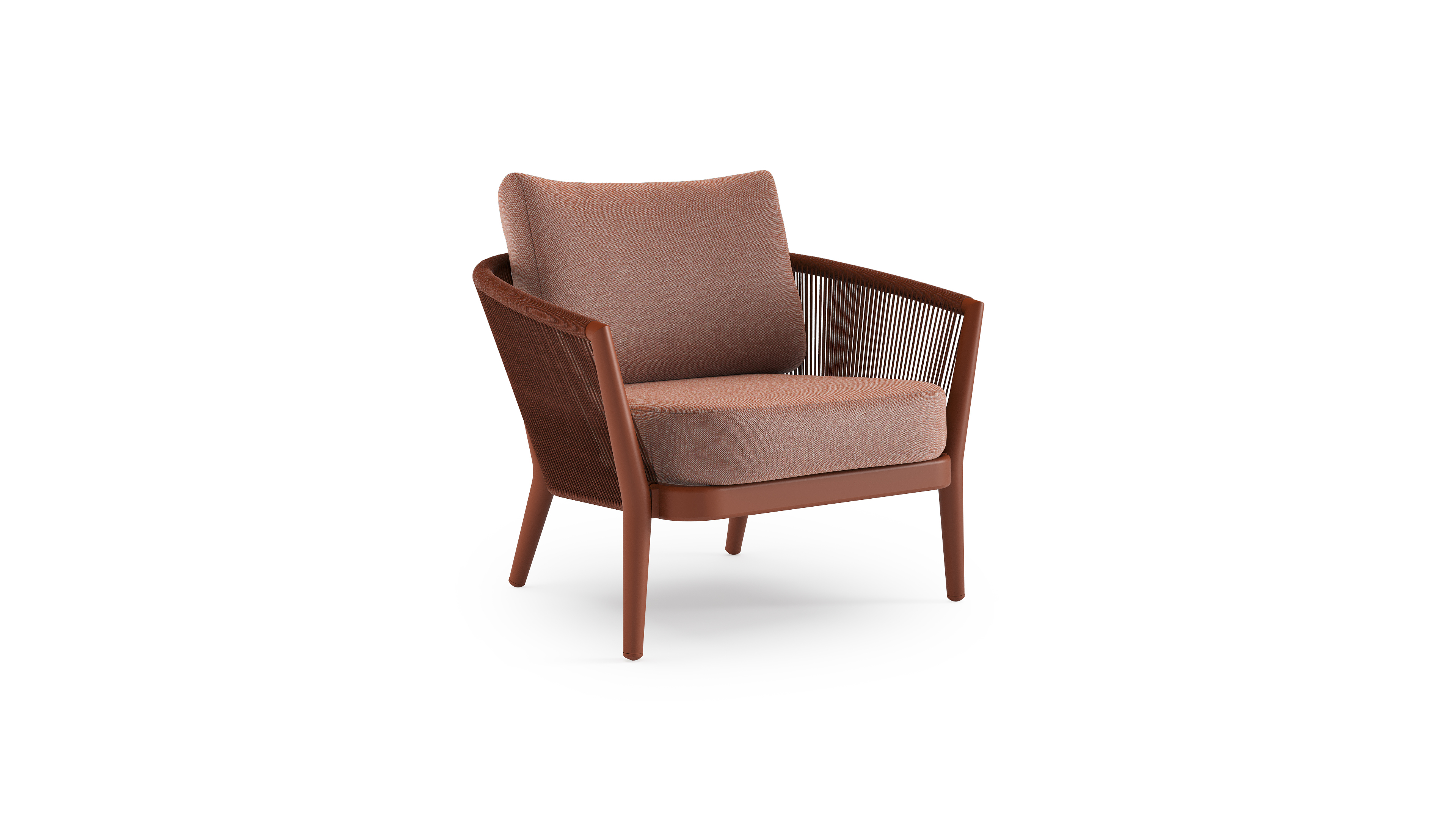 Fauteuil de jardin Orso en aluminium brun rouille en corde ronde tissée verticalement brun rouille et coussins en all weather sunbrella® luxe Savane Rust | Exterioo mobilier de jardin