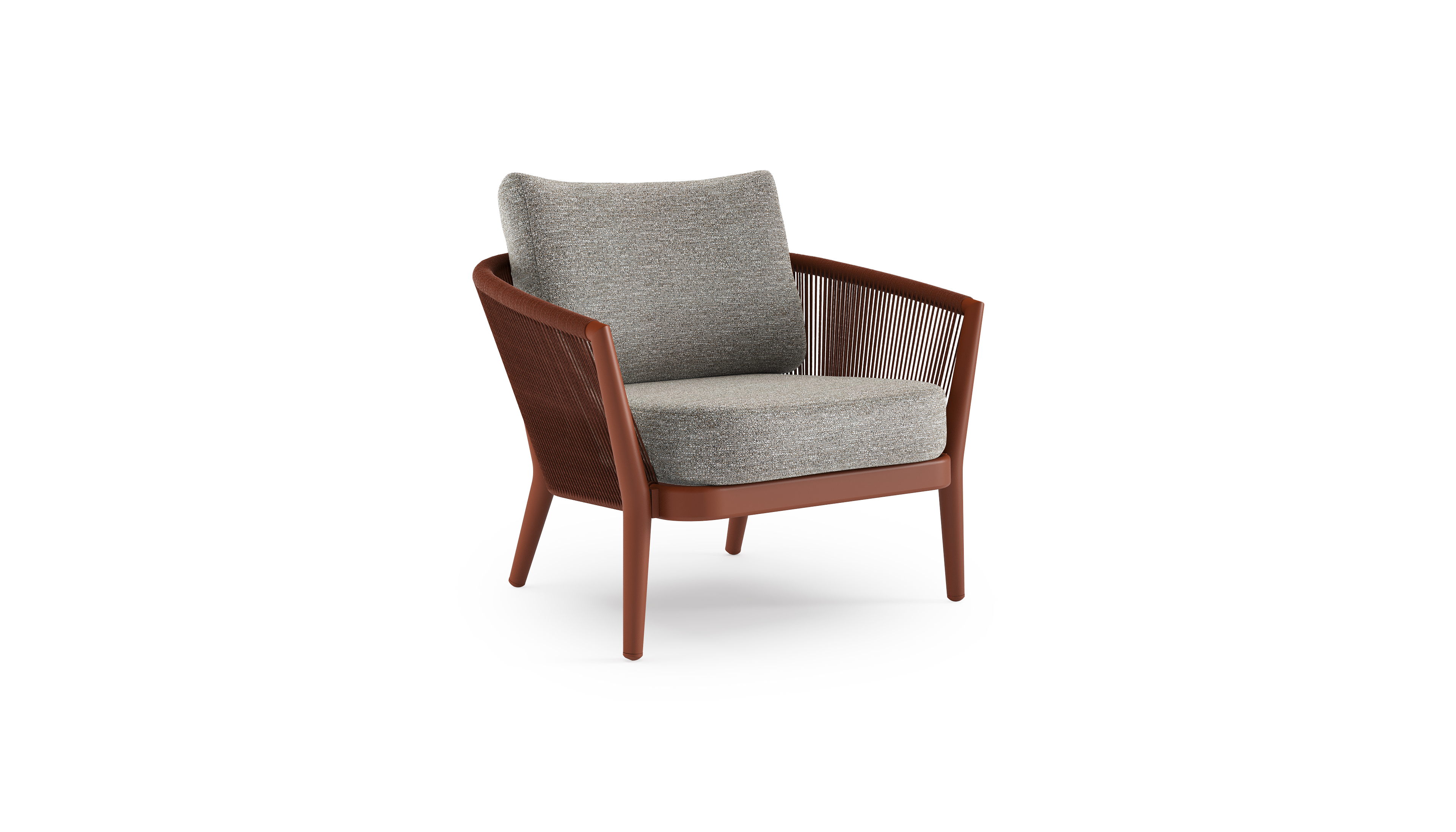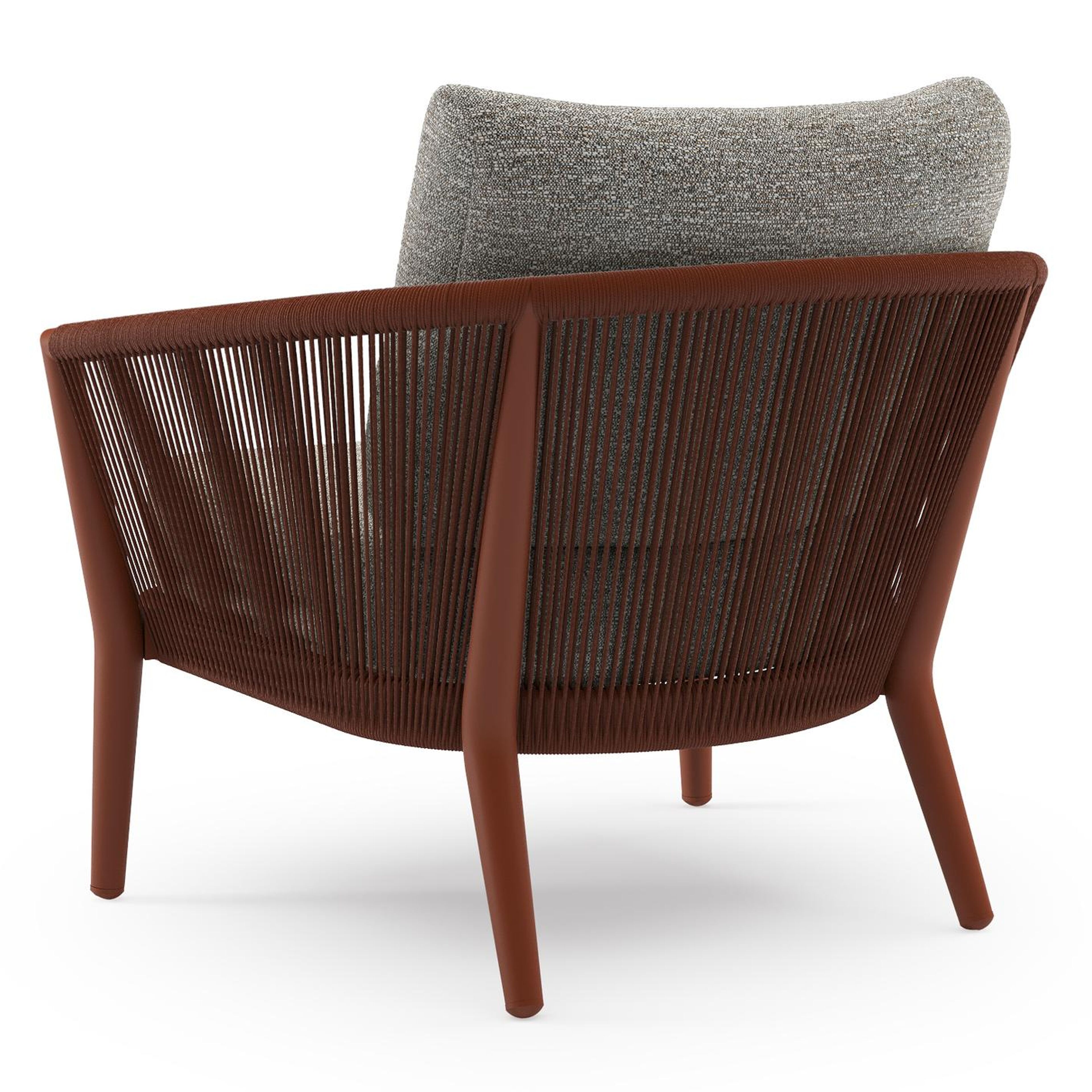 Fauteuil de jardin Orso en aluminium brun rouille en corde ronde tissée verticalement brun rouille et coussins en all weather sunbrella® luxe Tundra Pepper | Exterioo mobilier de jardin