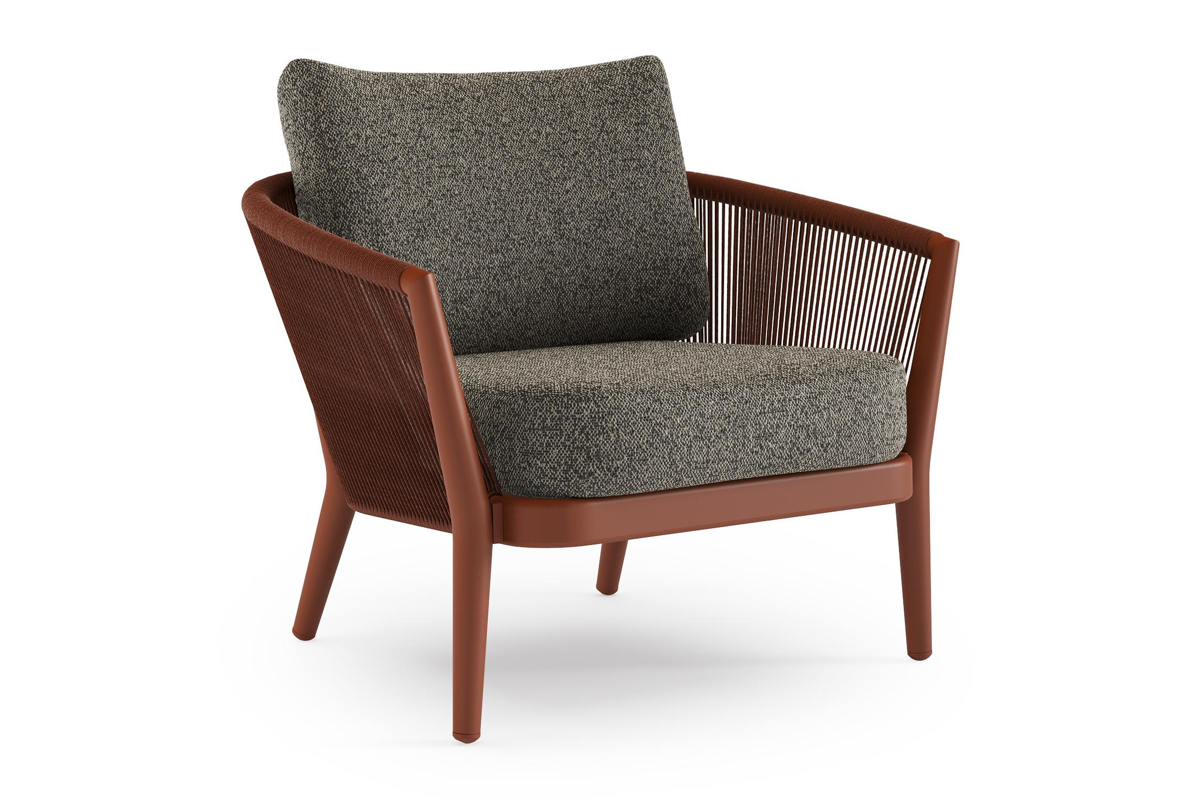 Fauteuil de jardin Orso en aluminium brun rouille en corde ronde tissée verticalement brun rouille et coussins en all weather cosytica Marbella Tunder | Exterioo