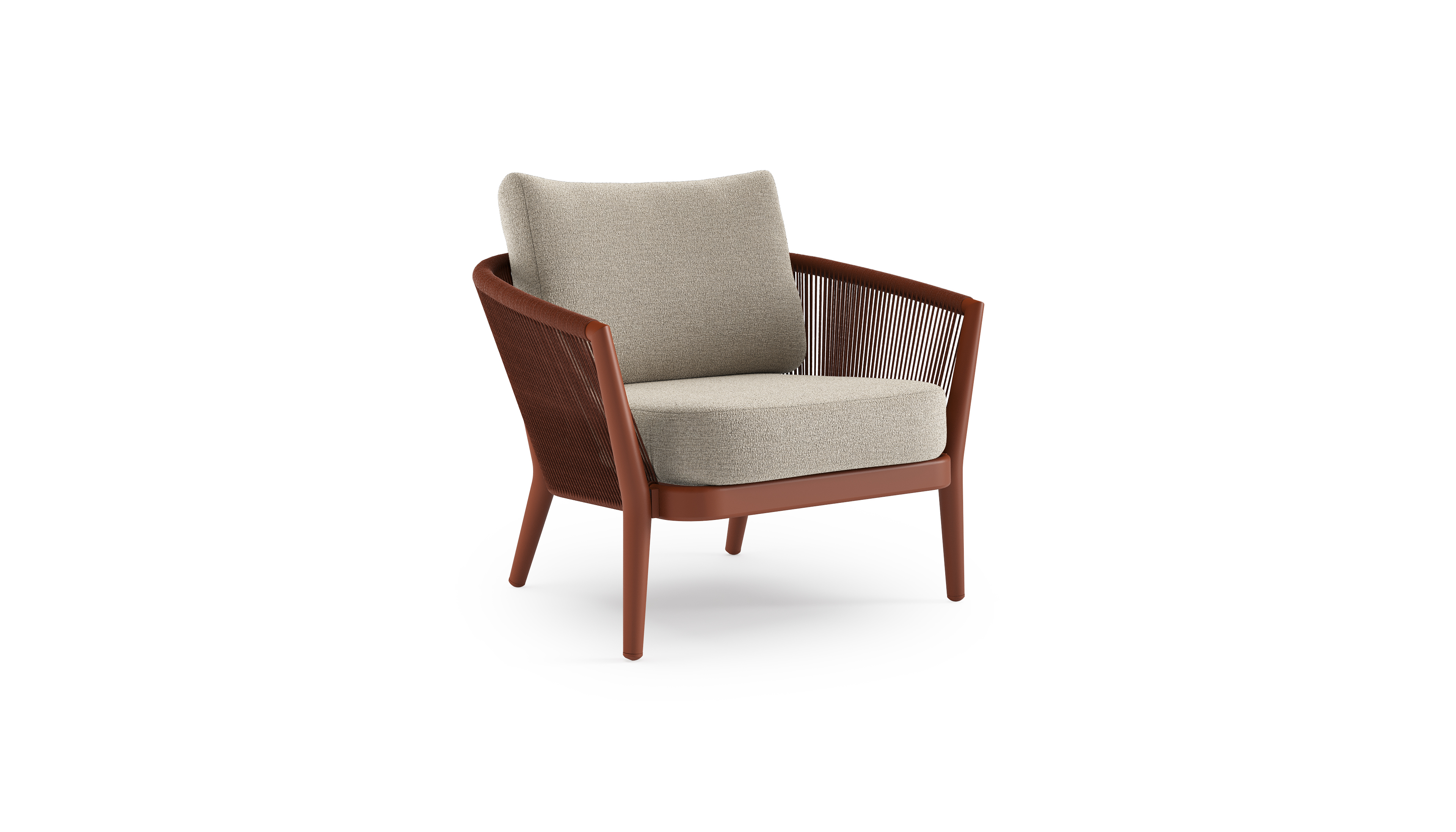 Fauteuil de jardin Orso en aluminium brun rouille en corde ronde tissée verticalement brun rouille et coussins en all weather cosytica Catania Greige | Exterioo mobilier de jardin