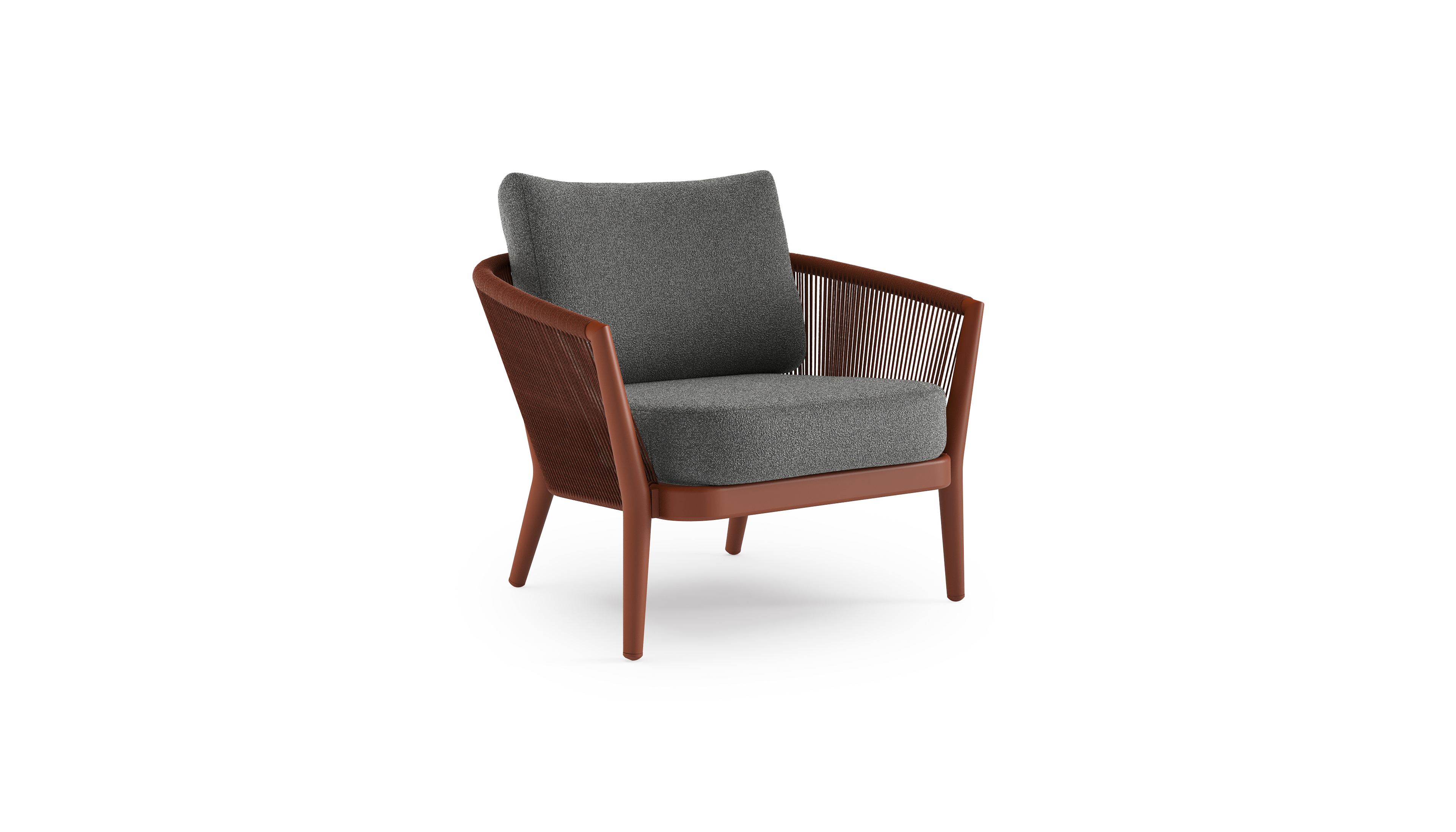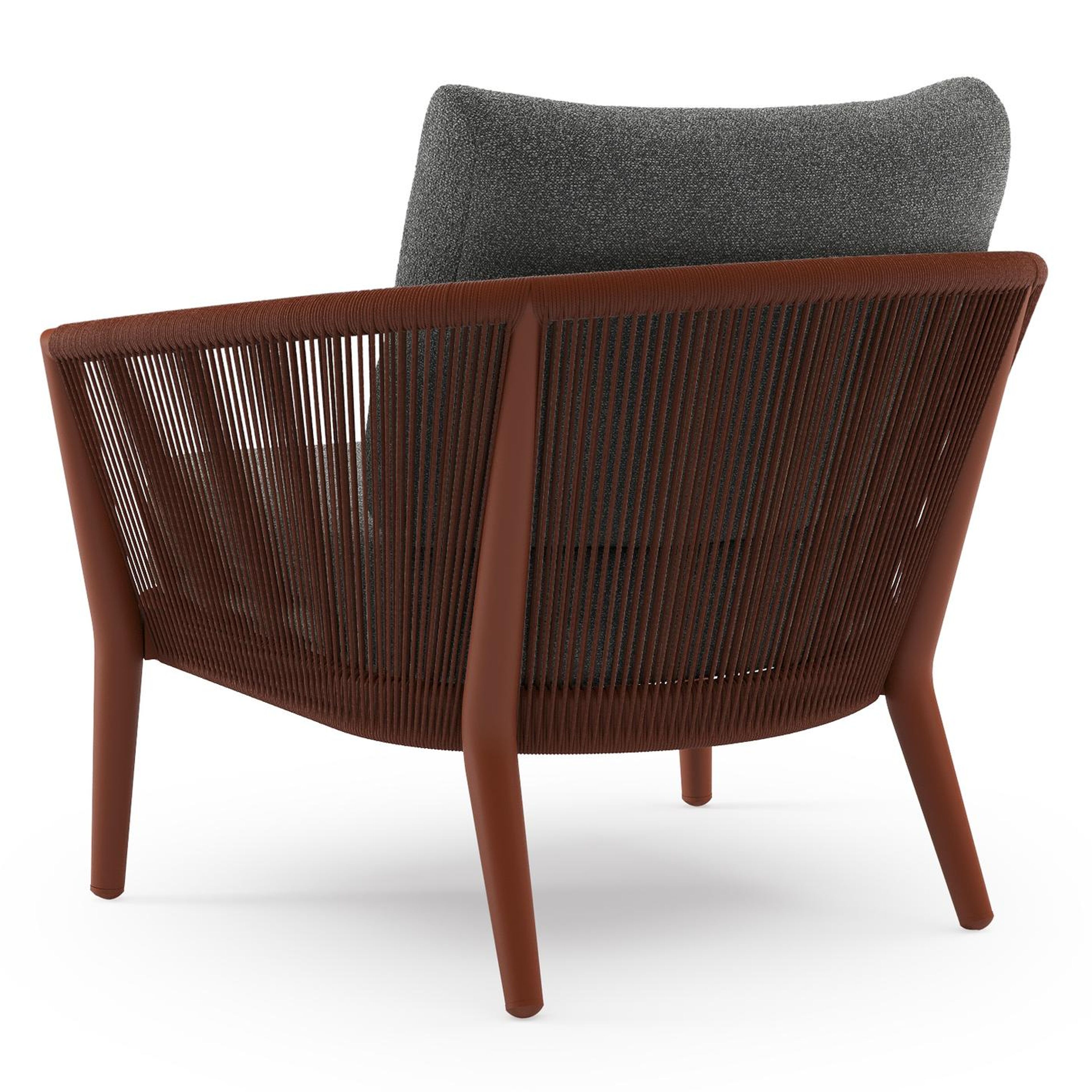 Fauteuil de jardin Orso en aluminium brun rouille en corde ronde tissée verticalement brun rouille et coussins en all weather cosytica Catania Black | Exterioo mobilier de jardin
