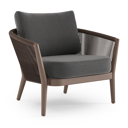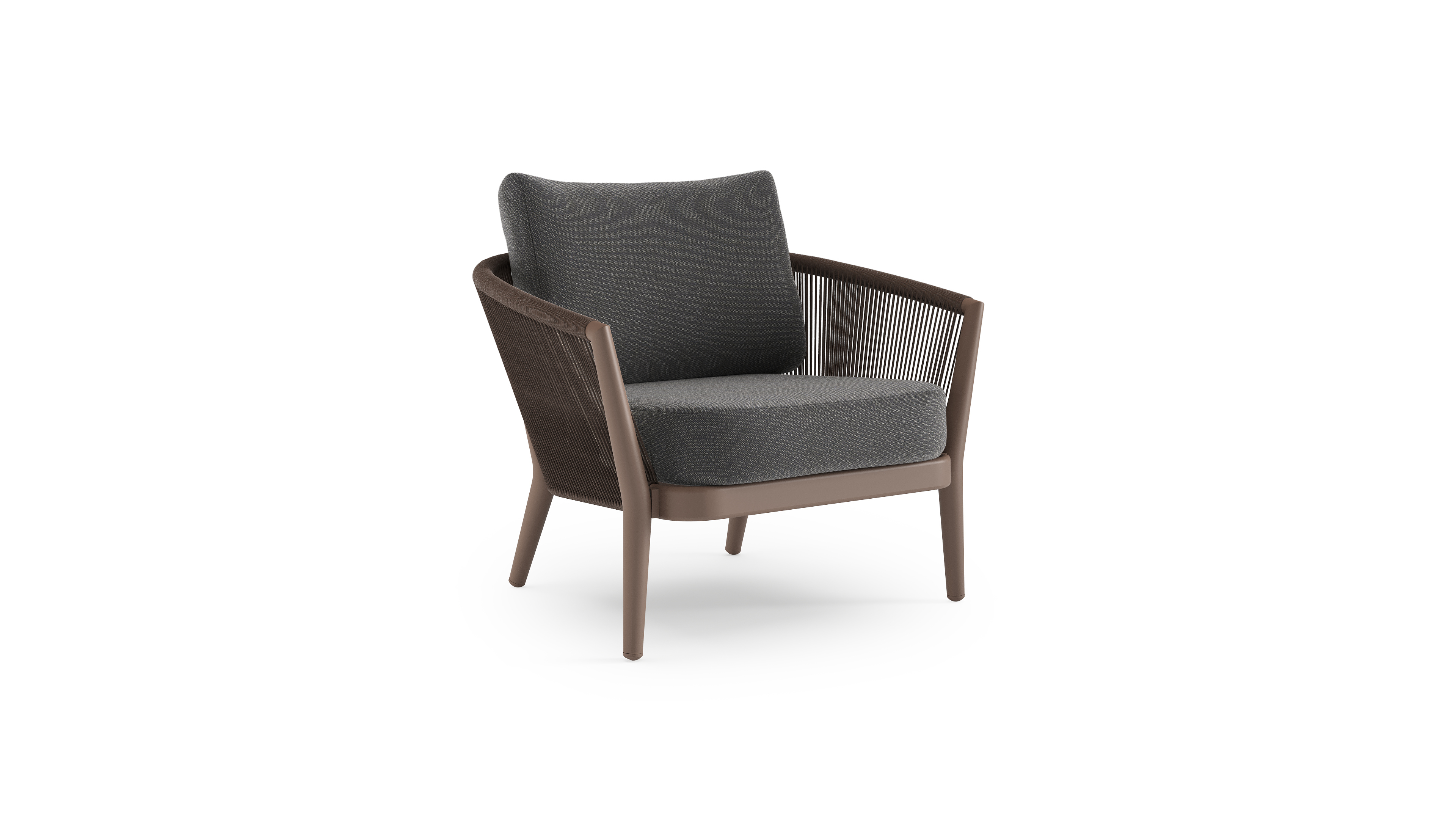 Fauteuil de jardin Orso en aluminium taupe en corde ronde tissée verticalement noir et coussins en all weather sunbrella® luxe Savane Tornado | Exterioo mobilier de jardin