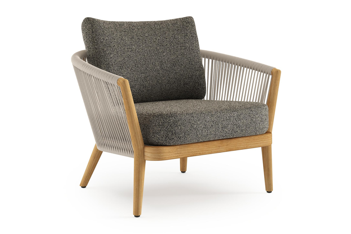 Fauteuil de jardin Orso en tecken corde ronde tissée verticalement beige et coussins en all weather cosytica Marbella Tunder | Exterioo