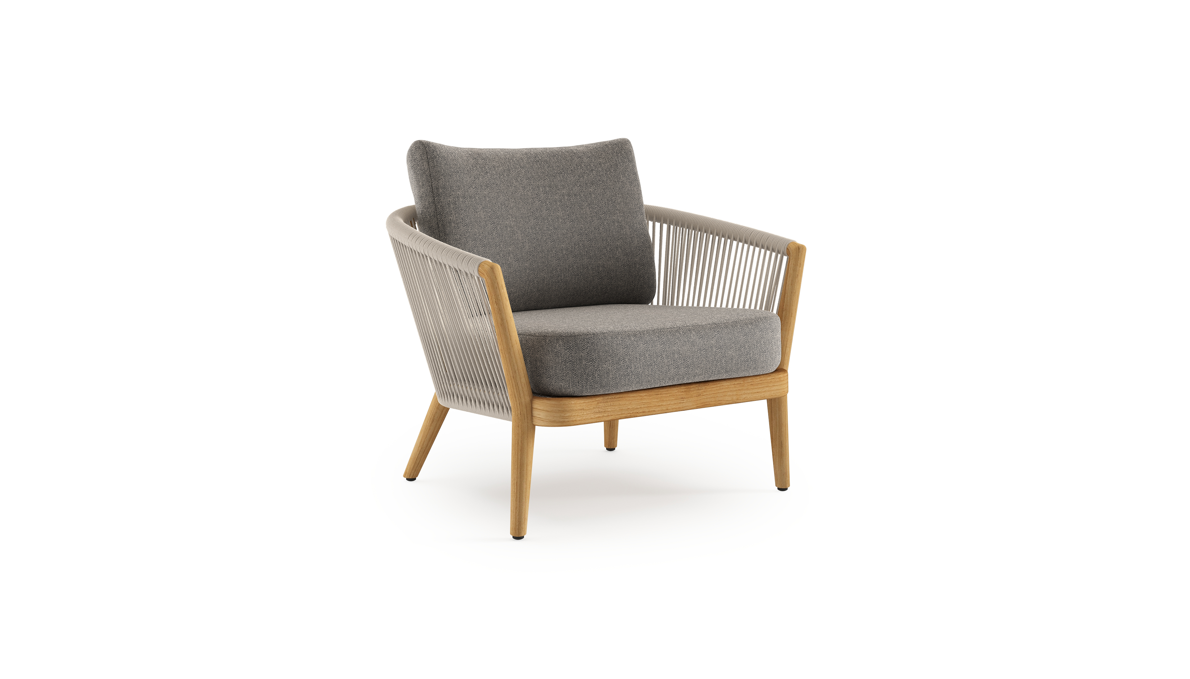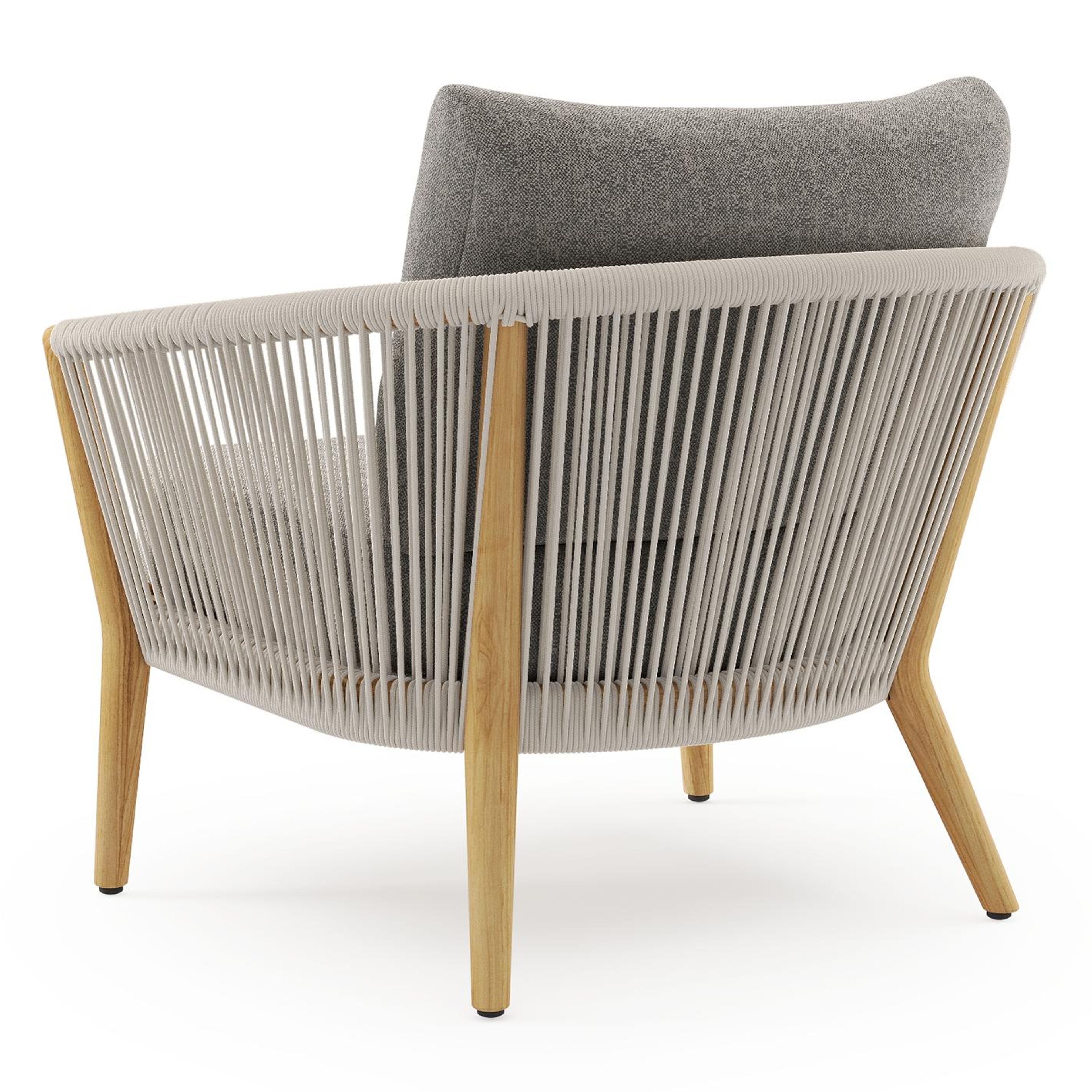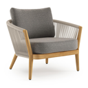 Fauteuil de jardin Orso en tecken corde ronde tissée verticalement beige et coussins en all weather sunbrella® luxe Chartres Drizzle | Exterioo mobilier de jardin