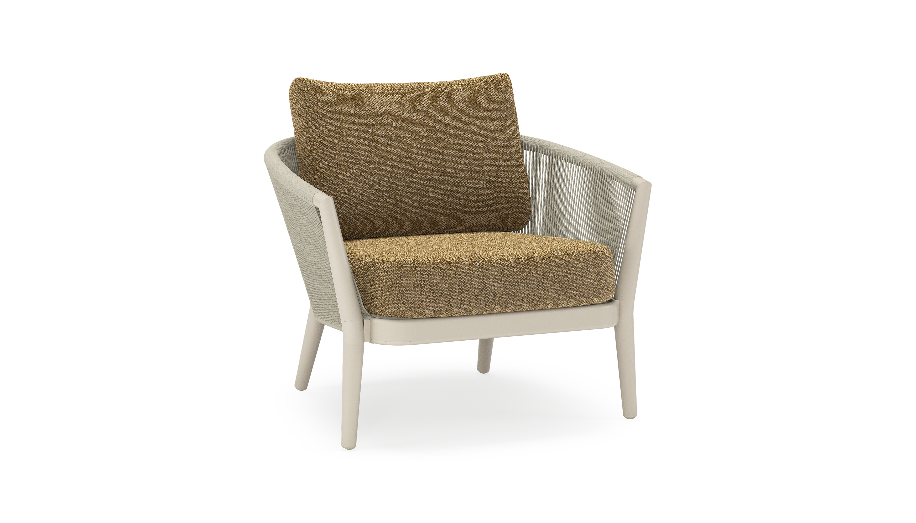 Fauteuil de jardin Orso en aluminium beige en corde ronde tissée verticalement beige et coussins en all weather cosytica Madagascar Walnut | Exterioo mobilier de jardin