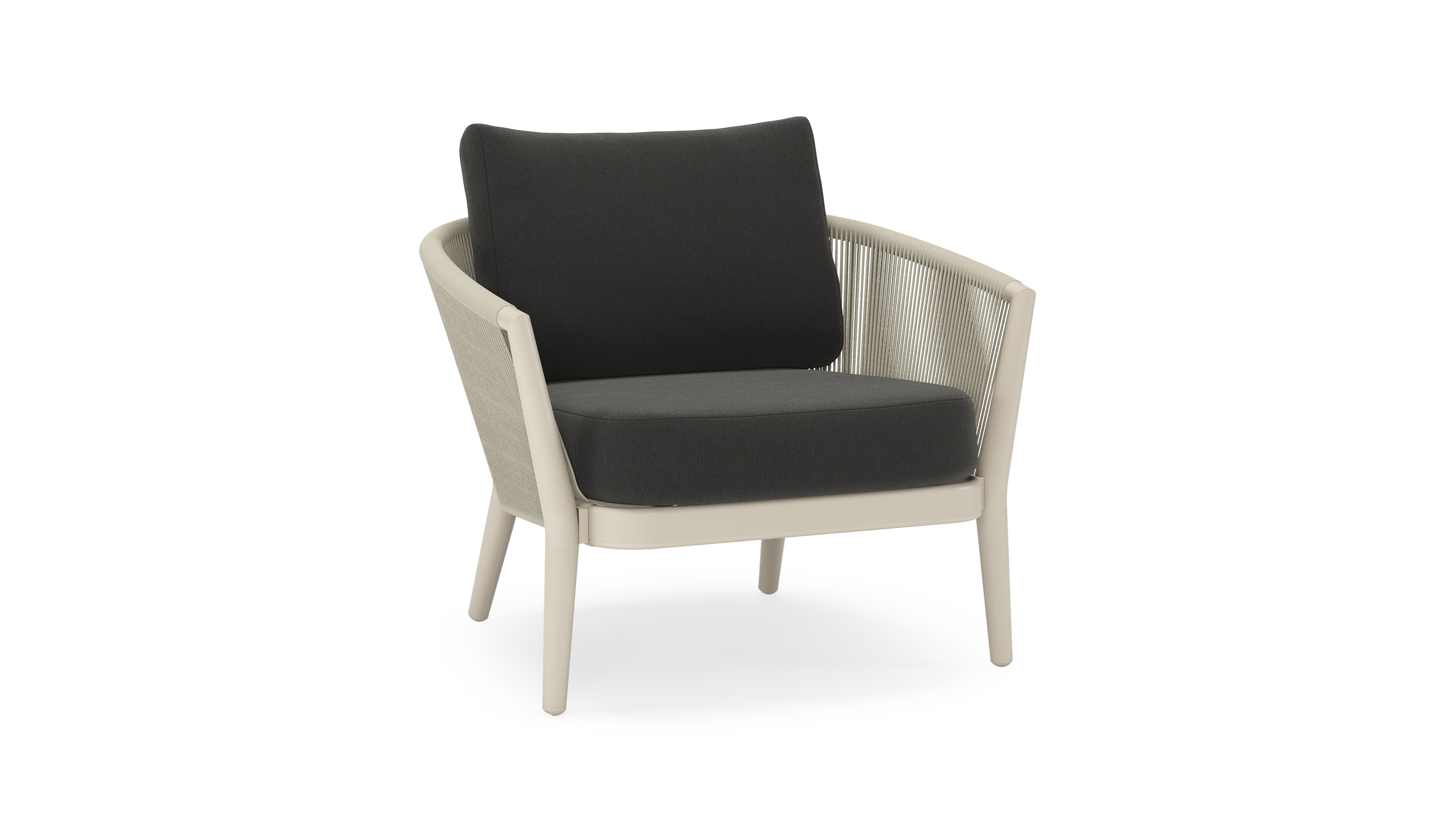Fauteuil de jardin Orso en aluminium beige en corde ronde tissée verticalement beige et coussins en all weather sunbrella® luxe Natte Sooty | Exterioo mobilier de jardin