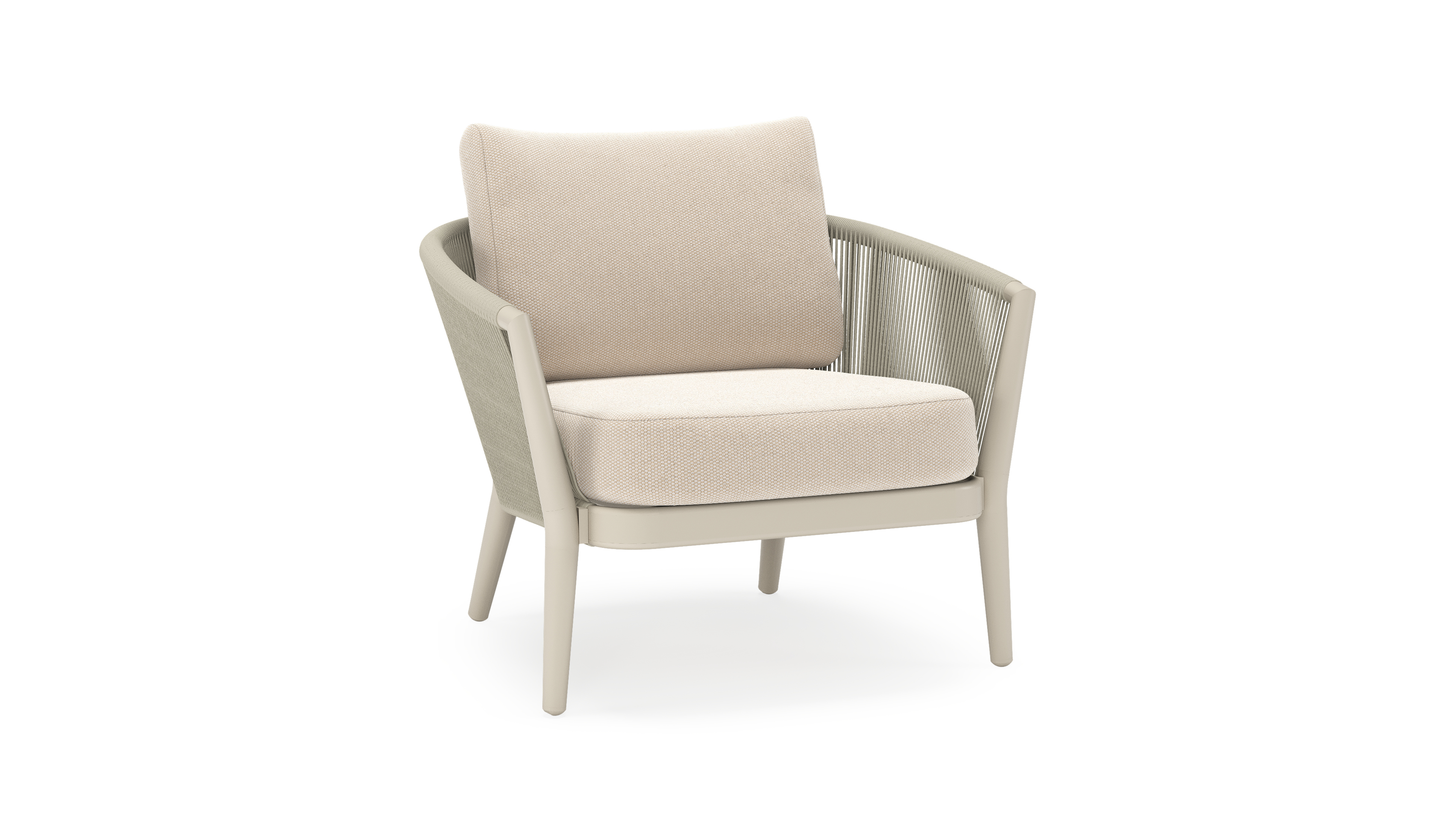 Fauteuil de jardin Orso en aluminium beige en corde ronde tissée verticalement beige et coussins en all weather sunbrella® luxe Lopi Antique | Exterioo mobilier de jardin