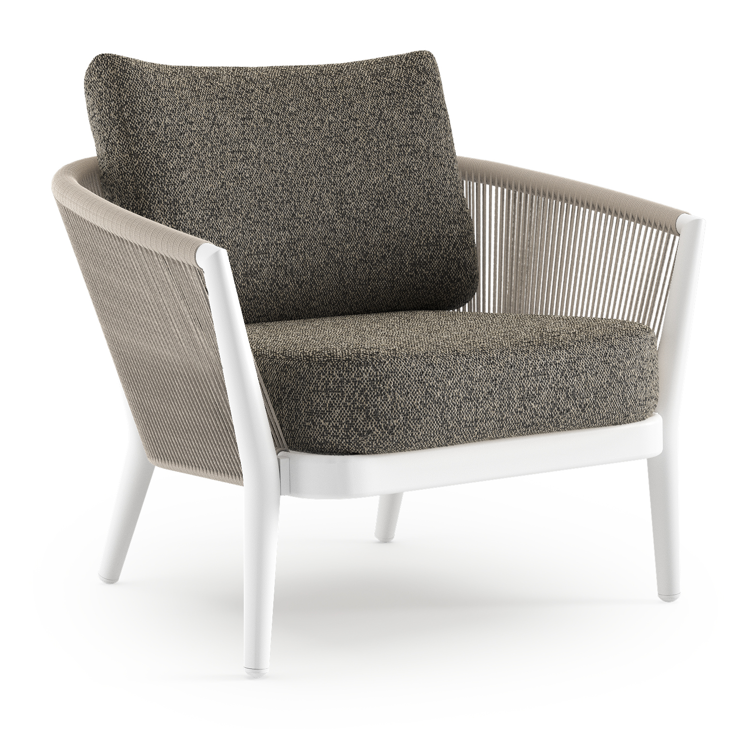 Fauteuil de jardin Orso en aluminium blanc en corde ronde tissée verticalement beige et coussins en all weather cosytica Marbella Tunder | Exterioo mobilier de jardin