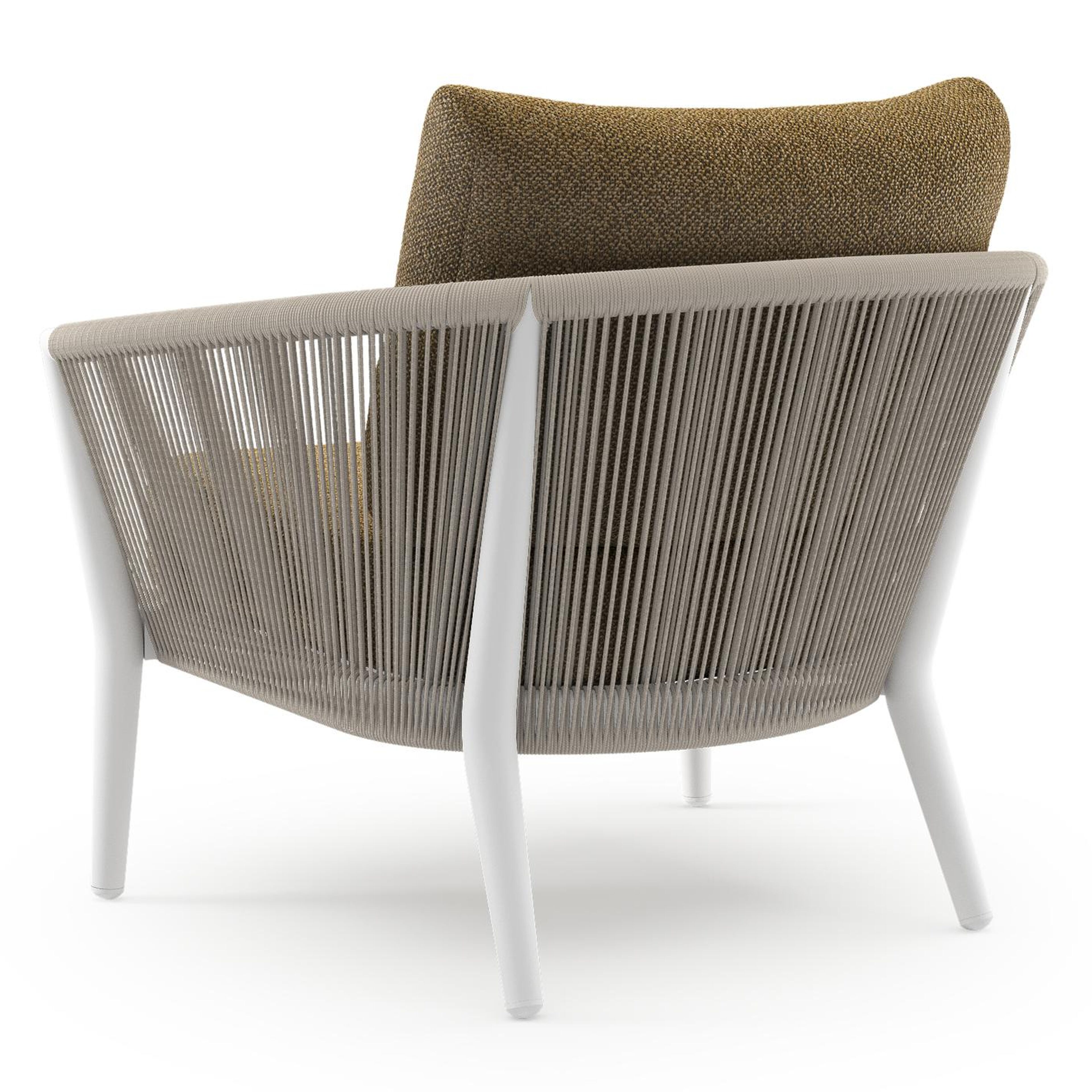 Fauteuil de jardin Orso en aluminium blanc en corde ronde tissée verticalement beige et coussins en all weather cosytica Madagascar Walnut | Exterioo mobilier de jardin