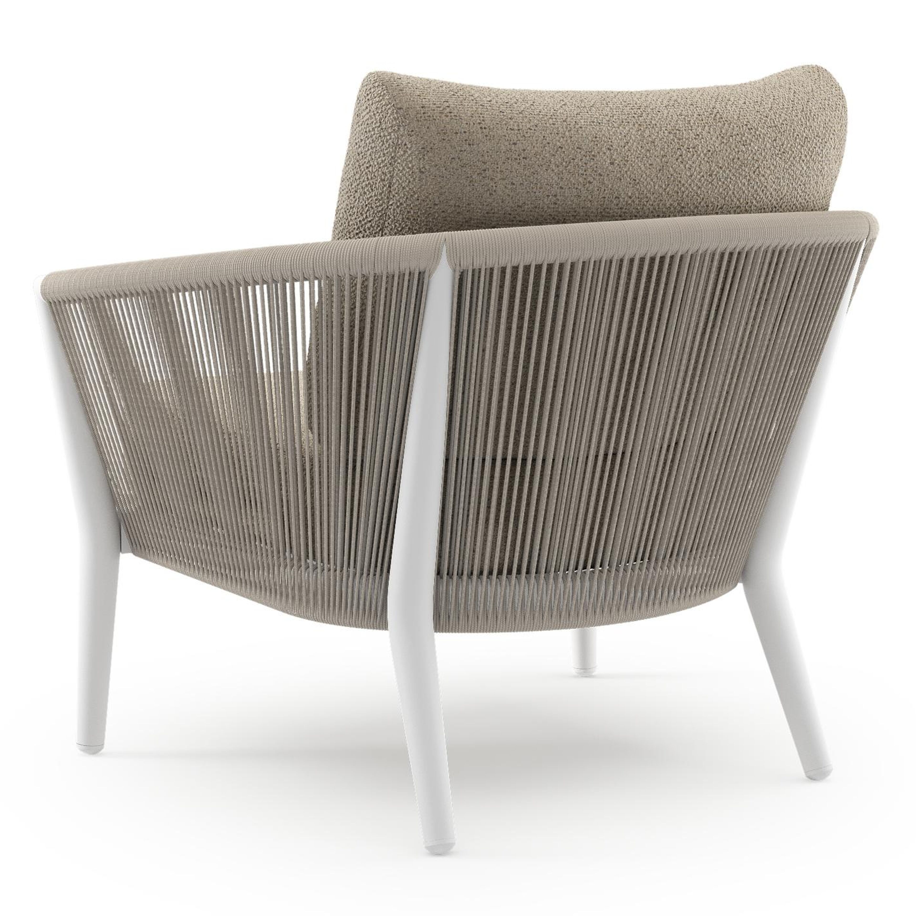 Fauteuil de jardin Orso en aluminium blanc en corde ronde tissée verticalement beige et coussins en all weather cosytica Bora Desert | Exterioo mobilier de jardin