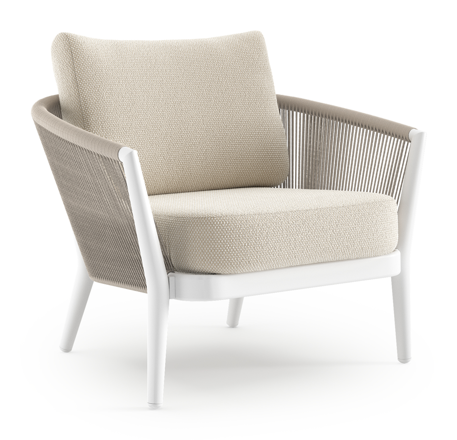 Fauteuil de jardin Orso en aluminium blanc en corde ronde tissée verticalement beige et coussins en all weather cosytica Althea Off White | Exterioo mobilier de jardin