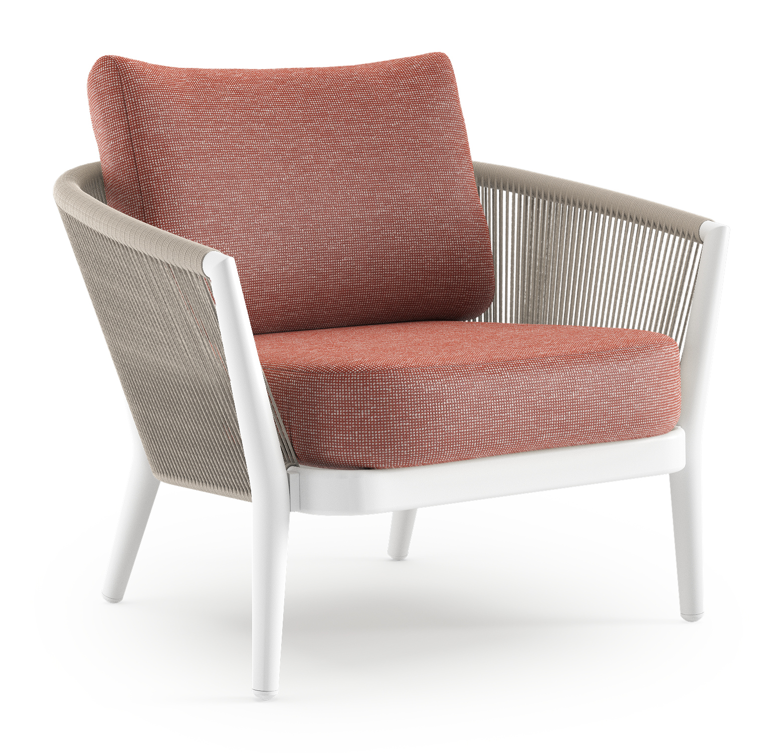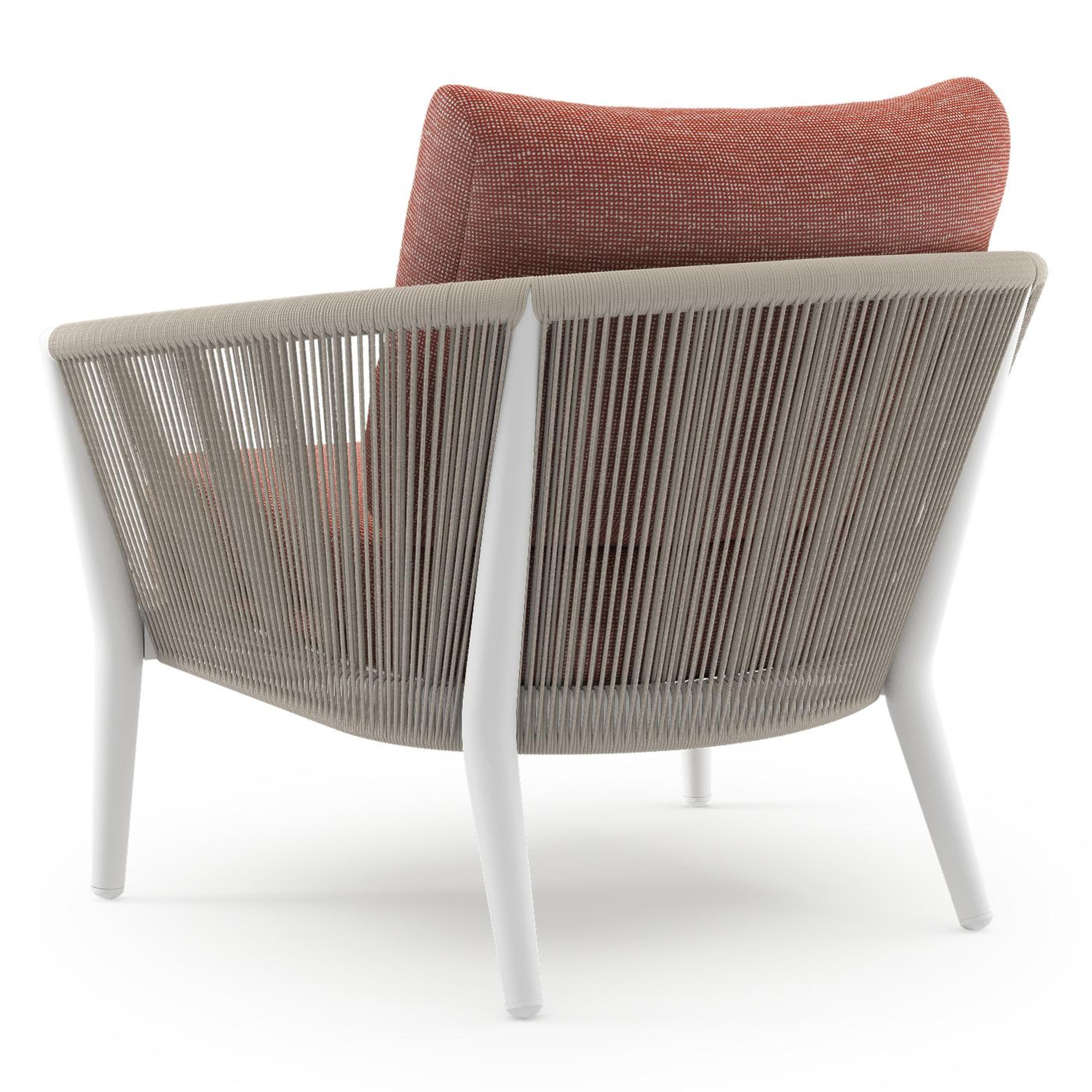Fauteuil de jardin Orso en aluminium blanc en corde ronde tissée verticalement beige et coussins en all weather sunbrella® luxe Slow Alezan | Exterioo mobilier de jardin