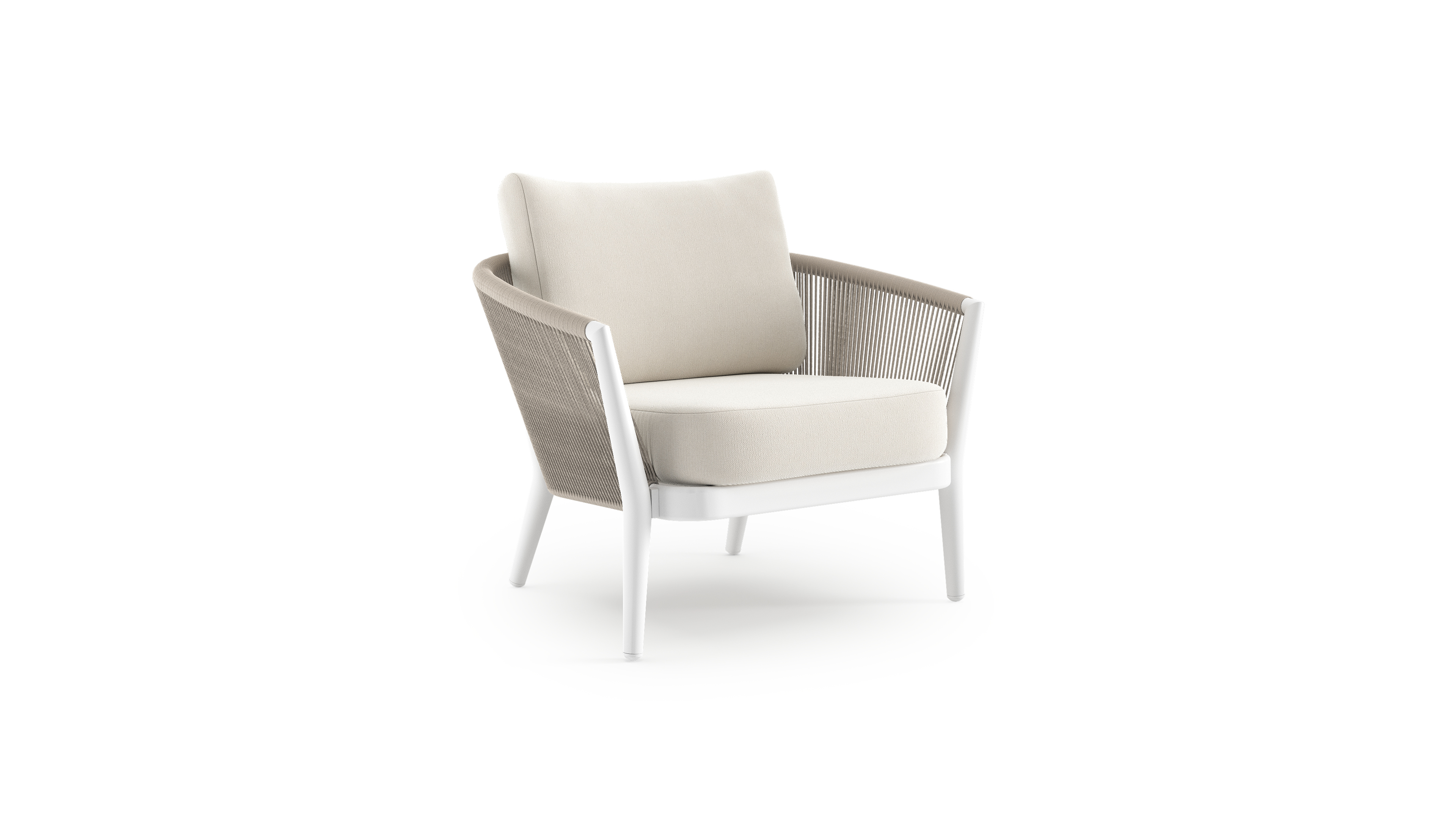 Fauteuil de jardin Orso en aluminium blanc en corde ronde tissée verticalement beige et coussins en all weather sunbrella® luxe Savane White | Exterioo mobilier de jardin