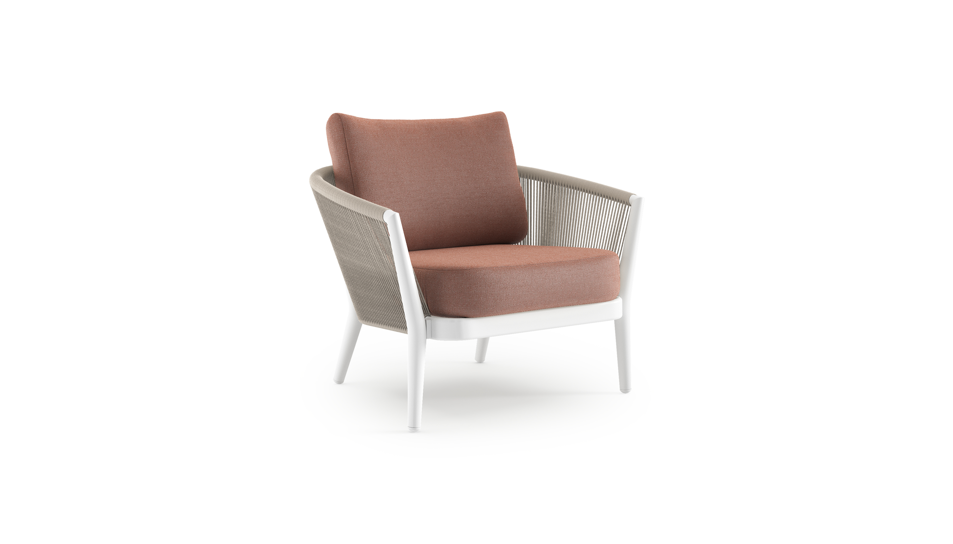 Fauteuil de jardin Orso en aluminium blanc en corde ronde tissée verticalement beige et coussins en all weather sunbrella® luxe Savane Rust | Exterioo mobilier de jardin