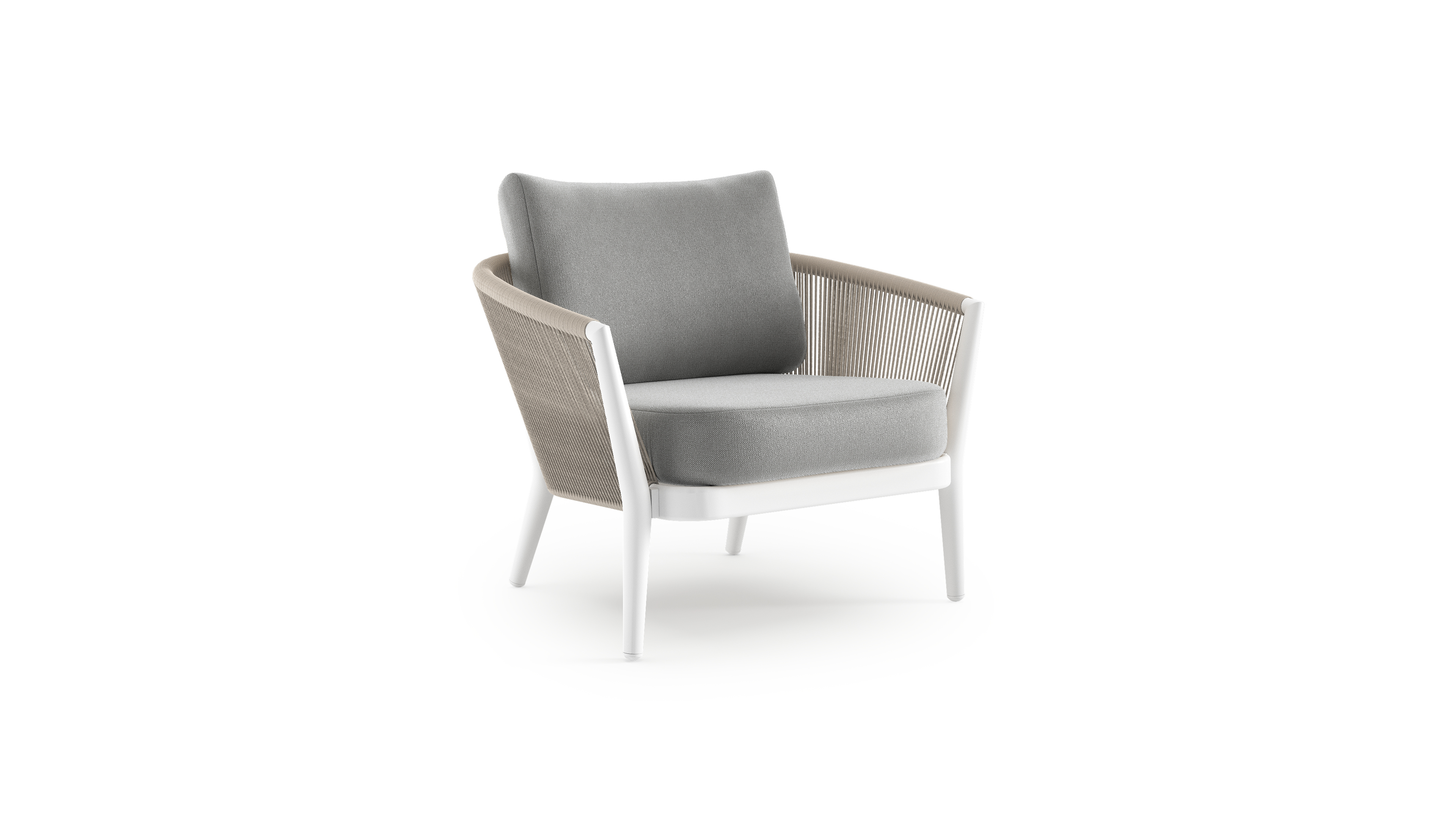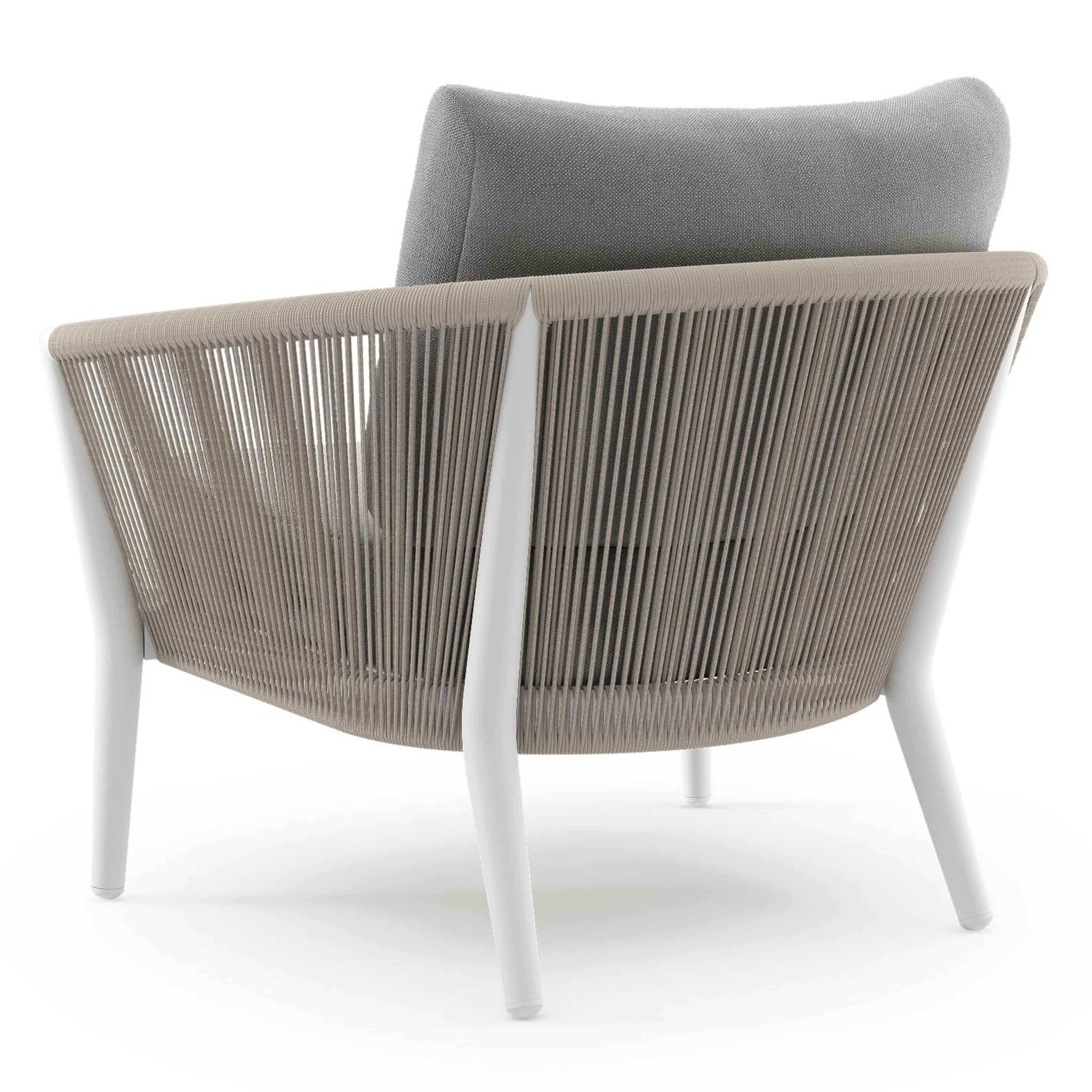 Fauteuil de jardin Orso en aluminium blanc en corde ronde tissée verticalement beige et coussins en all weather sunbrella® luxe Savane Grey | Exterioo mobilier de jardin