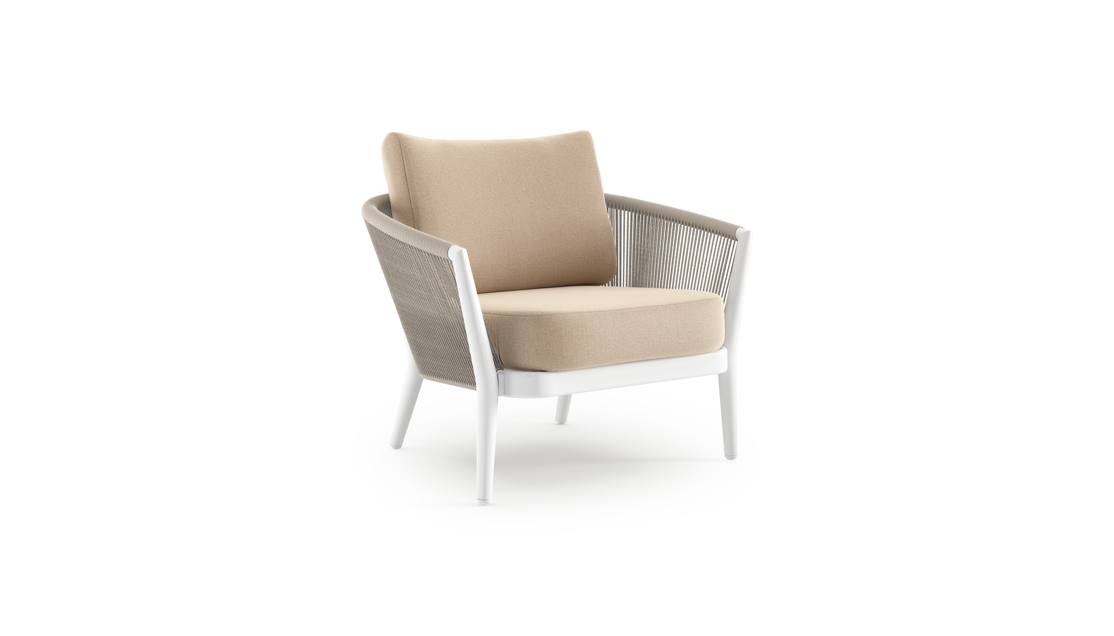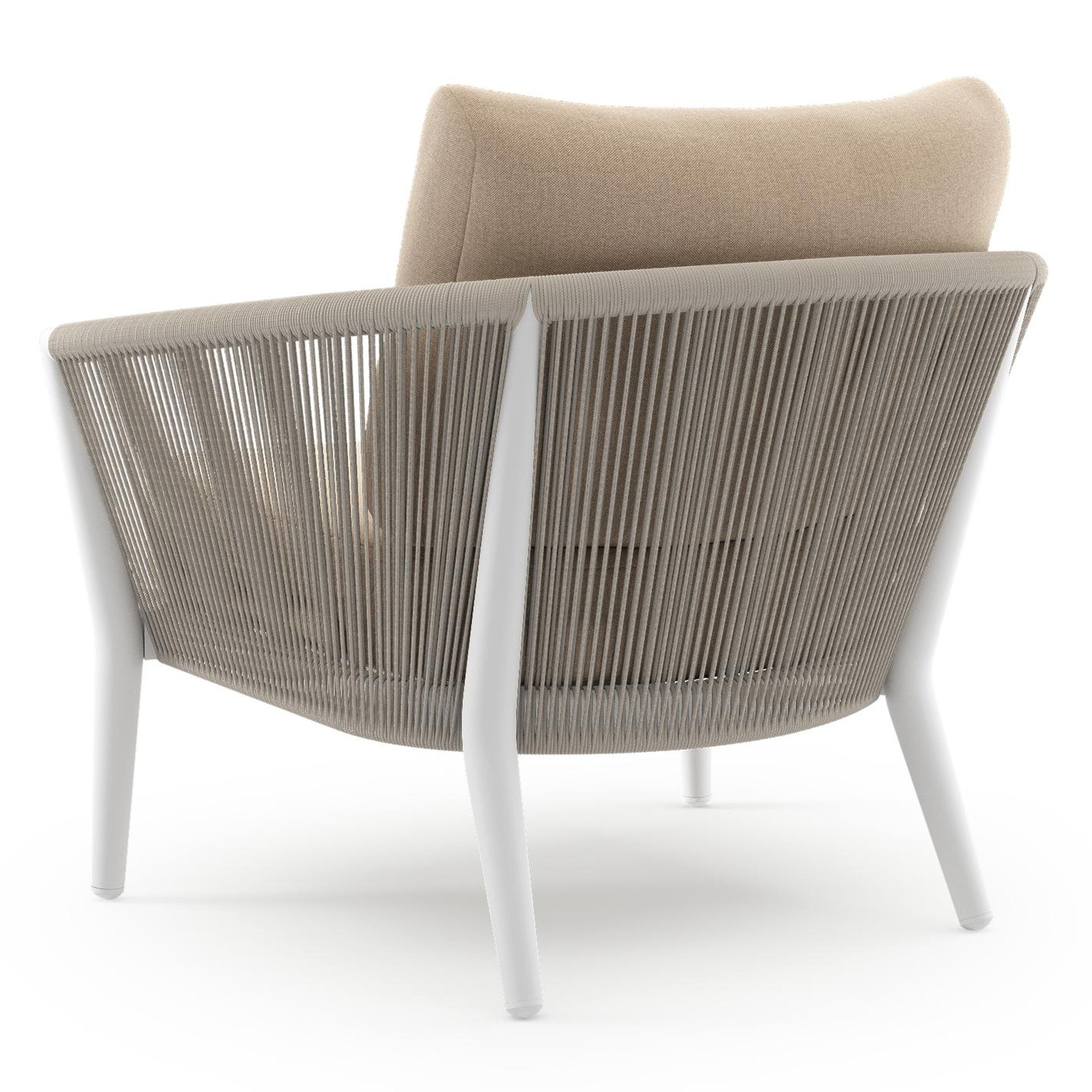 Fauteuil de jardin Orso en aluminium blanc en corde ronde tissée verticalement beige et coussins en all weather sunbrella® luxe Natte Heather Beige | Exterioo mobilier de jardin