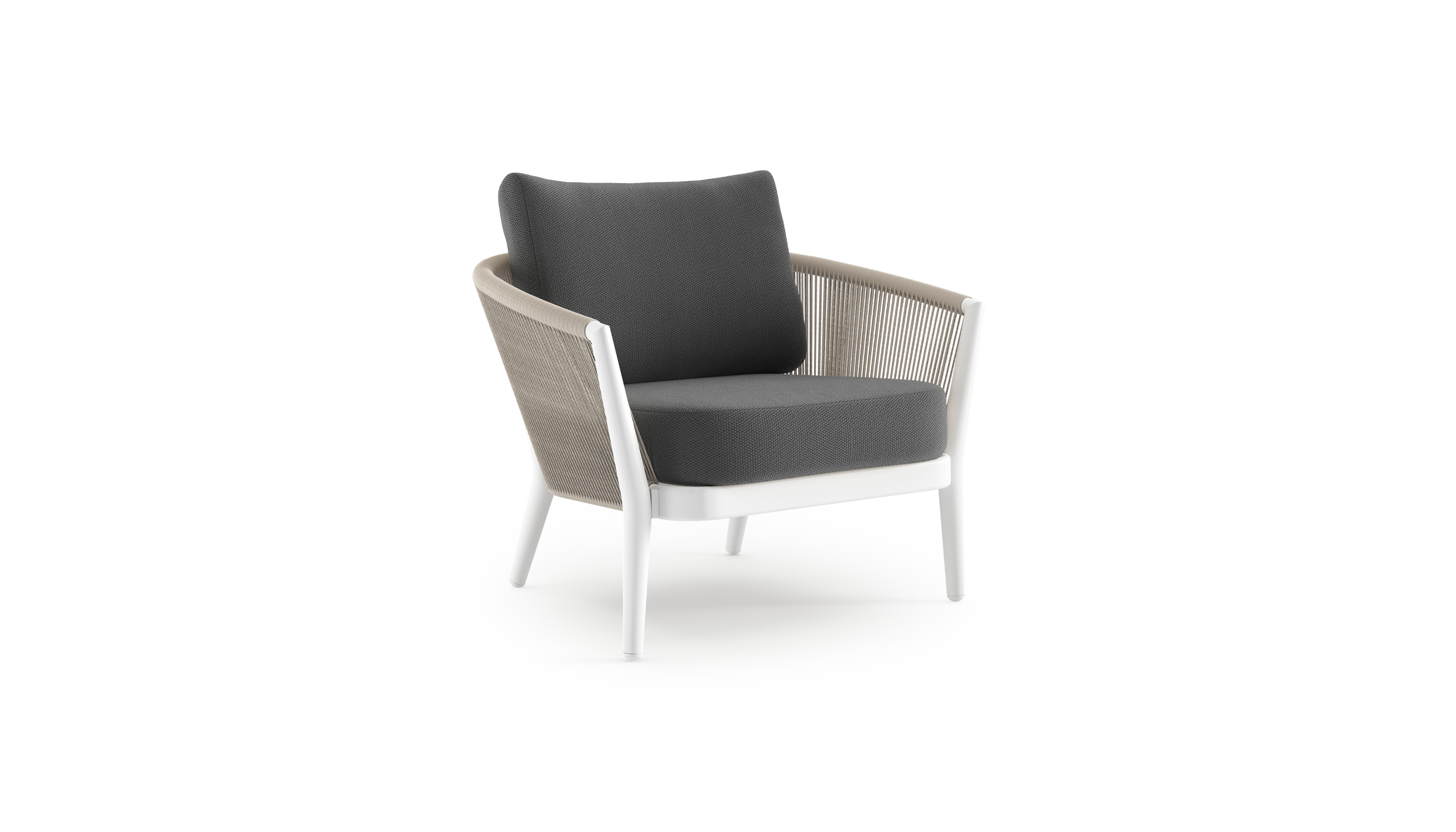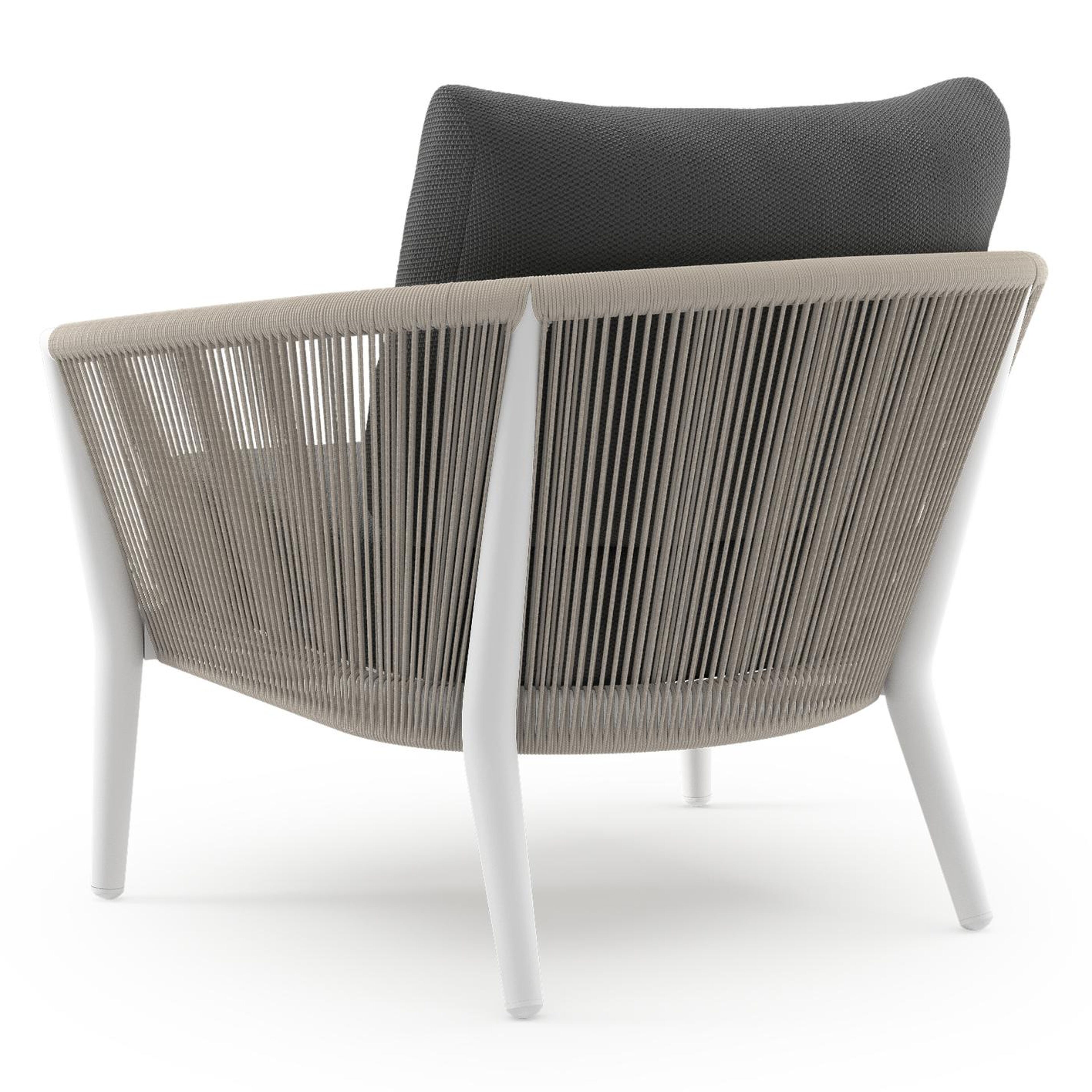 Fauteuil de jardin Orso en aluminium blanc en corde ronde tissée verticalement beige et coussins en all weather sunbrella® luxe Lopi Shadow | Exterioo mobilier de jardin