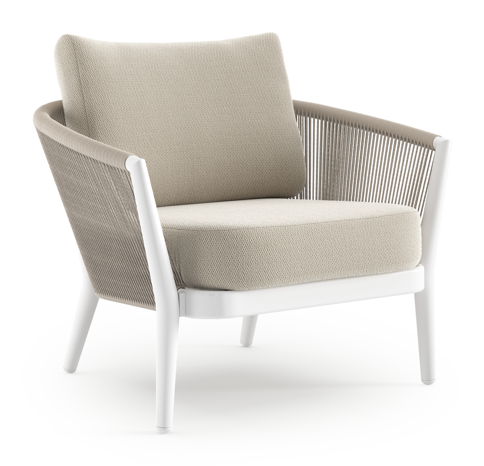 Fauteuil de jardin Orso en aluminium blanc en corde ronde tissée verticalement beige et coussins en all weather sunbrella® luxe Lopi Marble | Exterioo mobilier de jardin
