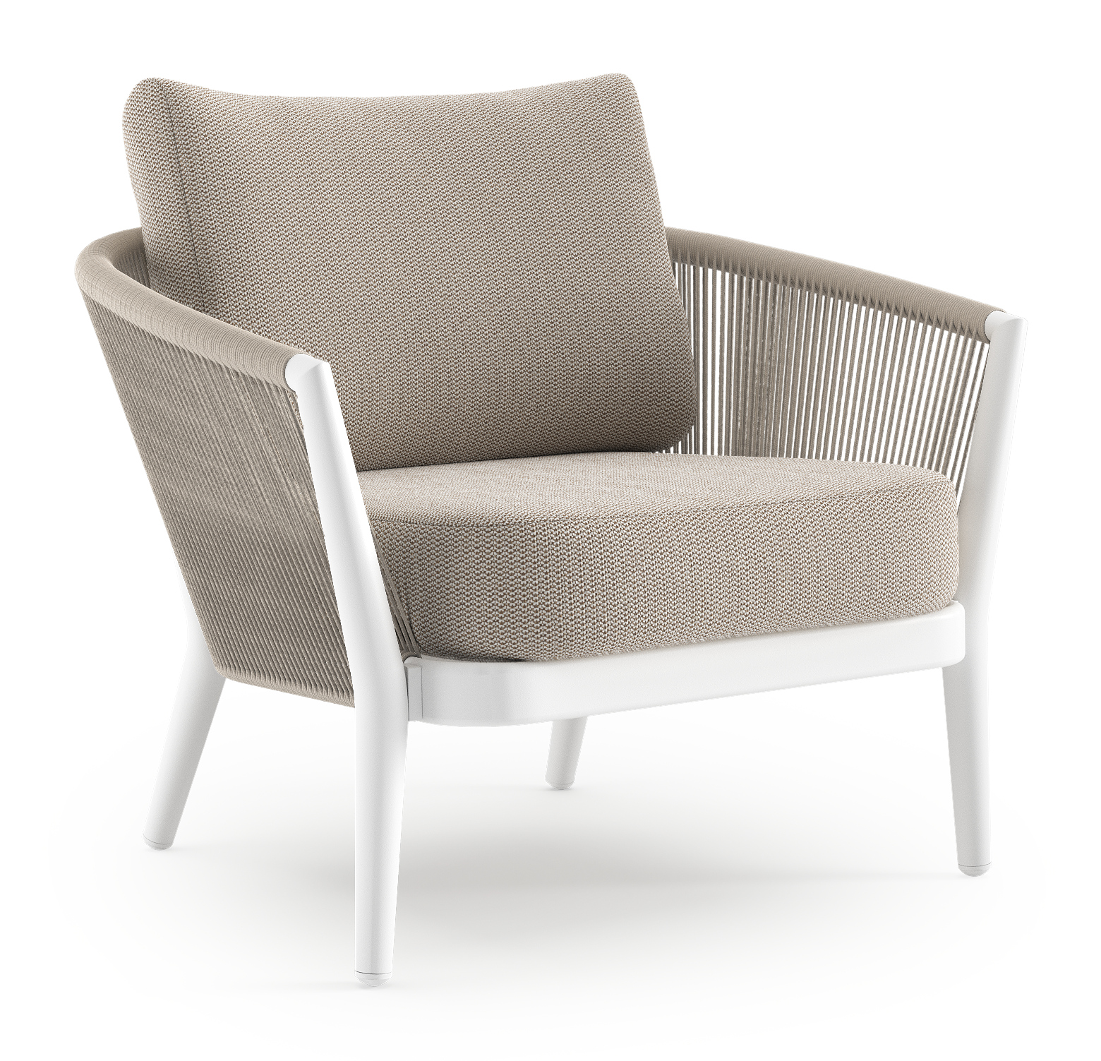 Fauteuil de jardin Orso en aluminium blanc en corde ronde tissée verticalement beige et coussins en all weather sunbrella® luxe Lopi Fossil | Exterioo mobilier de jardin
