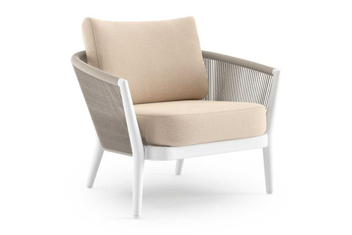 Fauteuil de jardin Orso en aluminium blanc en corde ronde tissée verticalement beige et coussins en all weather sunbrella® luxe Heritage Papyrus | Exterioo