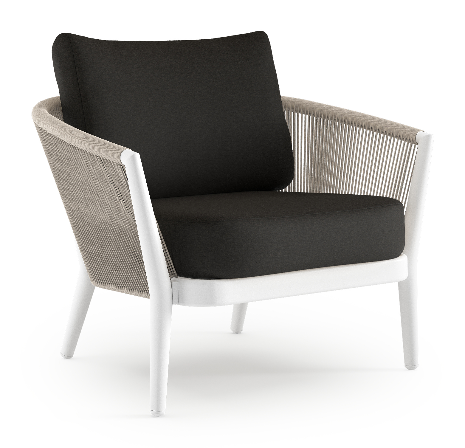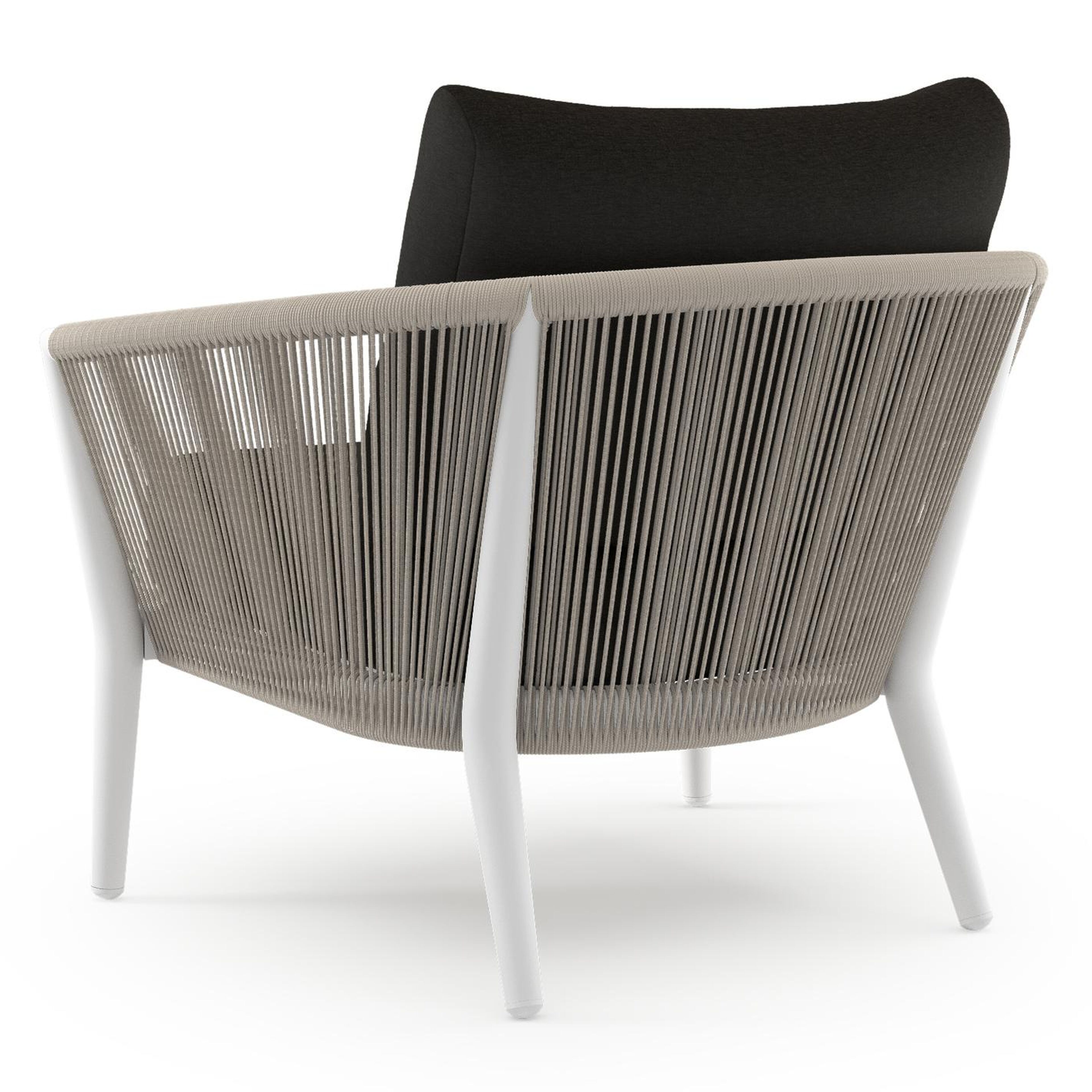 Fauteuil de jardin Orso en aluminium blanc en corde ronde tissée verticalement beige et coussins en all weather sunbrella® luxe Heritage char | Exterioo mobilier de jardin
