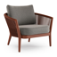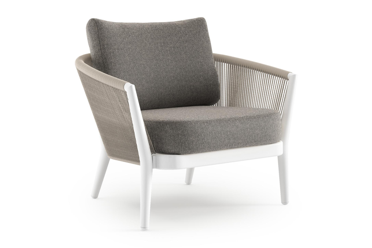 Fauteuil de jardin Orso en aluminium blanc en corde ronde tissée verticalement beige et coussins en all weather sunbrella® luxe Chartres Drizzle | Exterioo