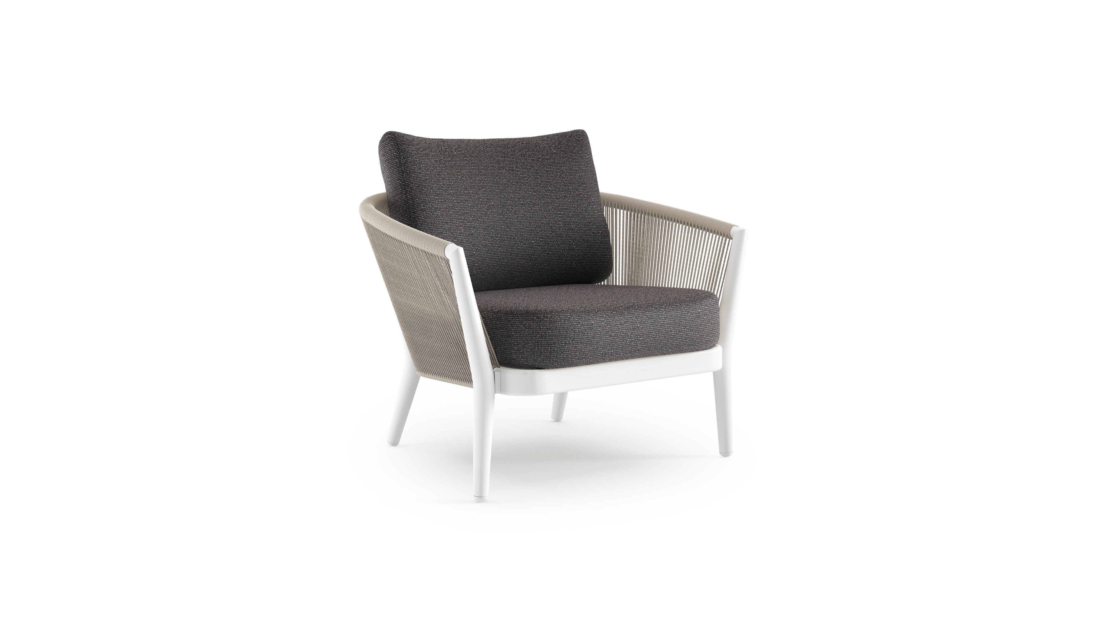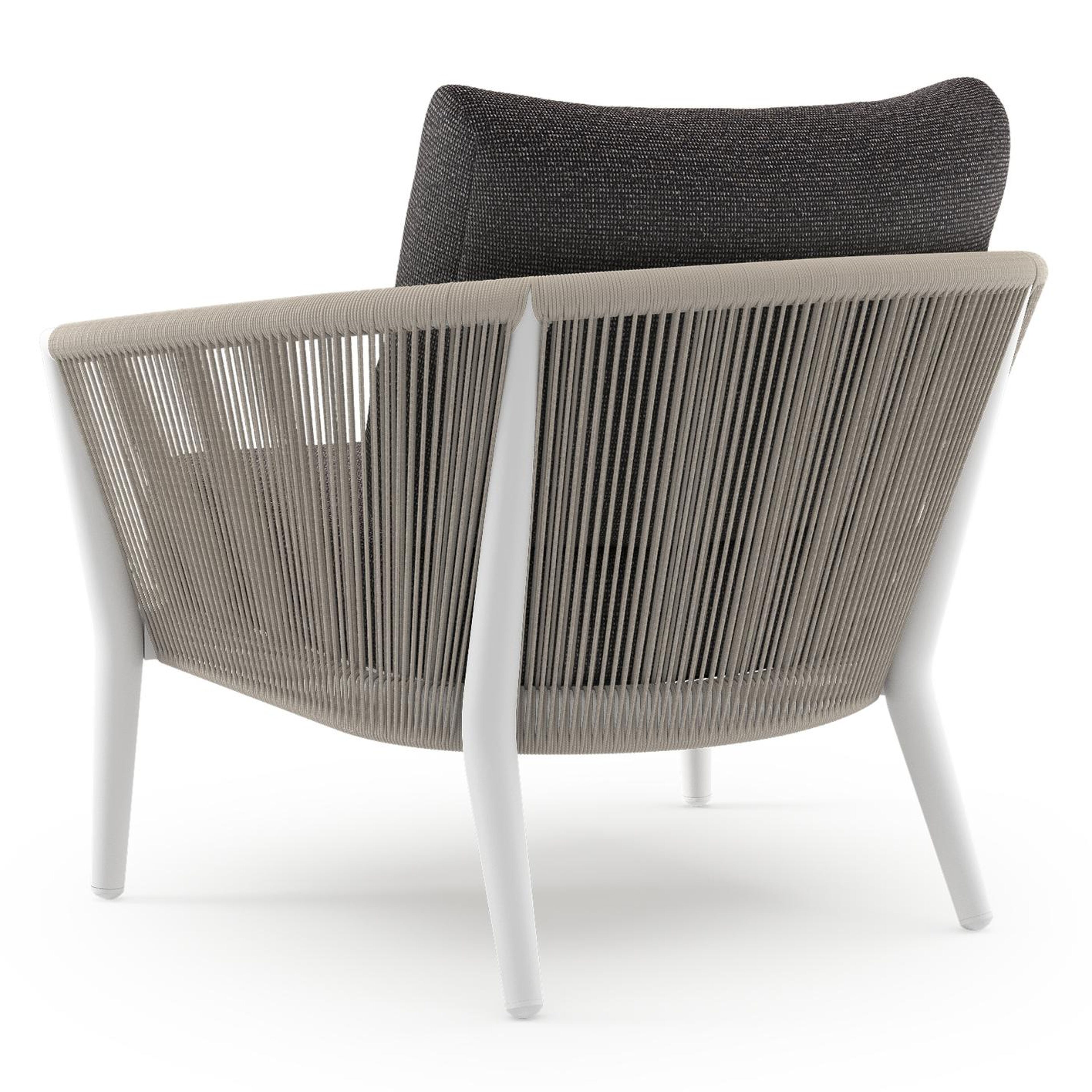 Fauteuil de jardin Orso en aluminium blanc en corde ronde tissée verticalement beige et coussins en all weather solica Firenze Tunder | Exterioo mobilier de jardin