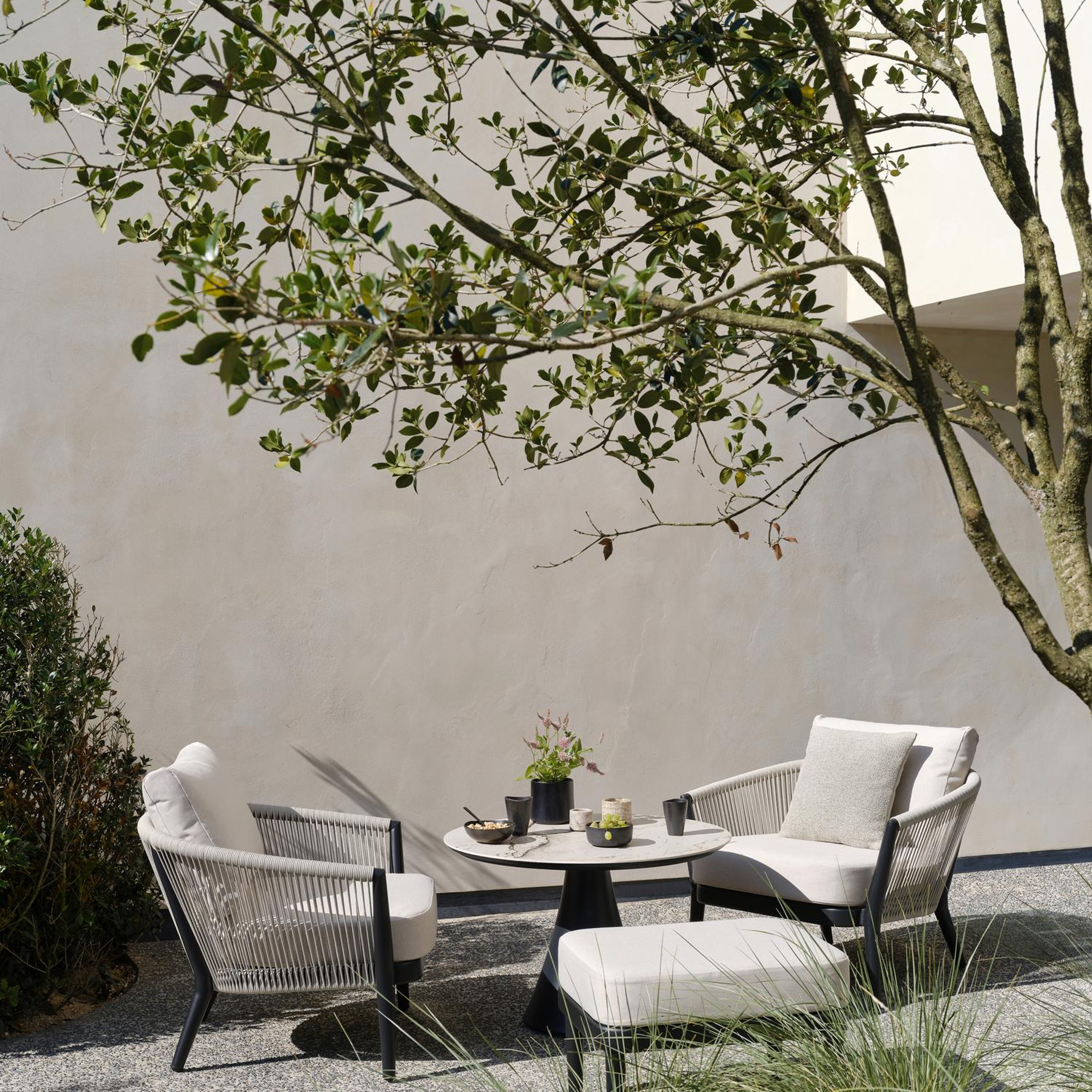 Fauteuil de jardin Orso en aluminium noir en corde ronde tissée verticalement beige et coussins en all weather sunbrella® luxe Lopi Fossil | Exterioo mobilier de jardin
