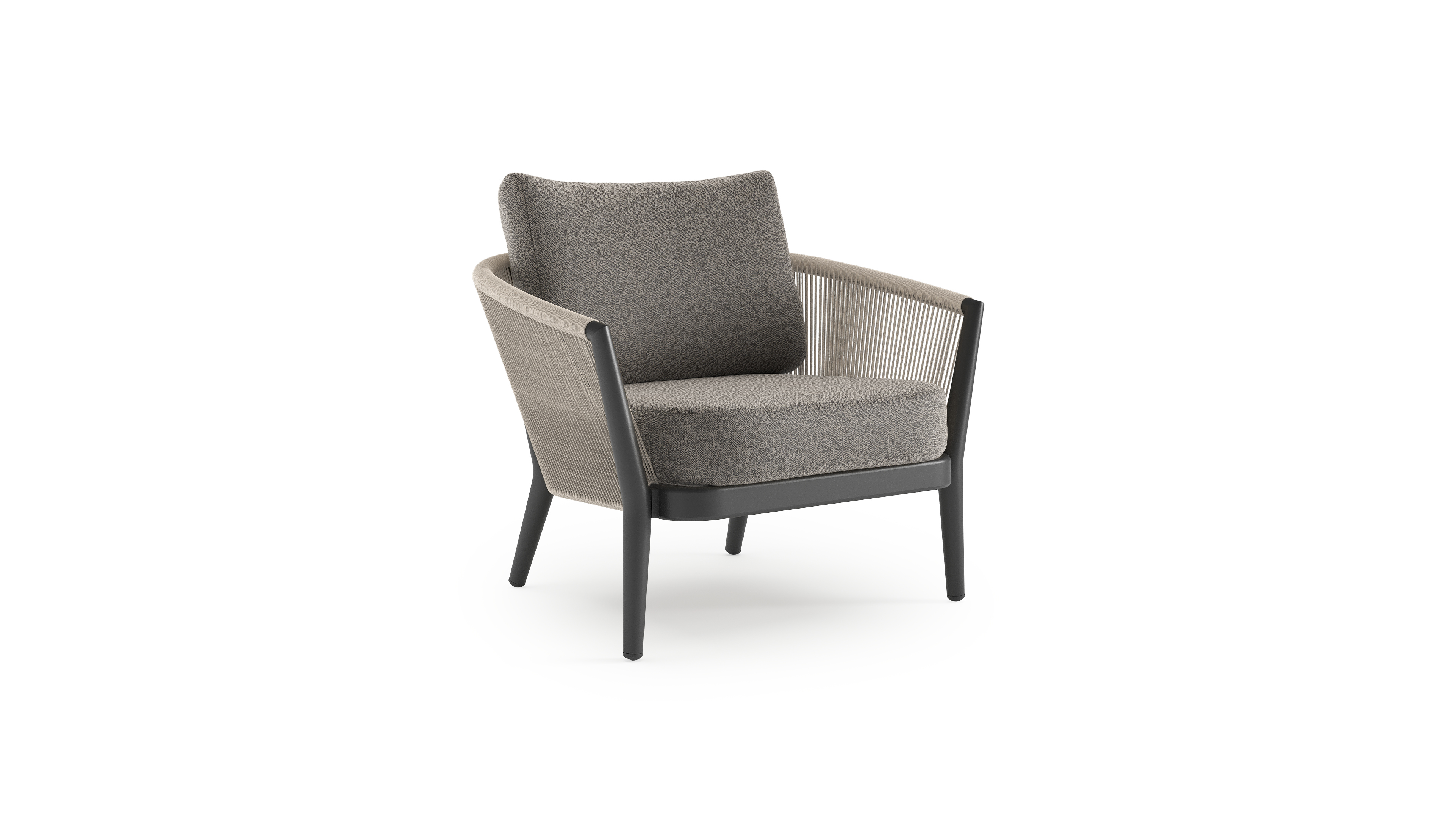 Fauteuil de jardin Orso en aluminium noir en corde ronde tissée verticalement beige et coussins en all weather sunbrella® luxe Chartres Drizzle | Exterioo mobilier de jardin