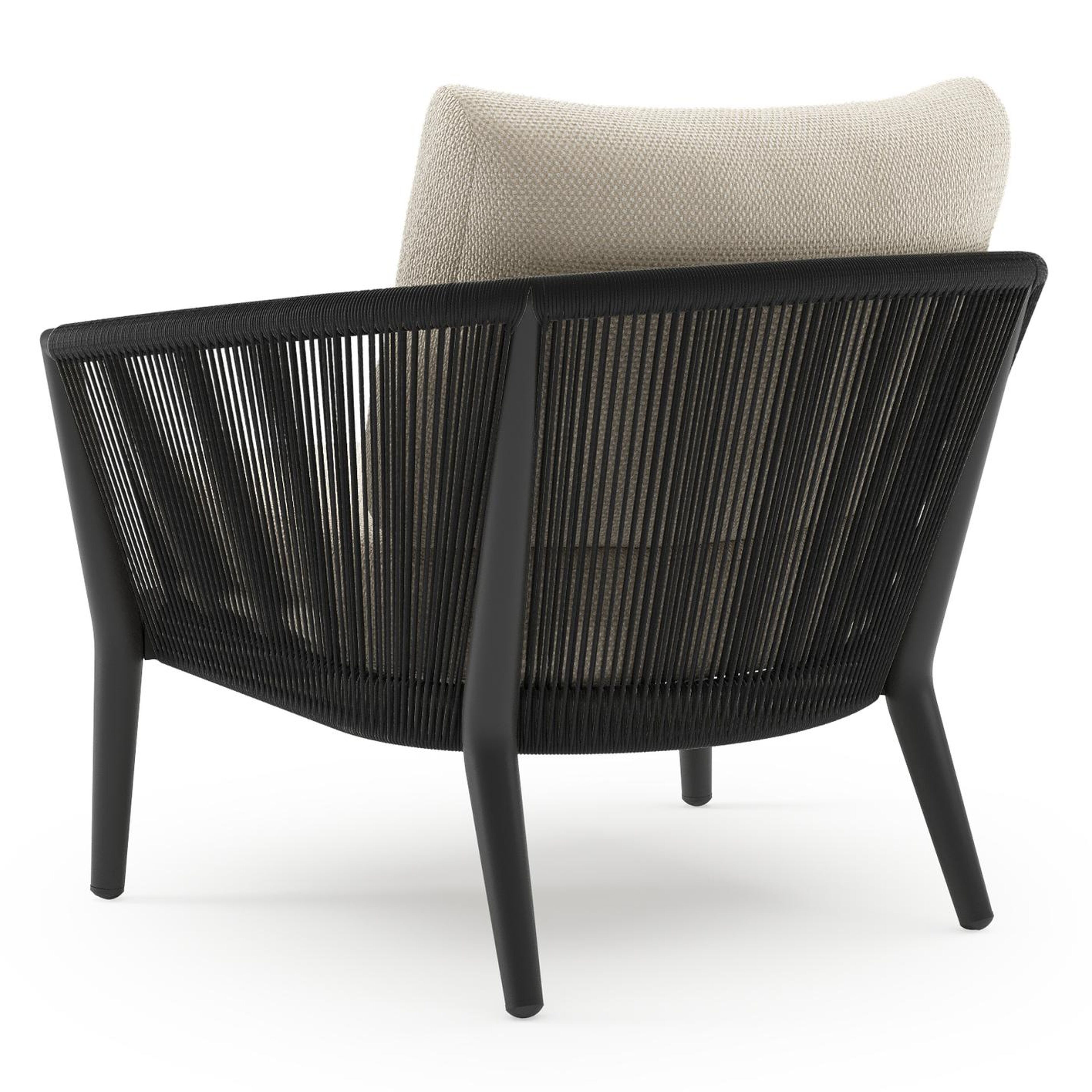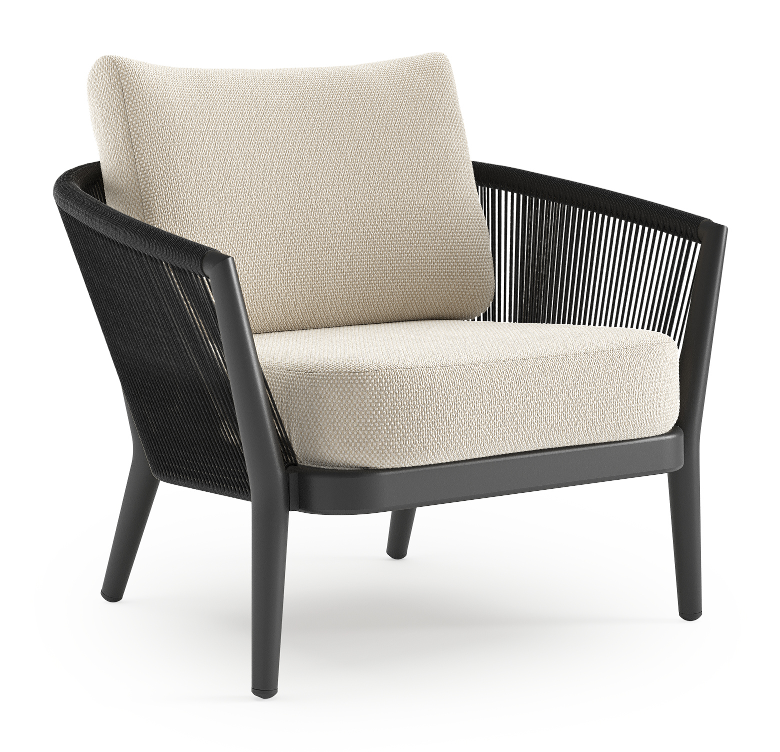 Fauteuil de jardin Orso en aluminium noir en corde ronde tissée verticalement noir et coussins en all weather cosytica Althea Off White | Exterioo mobilier de jardin