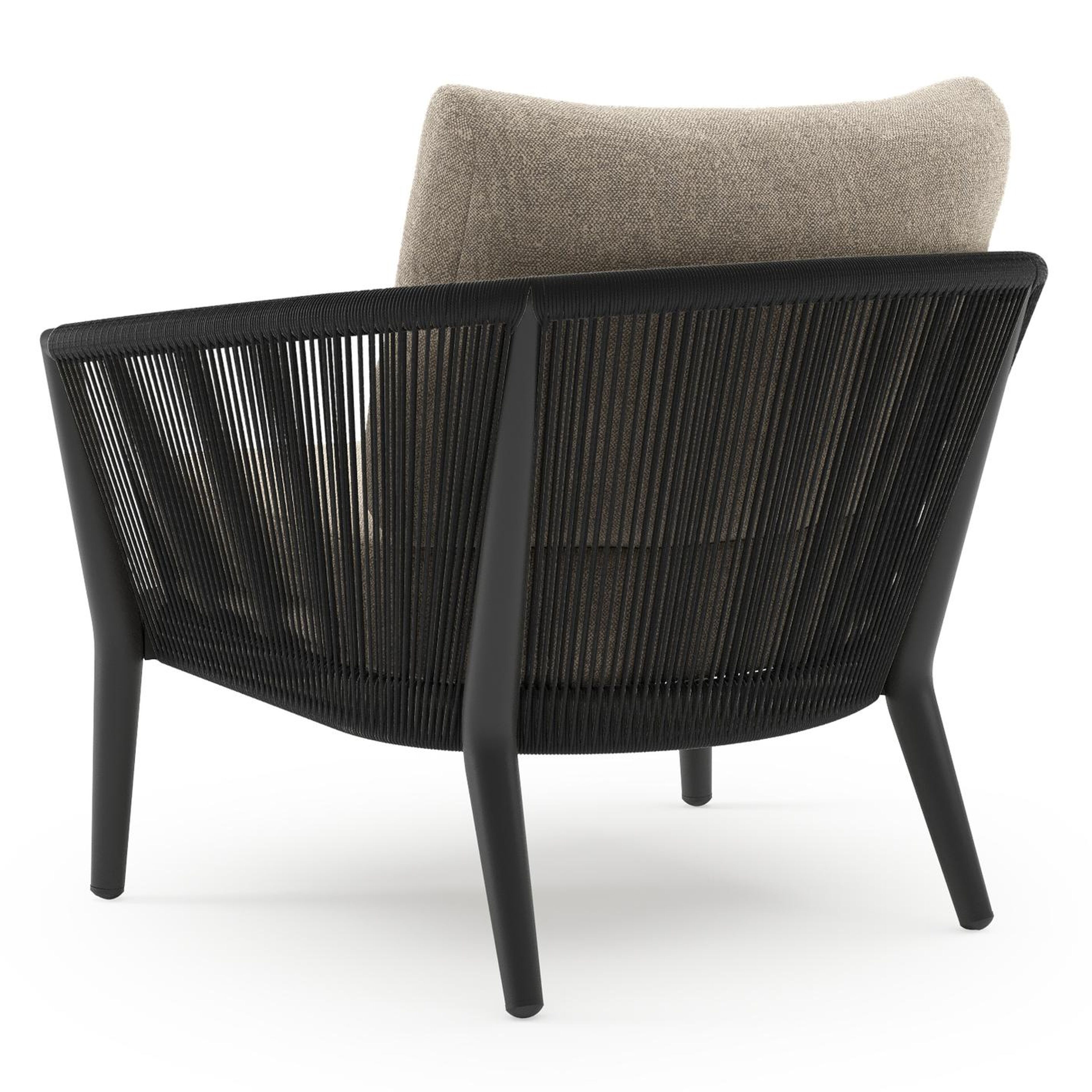 Fauteuil de jardin Orso en aluminium noir en corde ronde tissée verticalement noir et coussins en all weather sunbrella® luxe Chartres Pewter | Exterioo mobilier de jardin