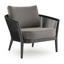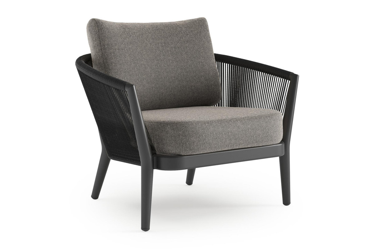 Fauteuil de jardin Orso en aluminium noir en corde ronde tissée verticalement noir et coussins en all weather sunbrella® luxe Chartres Drizzle | Exterioo