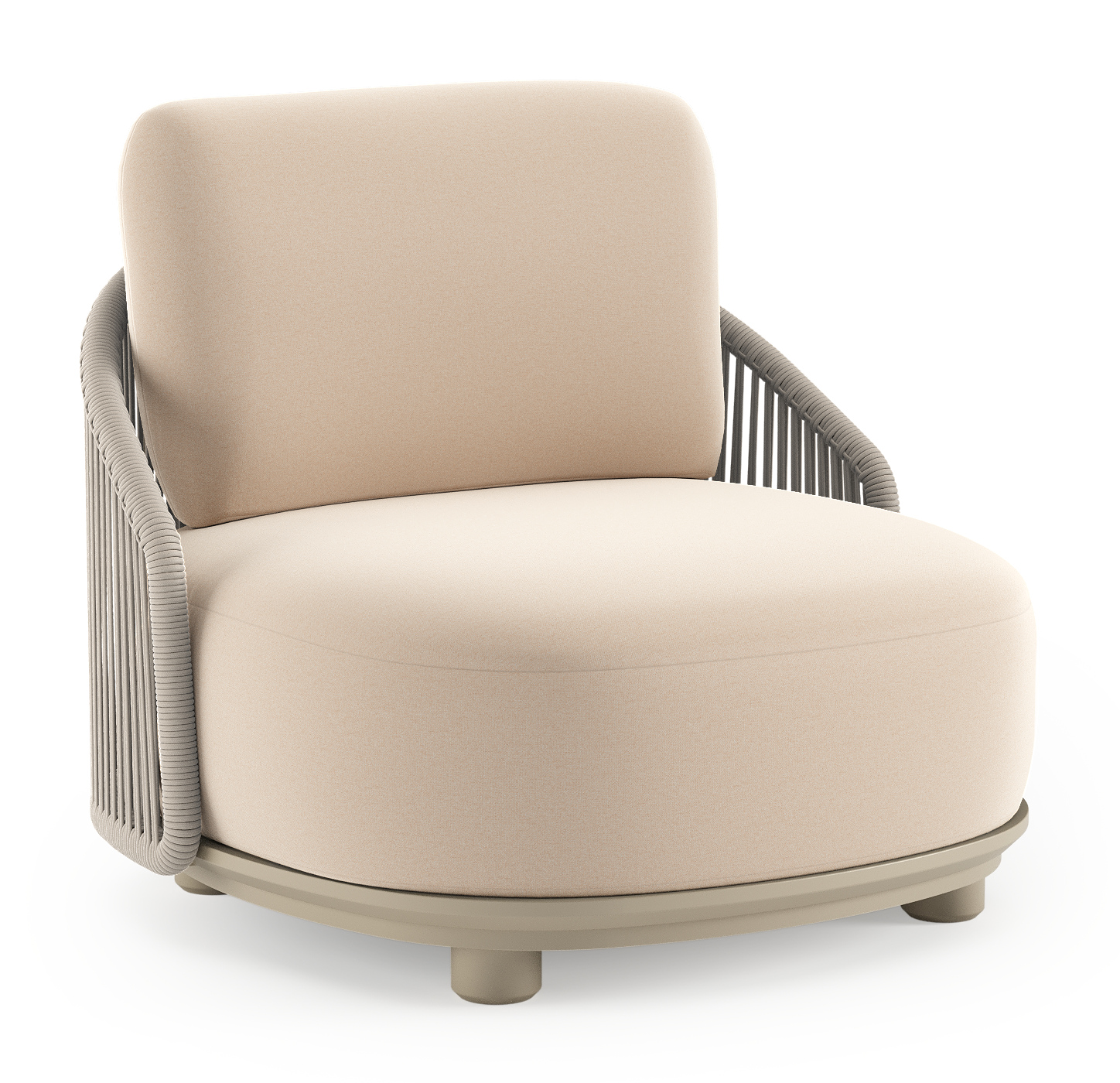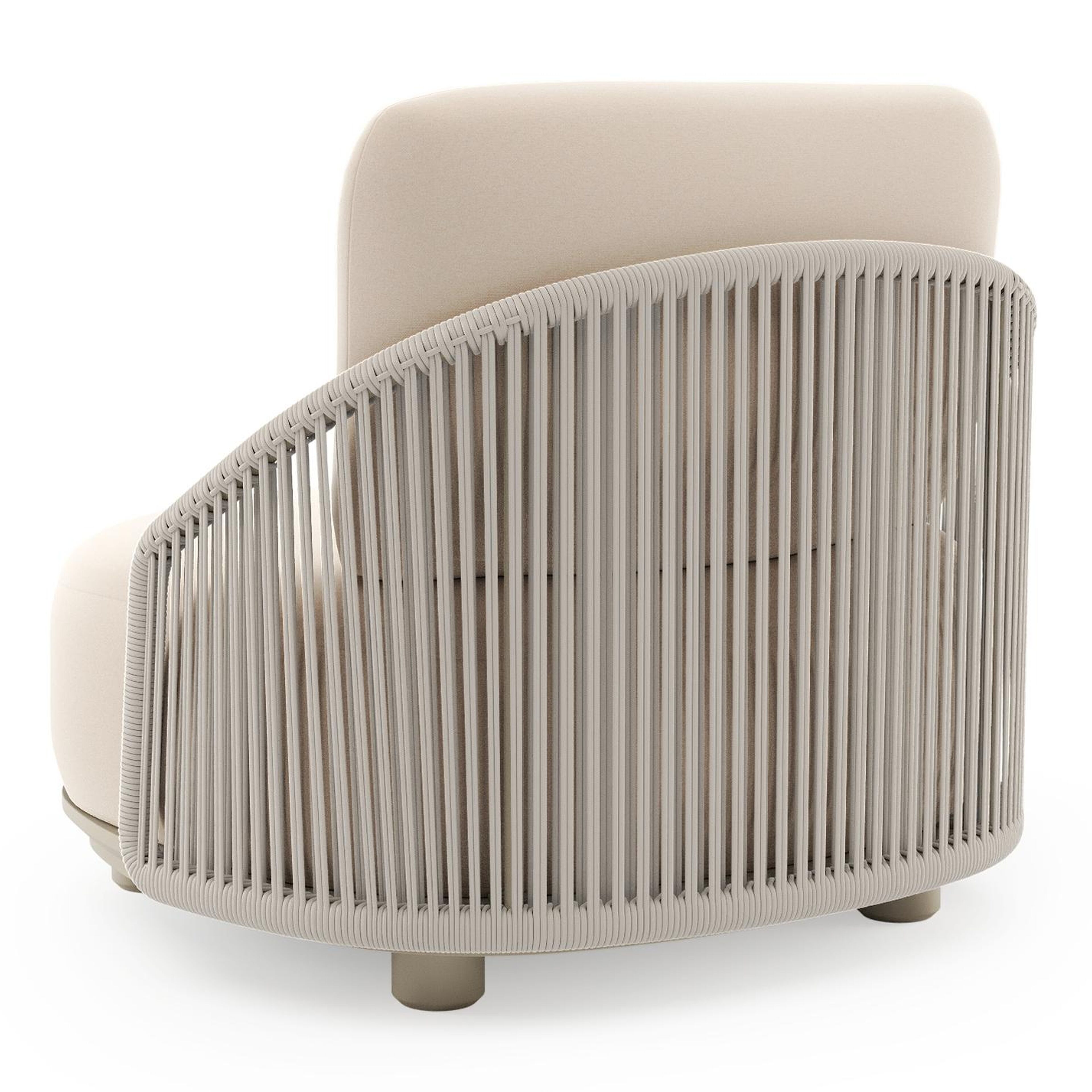 Fauteuil de jardin Vadelo en aluminium beige et corde ronde tissée verticalement beige et coussins en all weather sunbrella® luxe natte linen chalk | Exterioo mobilier de jardin