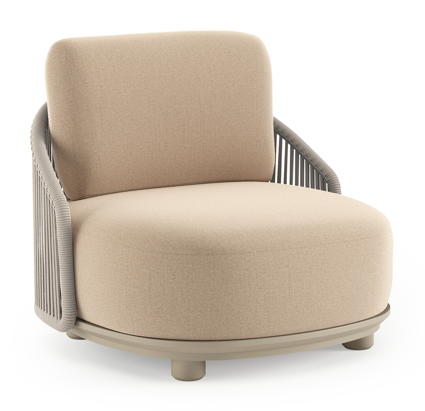 Fauteuil de jardin Vadelo en aluminium beige et corde ronde tissée verticalement beige et coussins en all weather sunbrella® luxe natte heather beige | Exterioo mobilier de jardin
