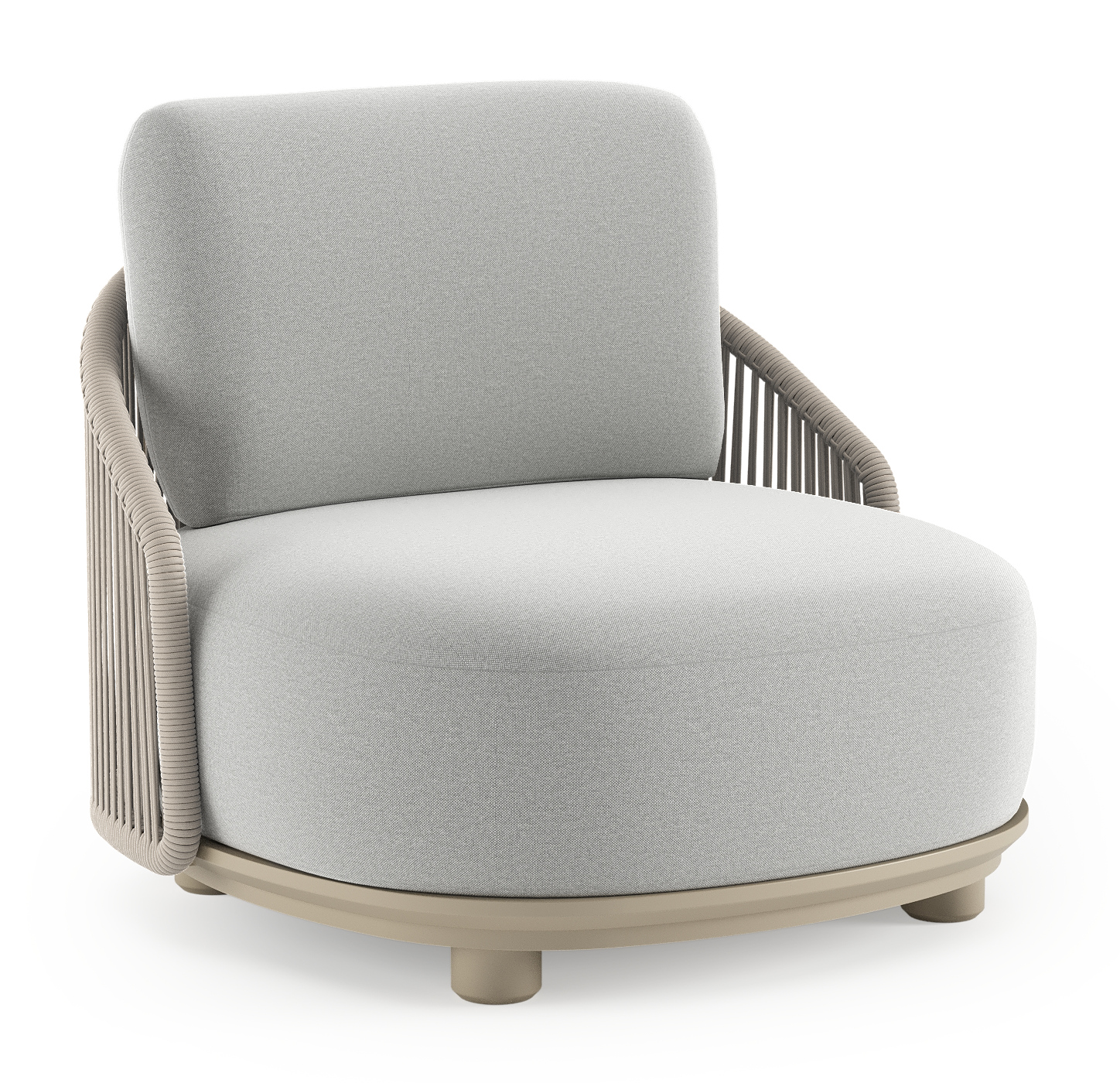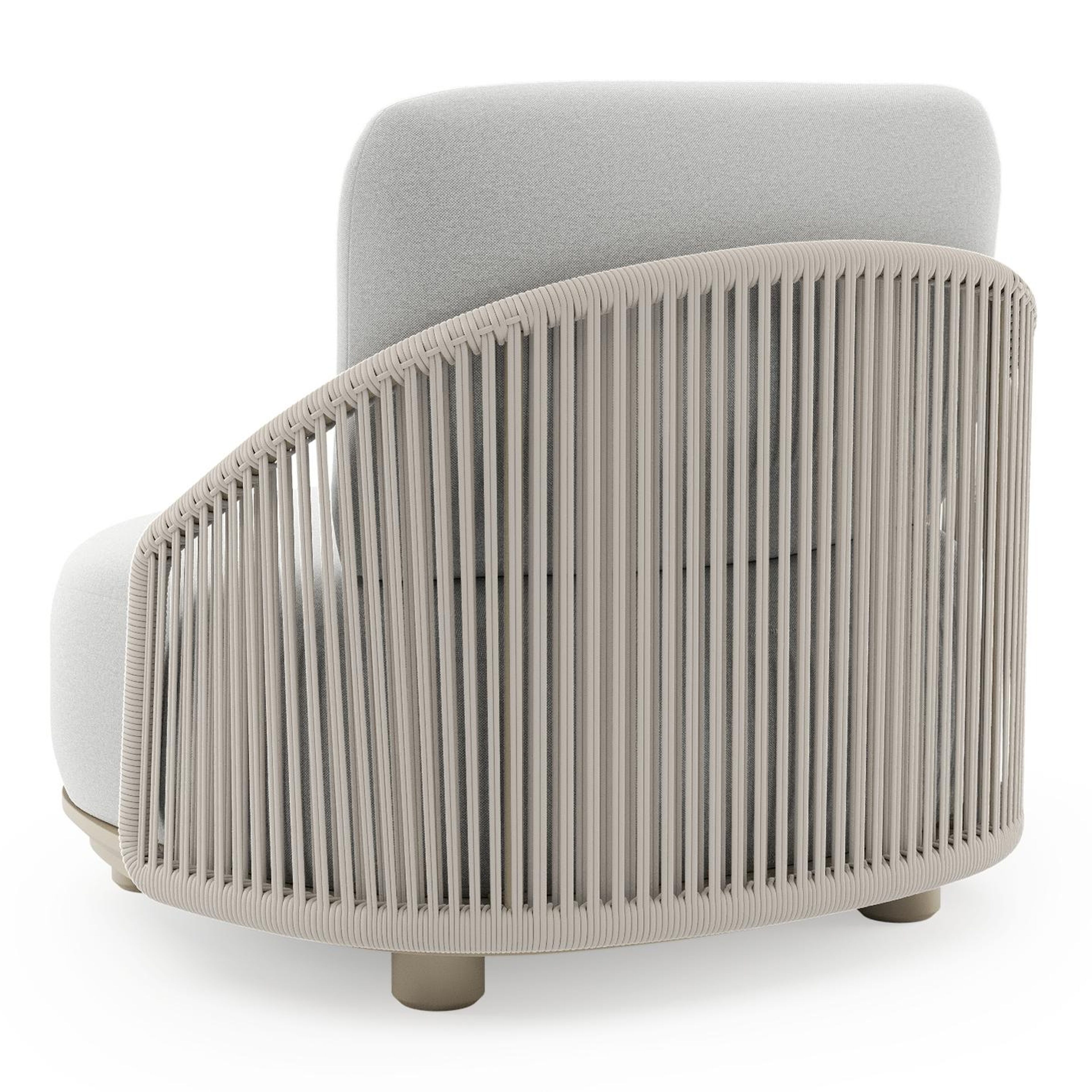 Fauteuil de jardin Vadelo en aluminium beige et corde ronde tissée verticalement beige et coussins en all weather sunbrella® luxe natte grey chine | Exterioo mobilier de jardin