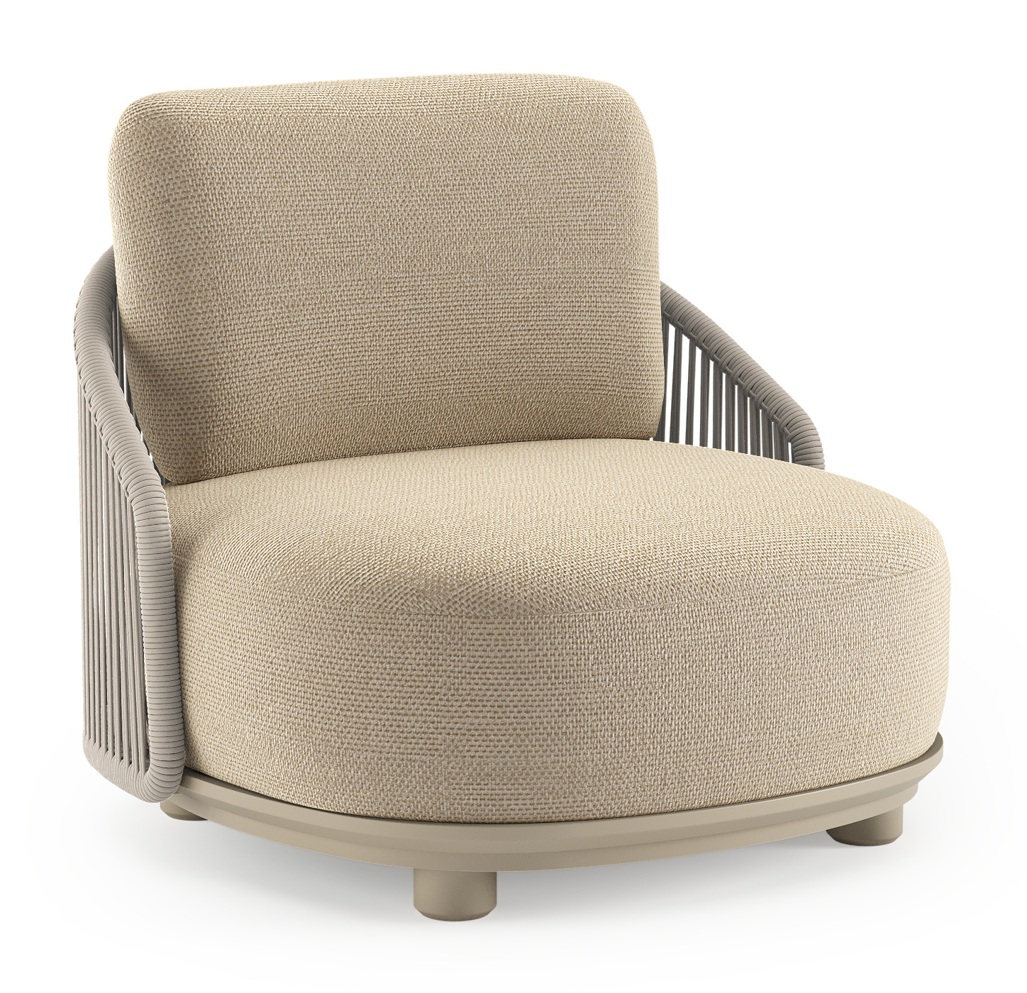 Fauteuil de jardin Vadelo en aluminium beige et corde ronde tissée verticalement beige et coussins en all weather cosytica althea camel | Exterioo mobilier de jardin