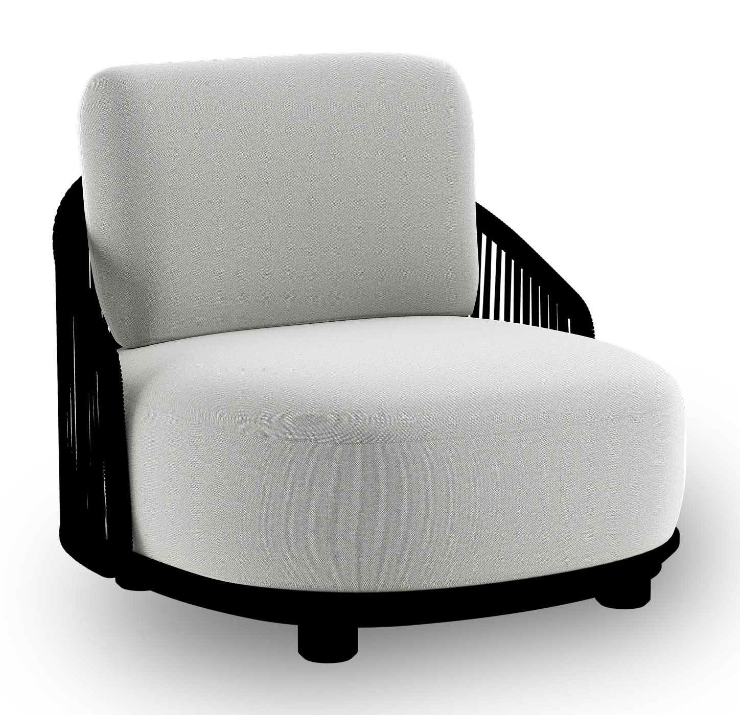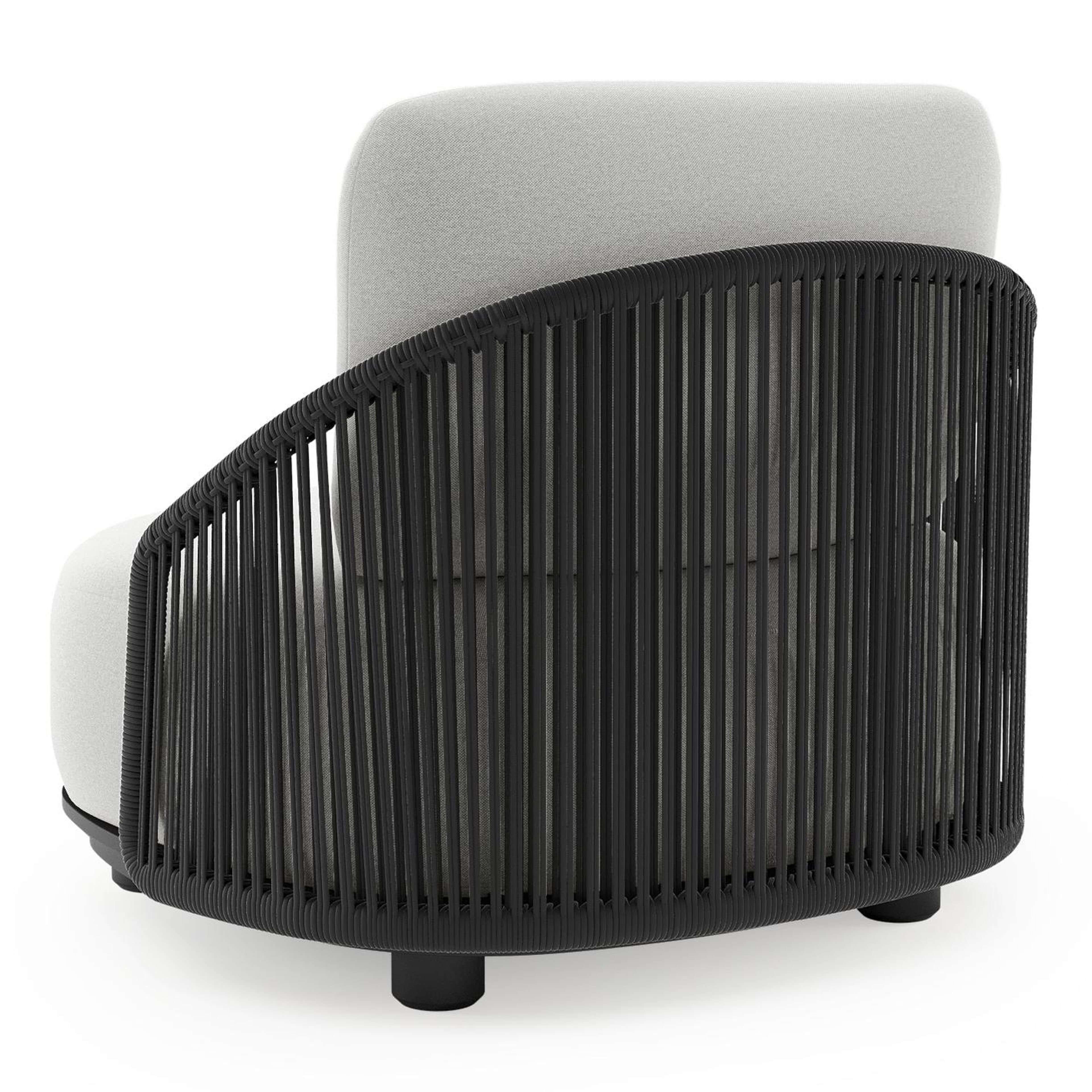 Fauteuil de jardin Vadelo en aluminium noir et corde ronde tissée verticalement noir et coussins en all weather sunbrella® luxe natte grey chine | Exterioo mobilier de jardin