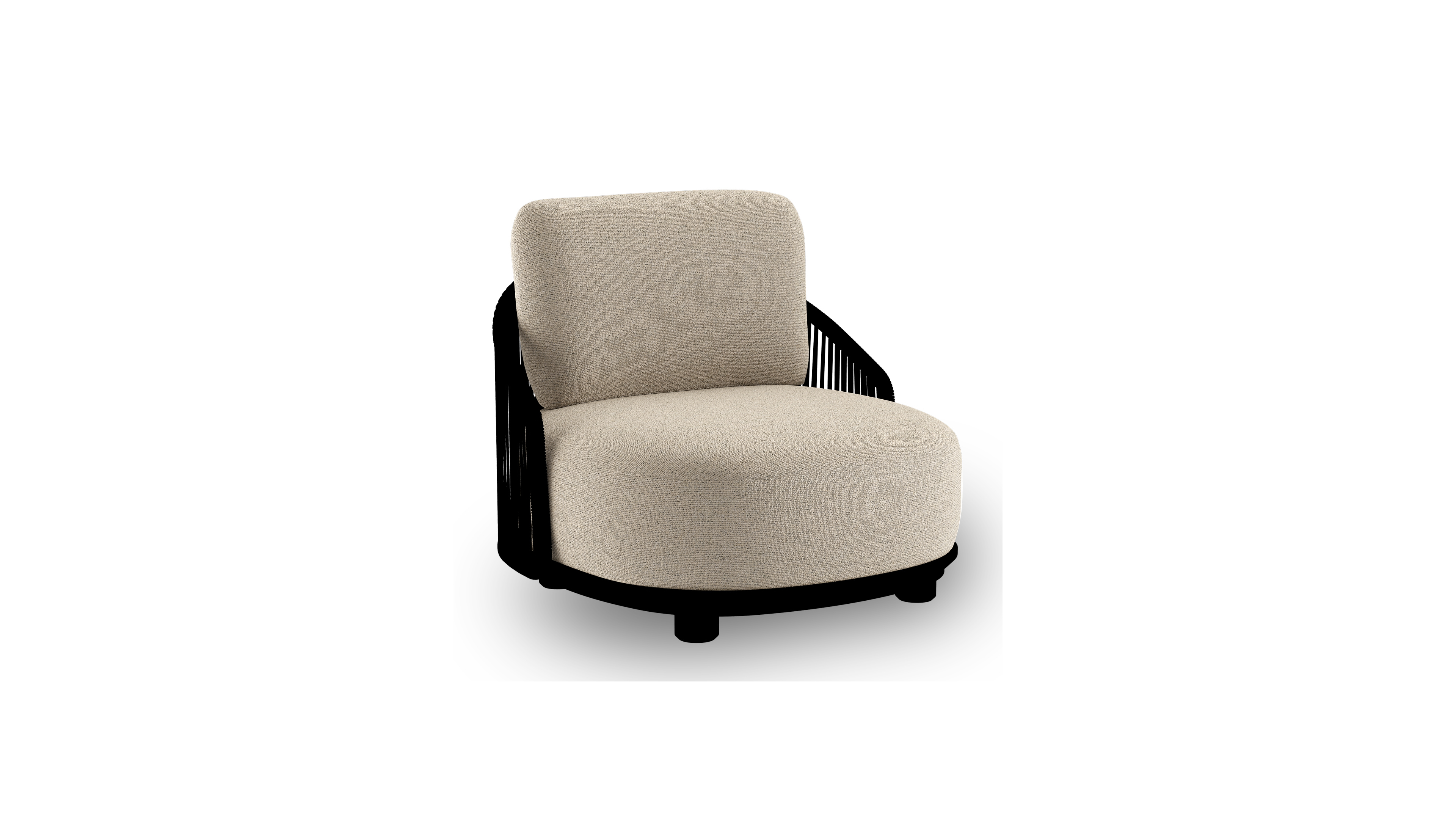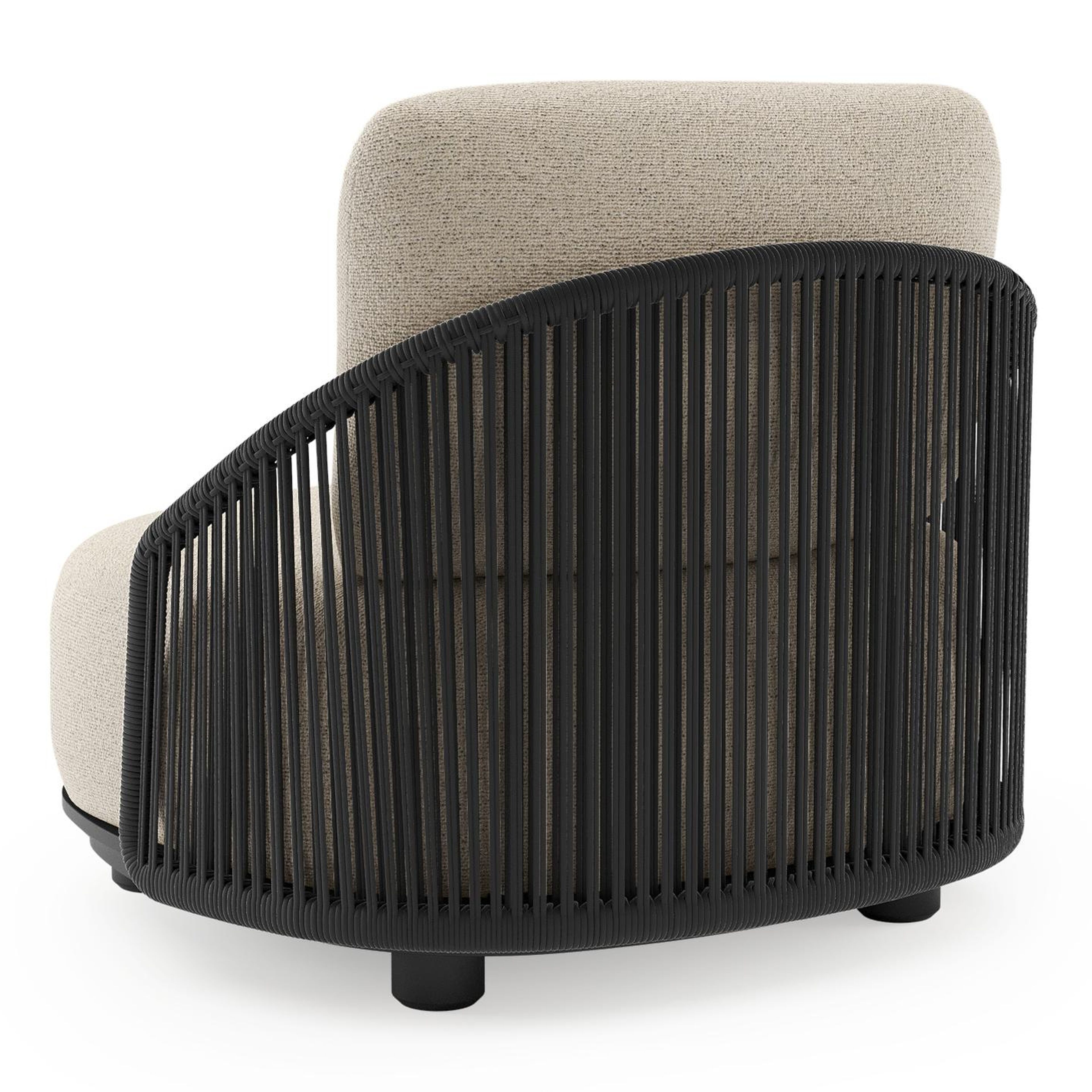 Fauteuil de jardin Vadelo en aluminium noir et corde ronde tissée verticalement noir et coussins en all weather cosytica marbella beige | Exterioo mobilier de jardin