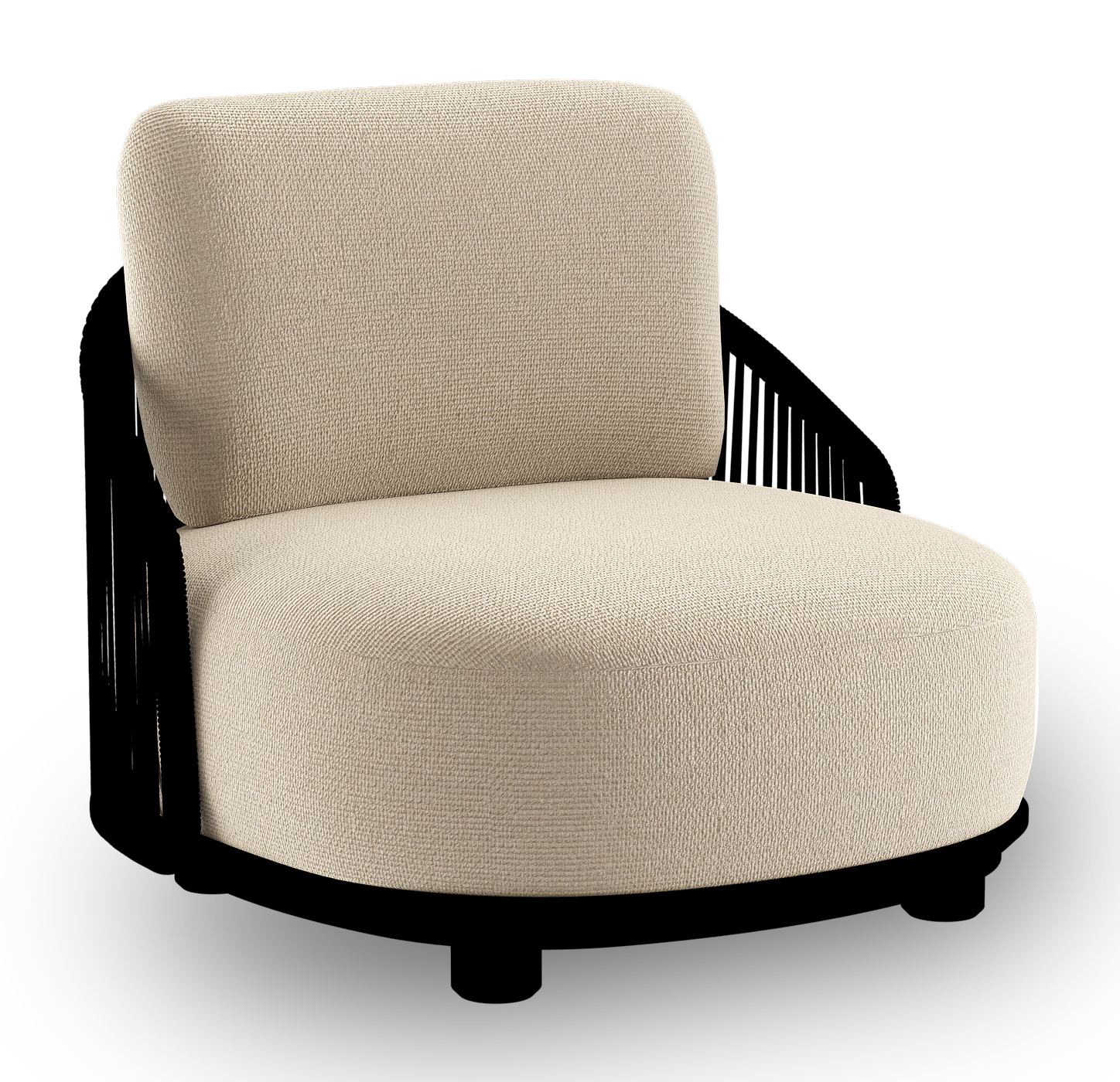 Fauteuil de jardin Vadelo en aluminium noir et corde ronde tissée verticalement noir et coussins en all weather cosytica althea chalk | Exterioo mobilier de jardin