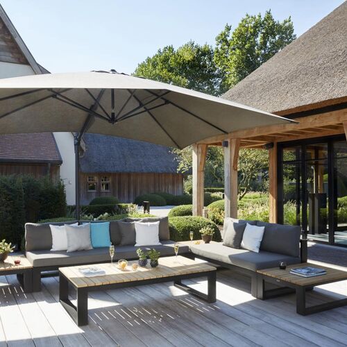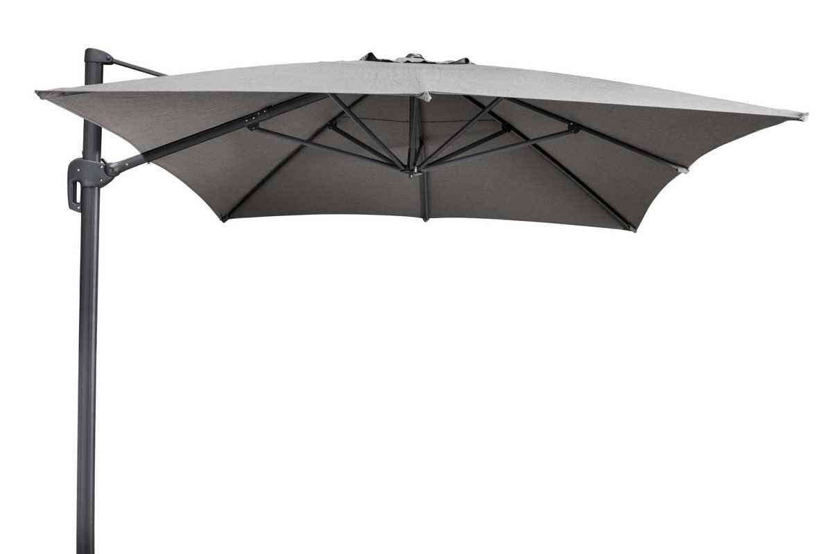 Parasol pendant de luxe avec mât et baleines en aluminium laqué à la poudre noir. Toile en tissu Sunbrella de qualité All Weather, pare-vent inclus. Couleur : Natte Dark Taupe. Ouverture très facile grâce à la manivelle. Le parasol est réglable en diverses positions et très compact grâce à la poignée. Pivote à 360° autour de son axe. Pied croisé inclus (dalles ou pied de parasol en option). Avec système de sécurité. Dimensions toile : L 3 x Lg 4 m. Housse de protection inclus.
