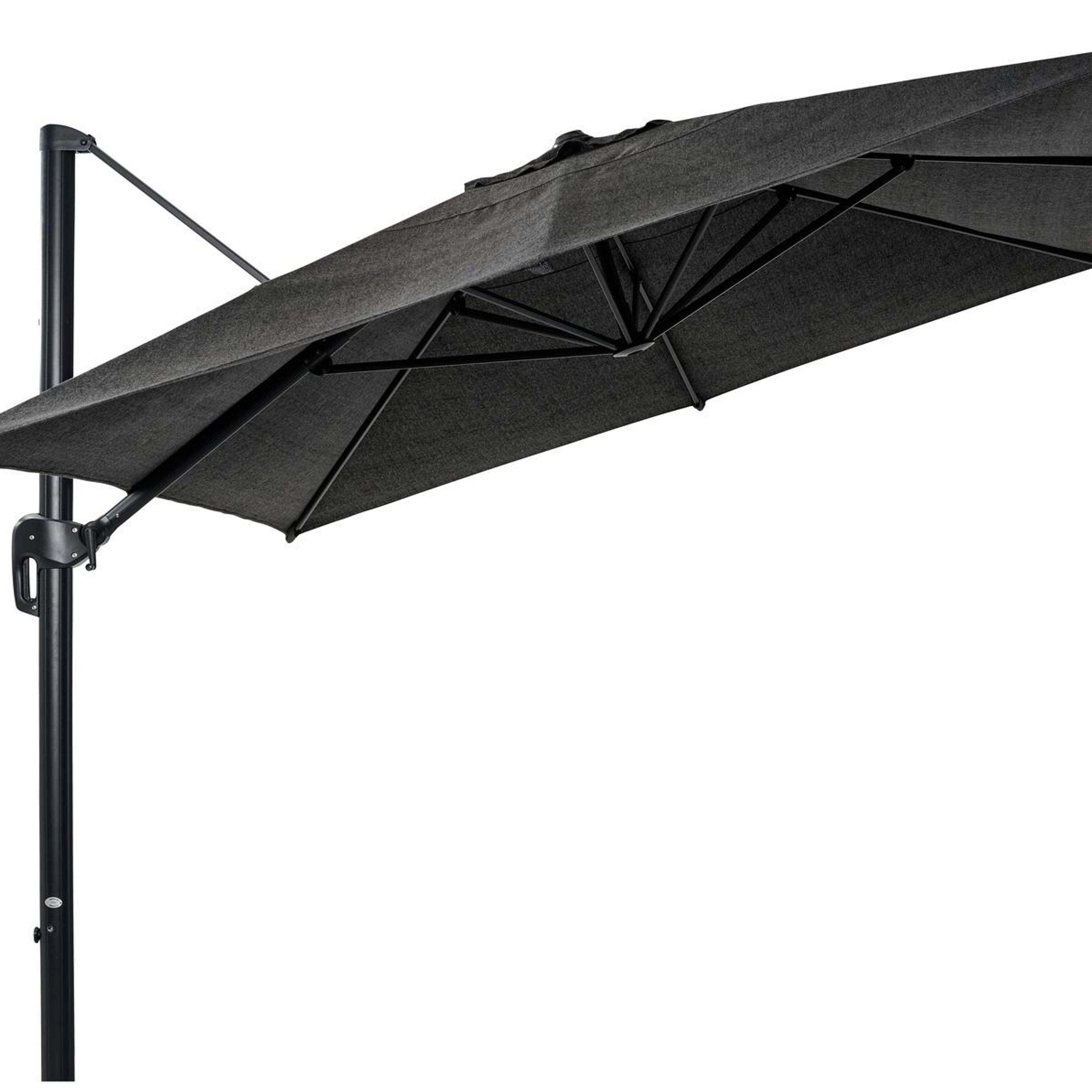 Le parasol pendant Rufina est un parasol très facile à utiliser. Grâce à son système pendant, le mât ne gêne pas l’espace sous le parasol. Il s’ouvre facilement à l’aide de la manivelle et est également réglable en hauteur. Le parasol Rufina dispose aussi d’une fonction d’inclinaison qui permet d’adapter facilement la position du parasol selon la position du soleil.