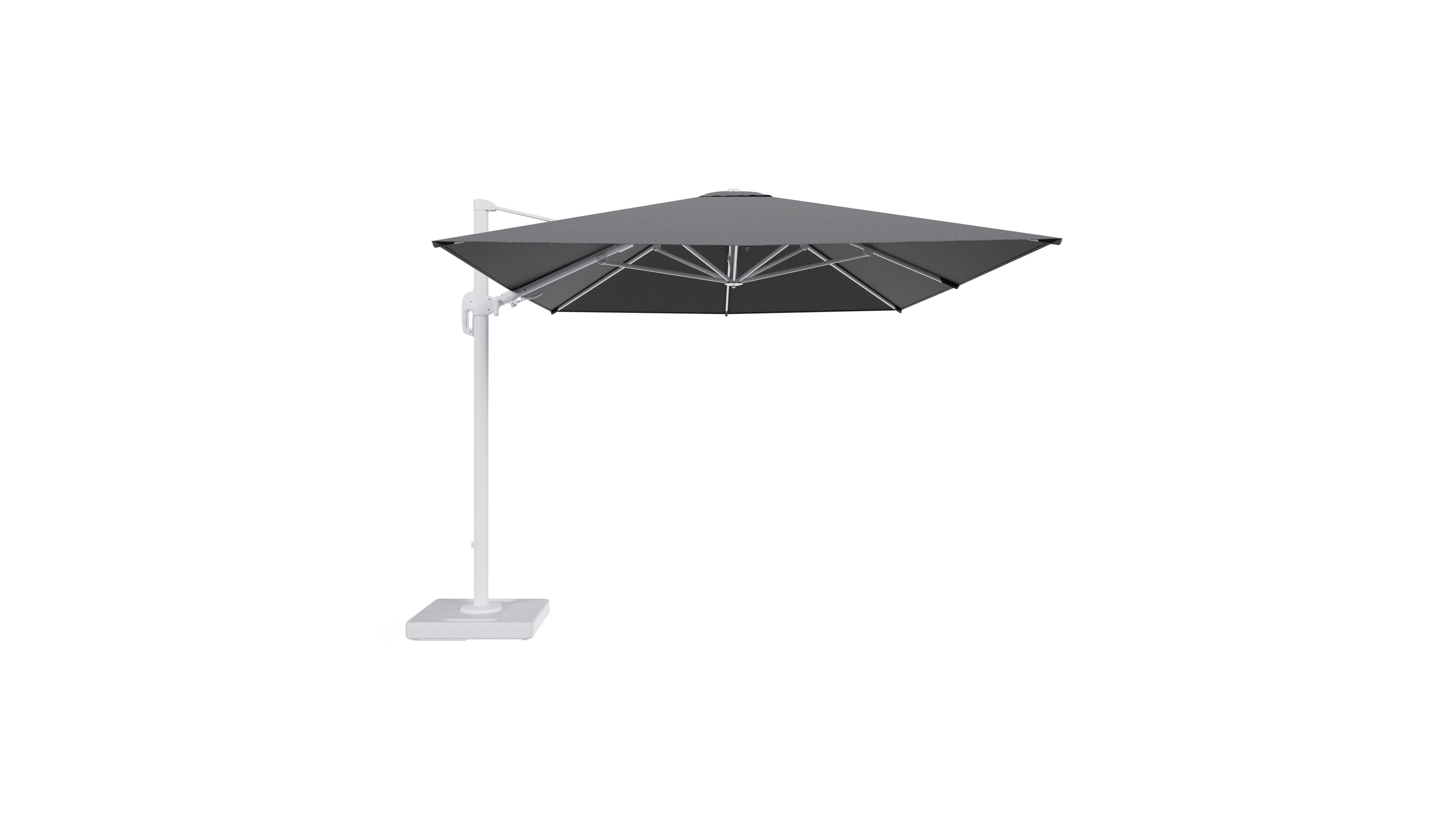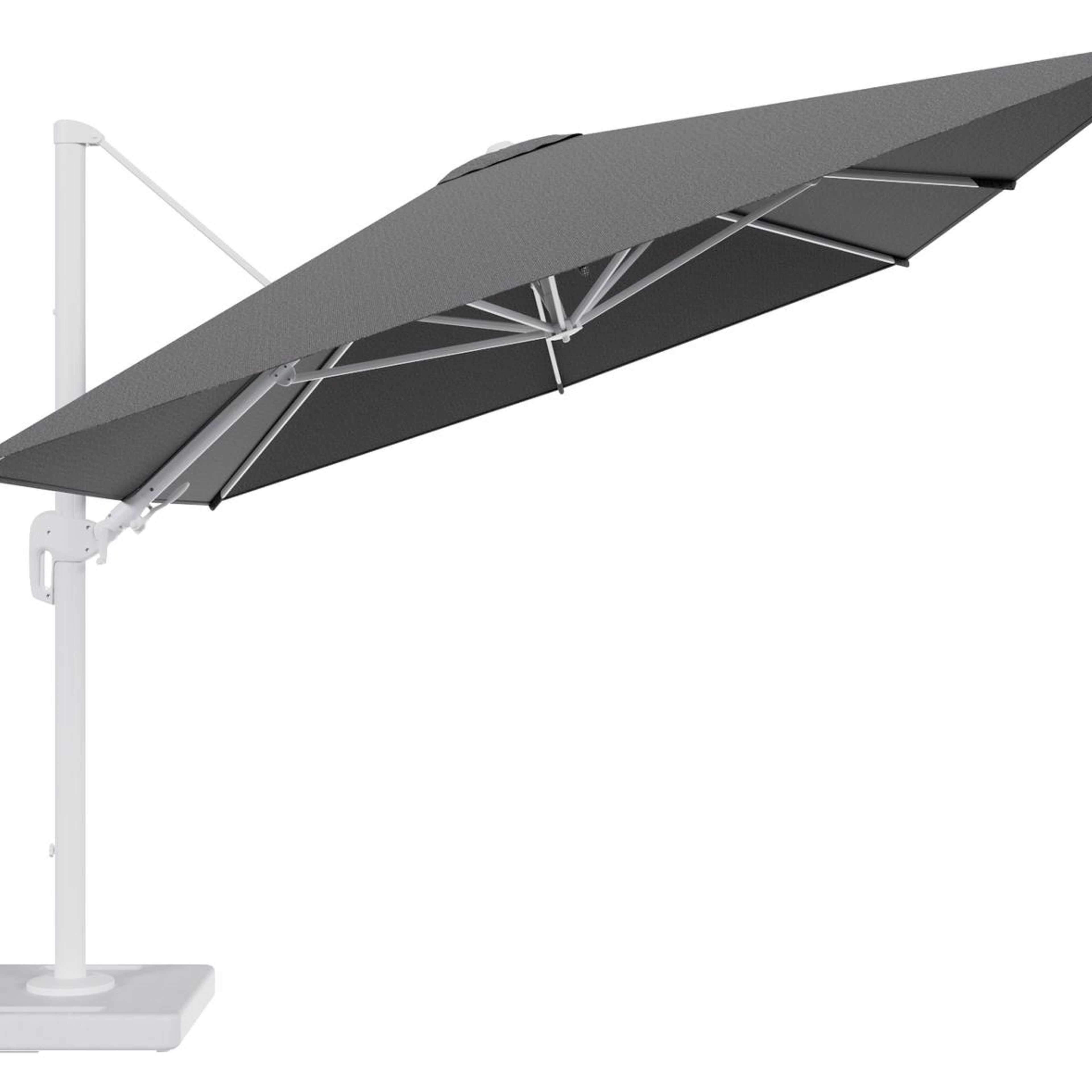 Parasol pendant Rufina avec fonction tilt en aluminium blanc et toile de parasol en All Weather Solica Firenze Tunder - Lg.1 400 x Lg.2 300 cm avec pied de parasol Lapido 160 kg | Exterioo mobilier de jardin
