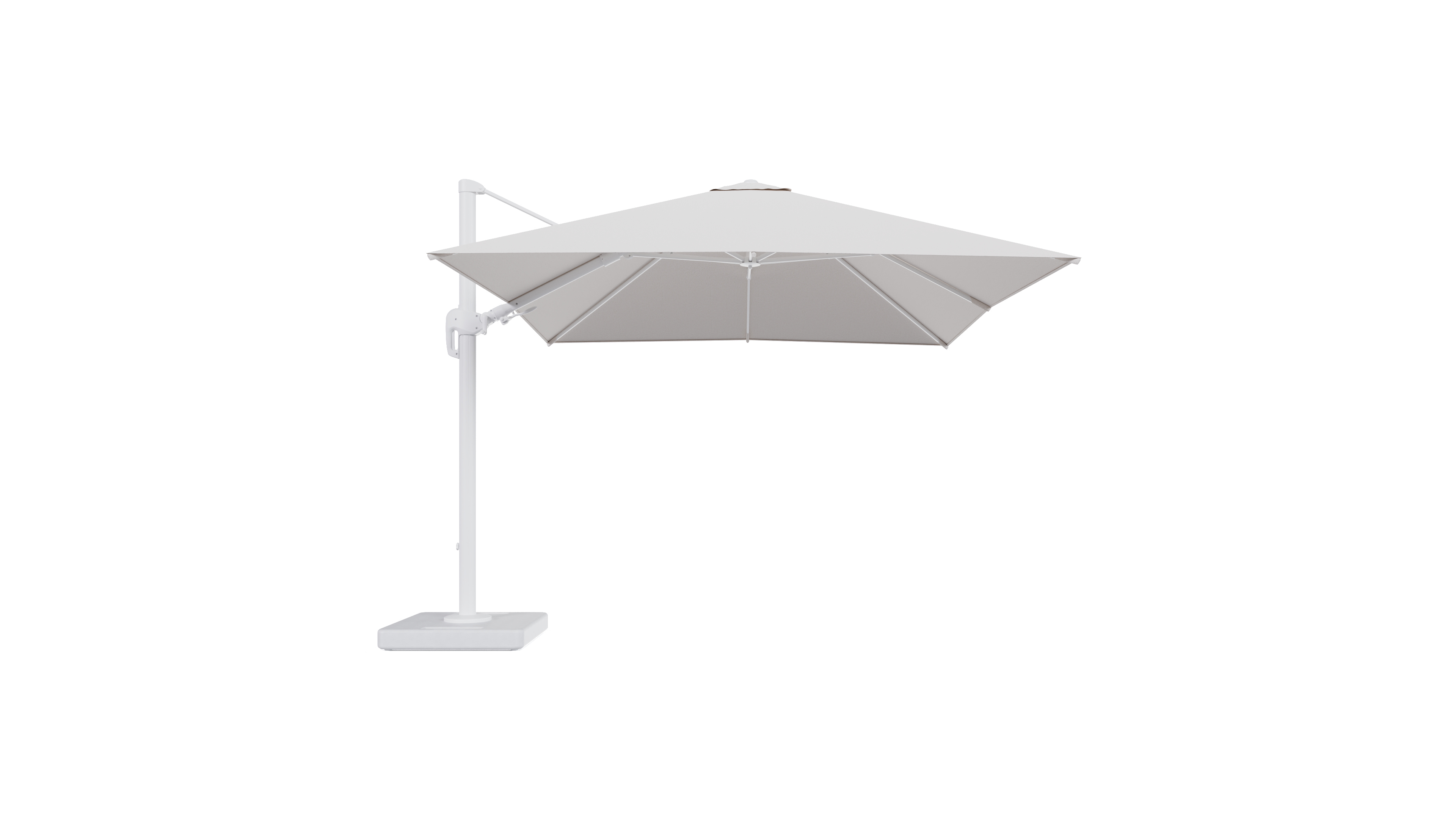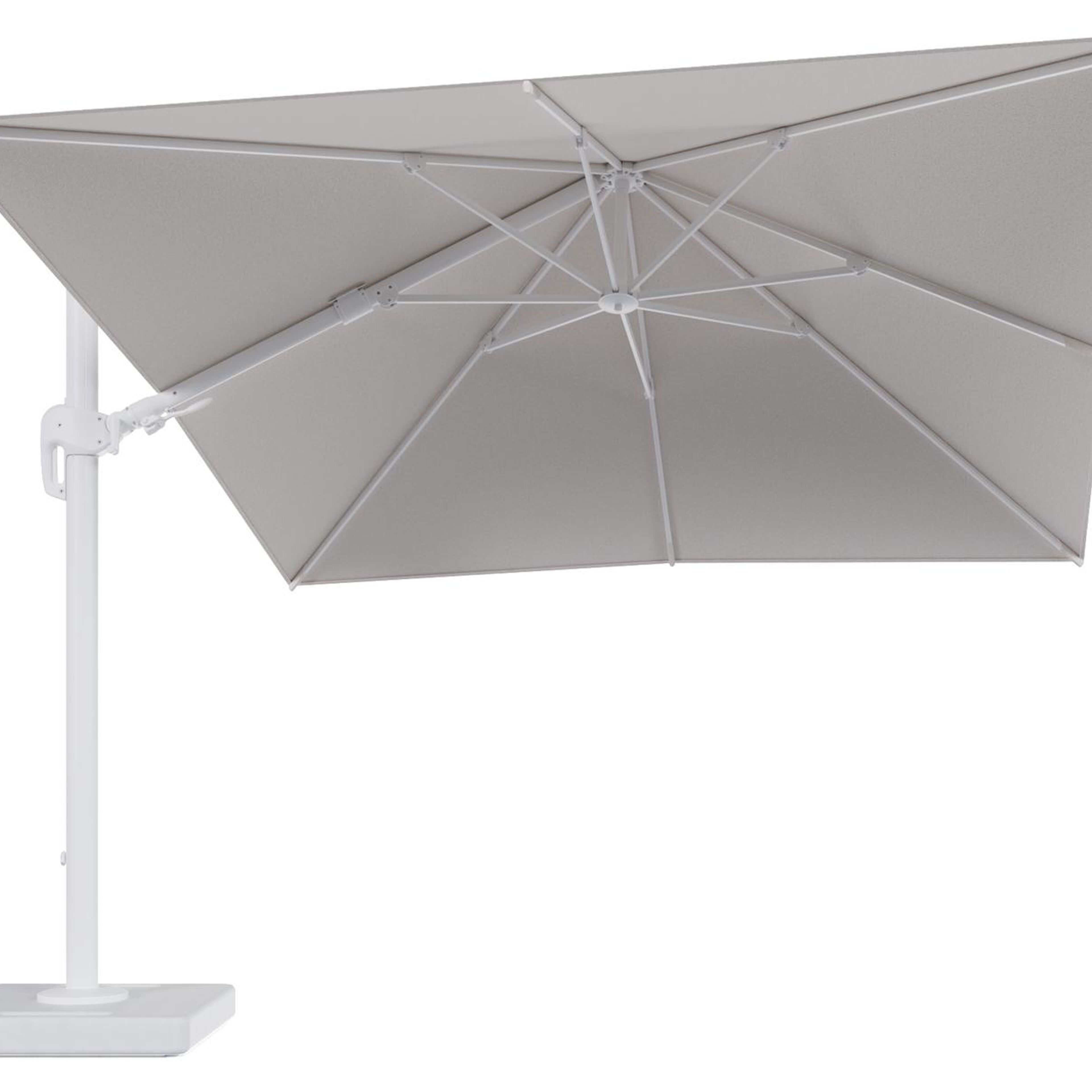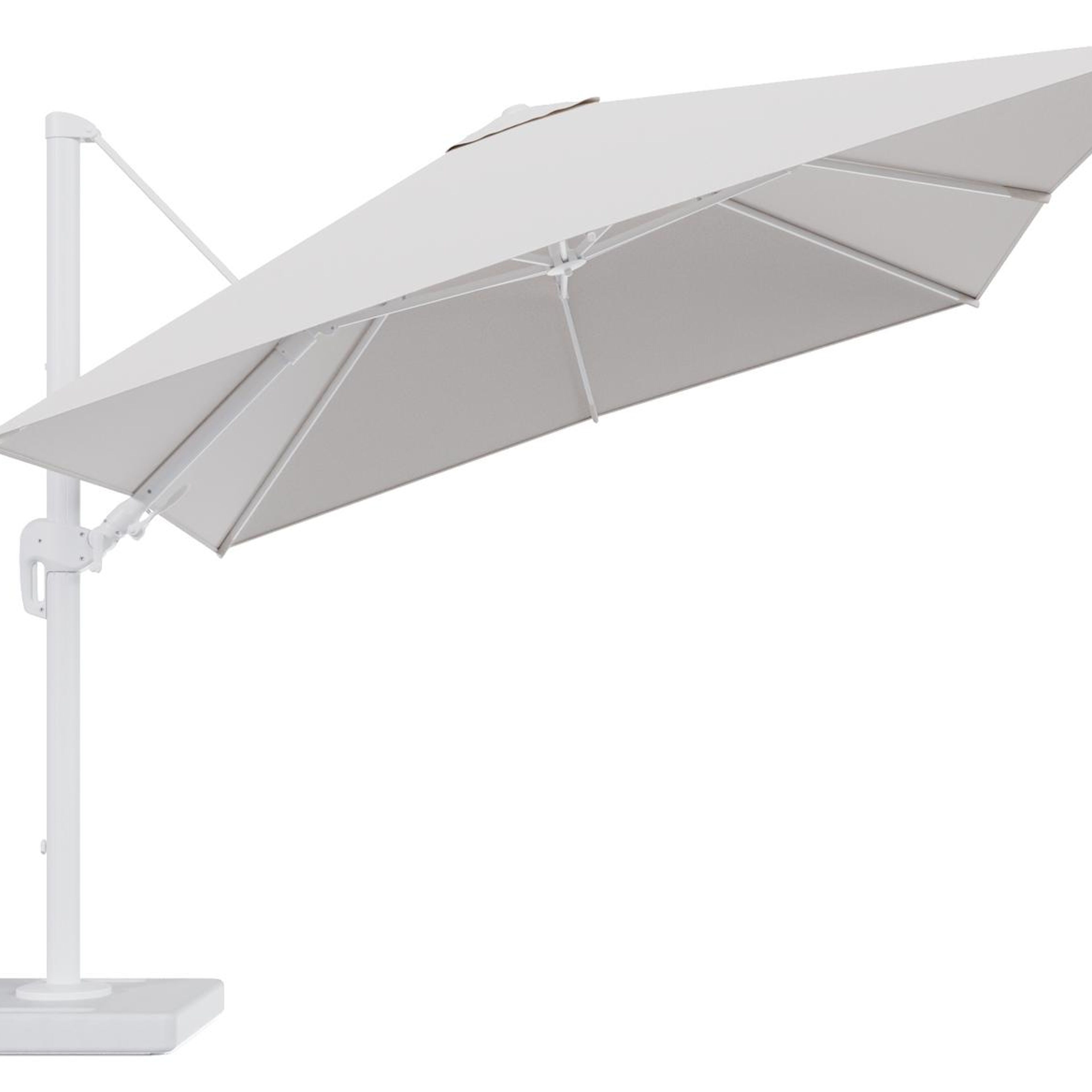 Parasol pendant Rufina avec fonction tilt en aluminium blanc et toile de parasol en All Weather Solica Ego Eggshell - Lg.1 300 x Lg.2 300 cm avec pied de parasol Lapido 160 kg | Exterioo mobilier de jardin