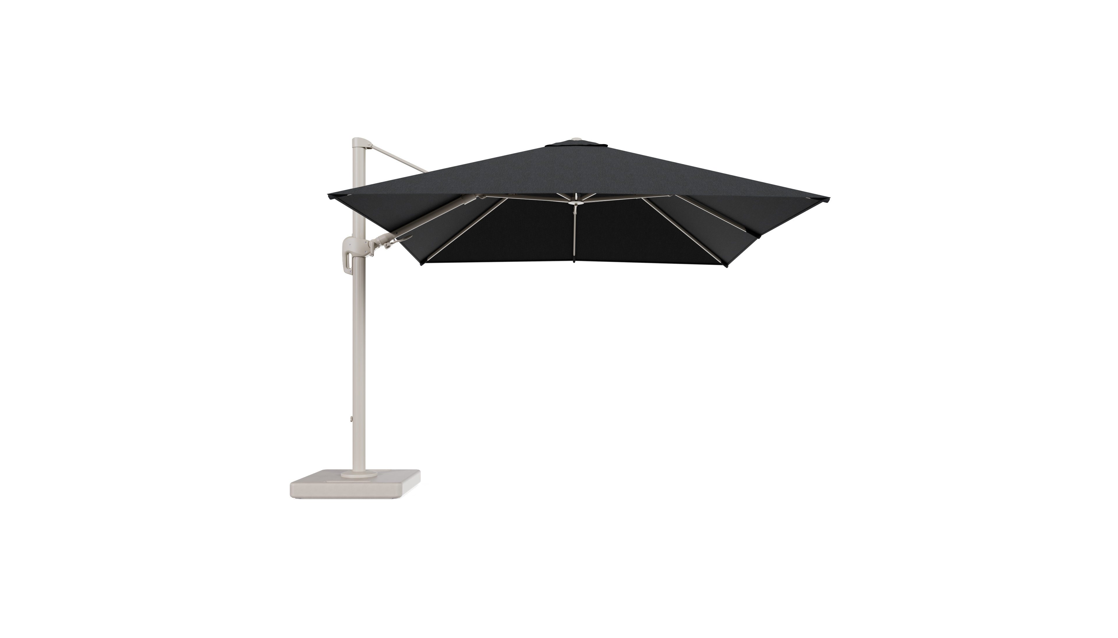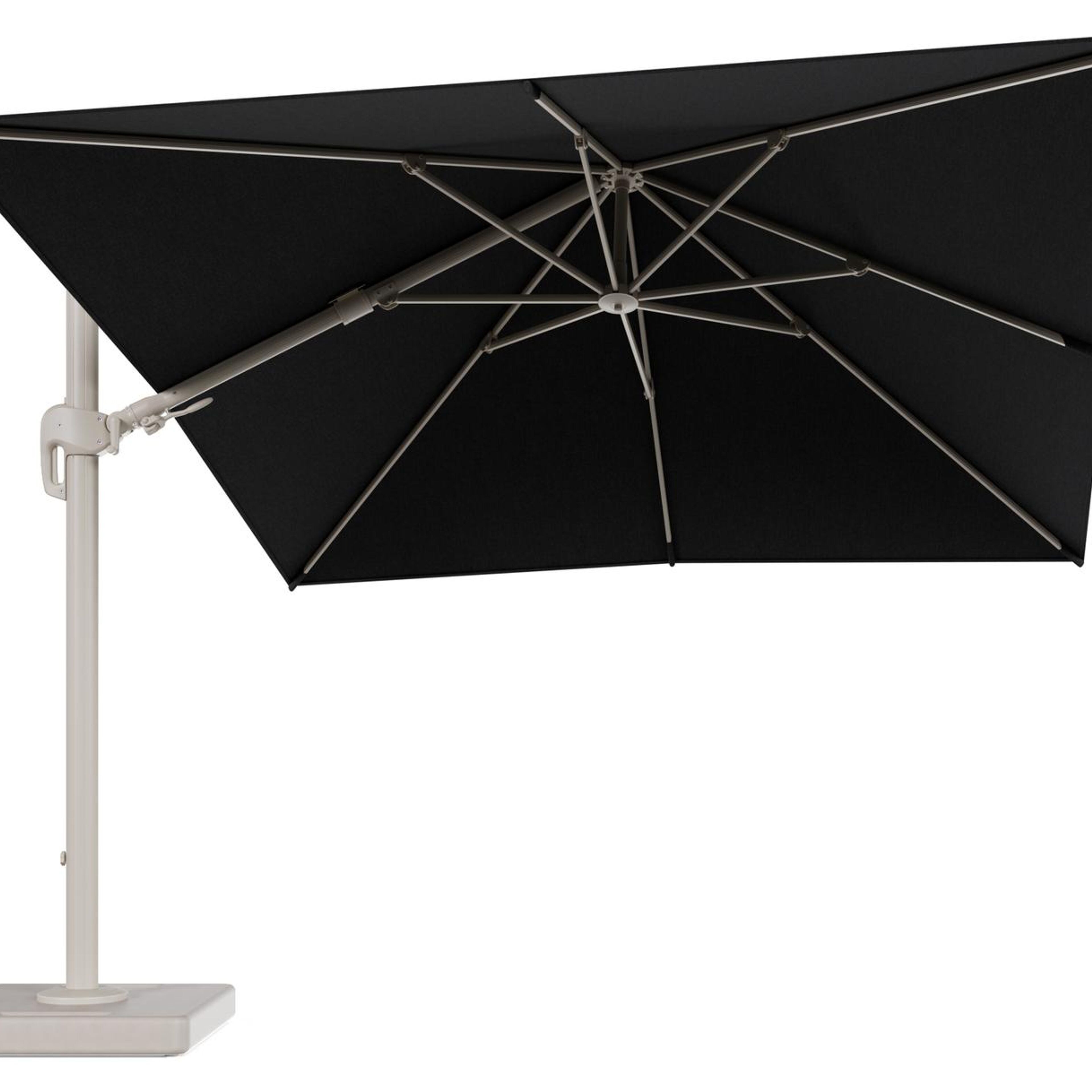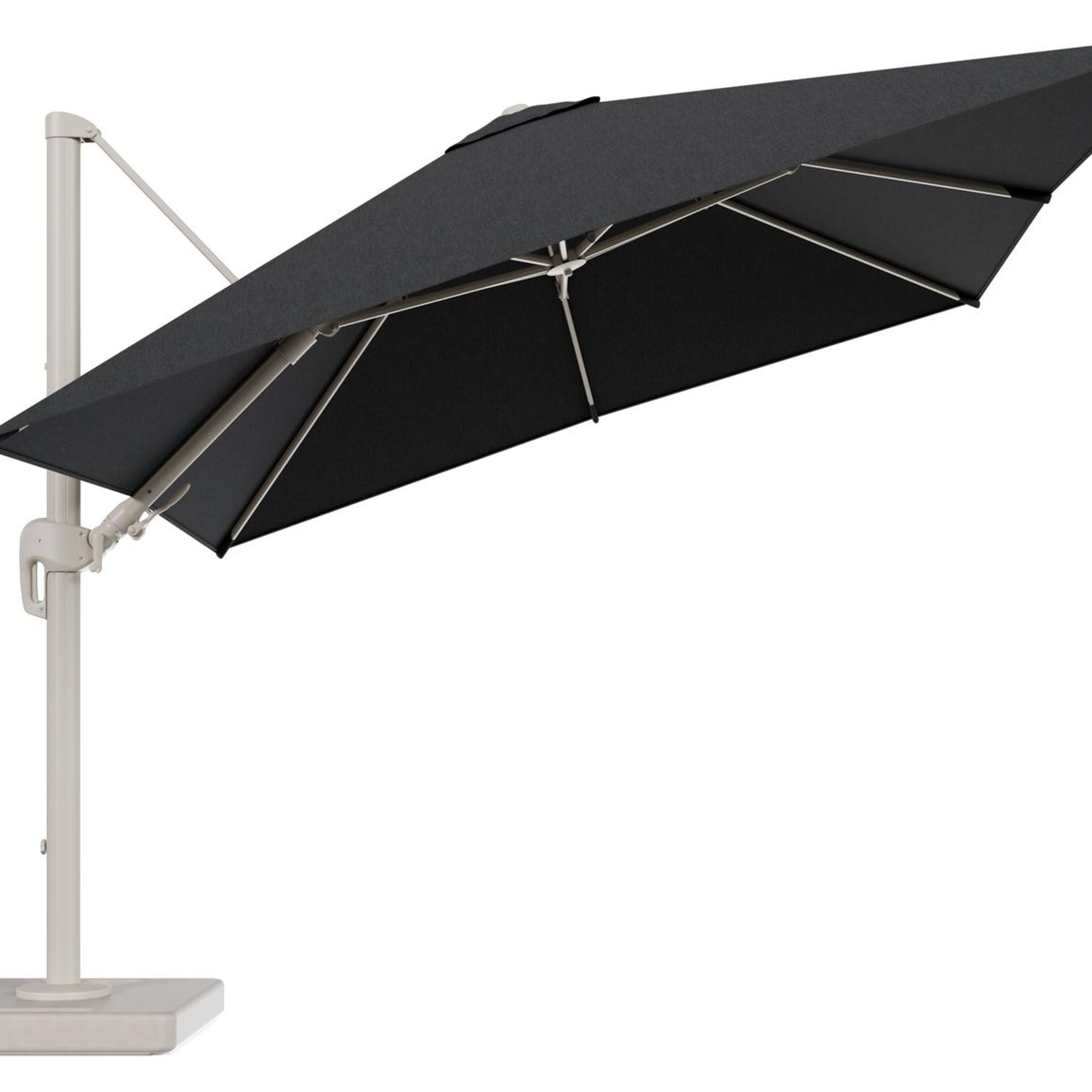 Parasol pendant Rufina avec fonction tilt en aluminium beige et toile de parasol en All Weather Sunbrella® Luxe Chartres Sooty - Lg.1 300 x Lg.2 300 cm avec pied de parasol Lapido 160 kg | Exterioo mobilier de jardin