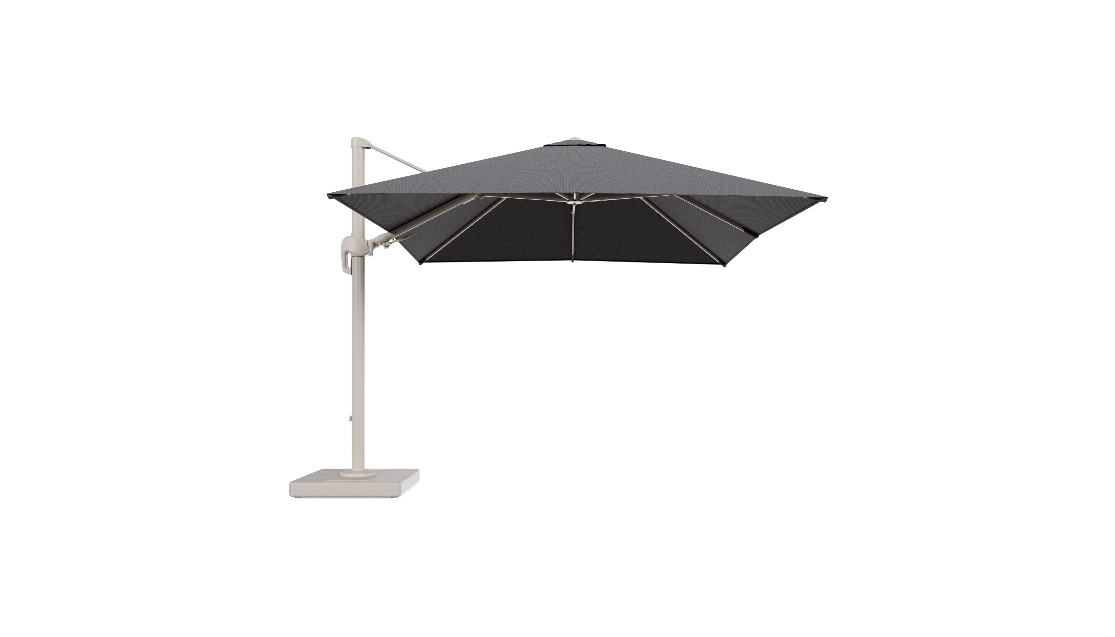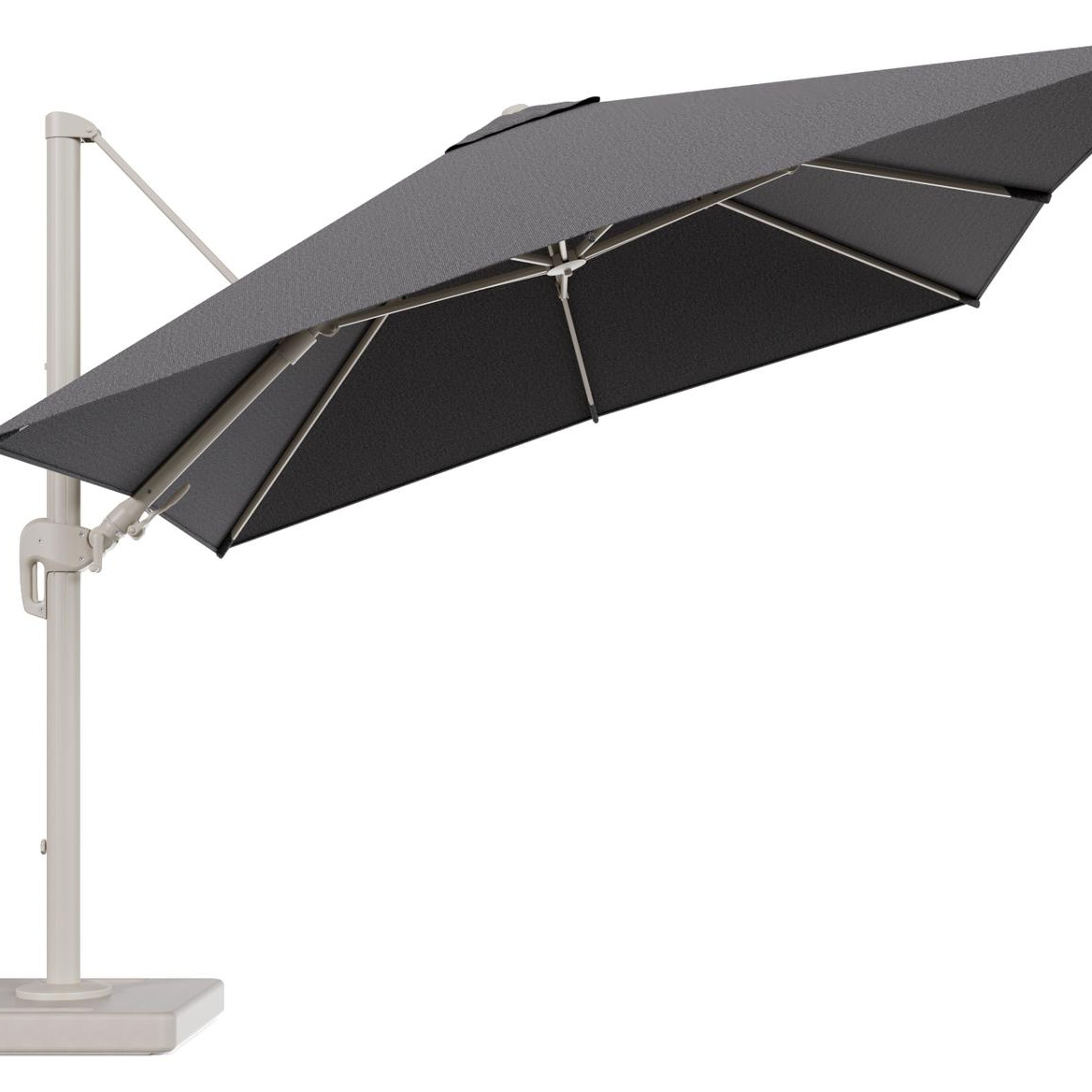 Parasol pendant Rufina avec fonction tilt en aluminium beige et toile de parasol en All Weather Solica Firenze Tunder - Lg.1 300 x Lg.2 300 cm avec pied de parasol Lapido 160 kg | Exterioo mobilier de jardin