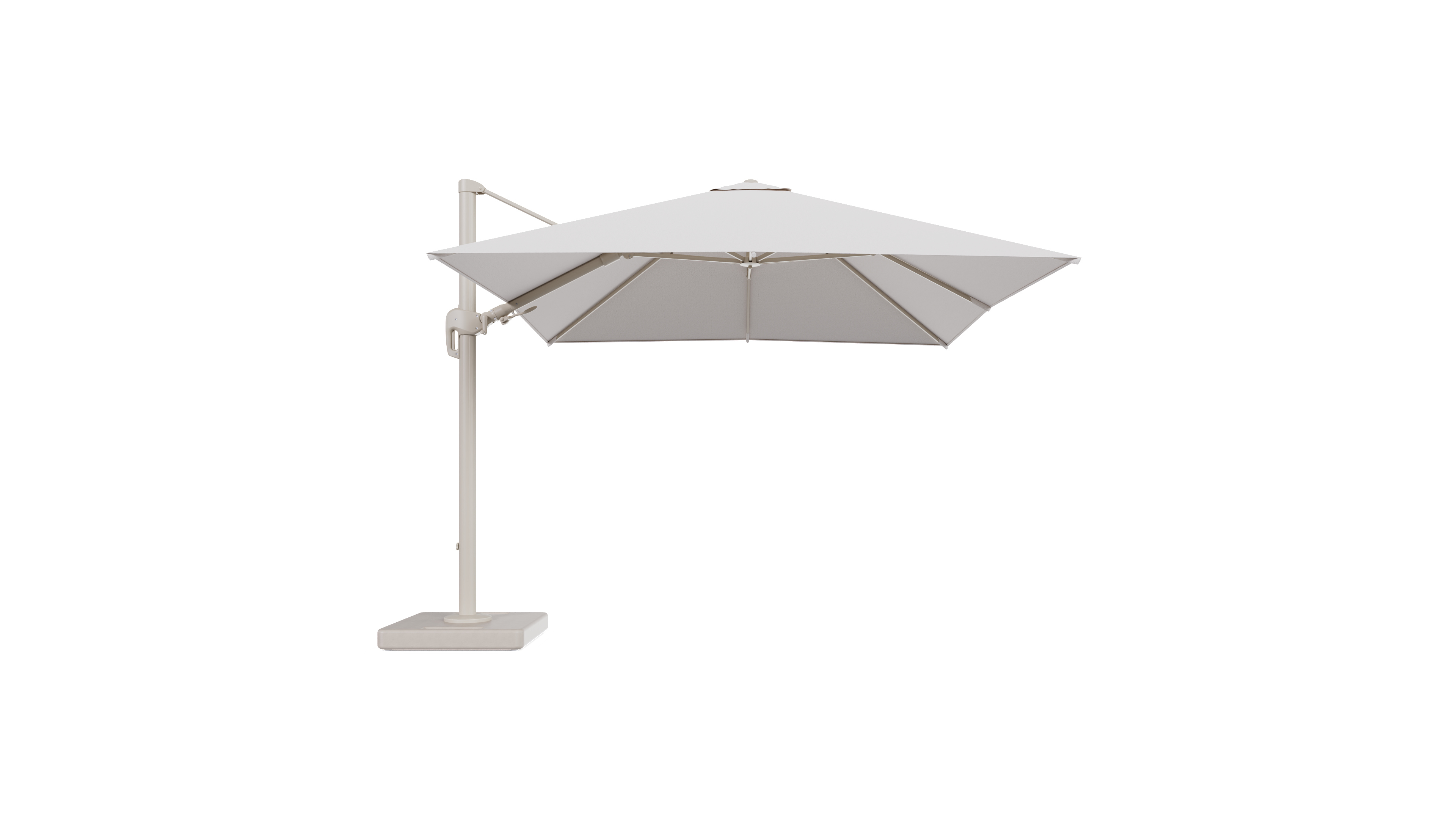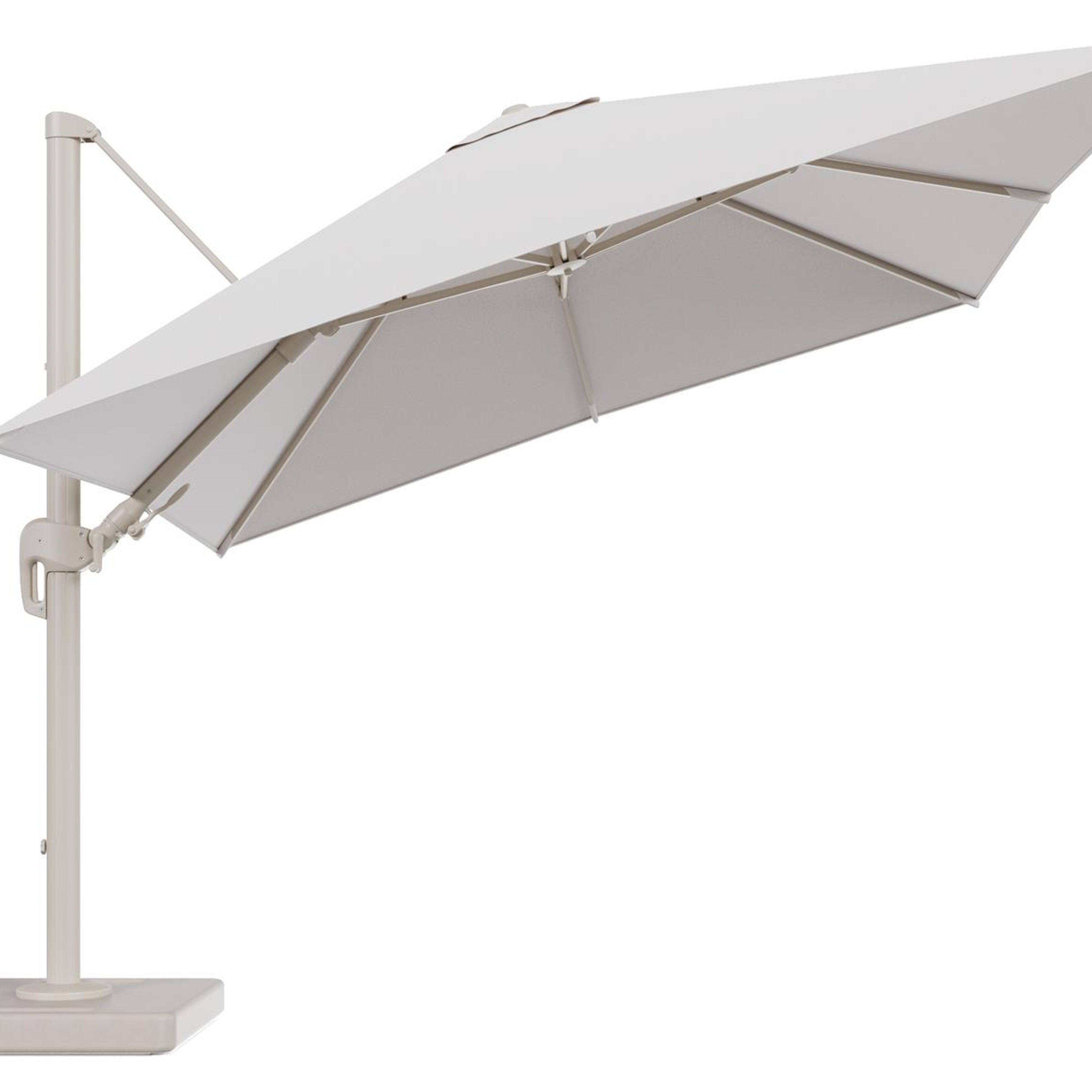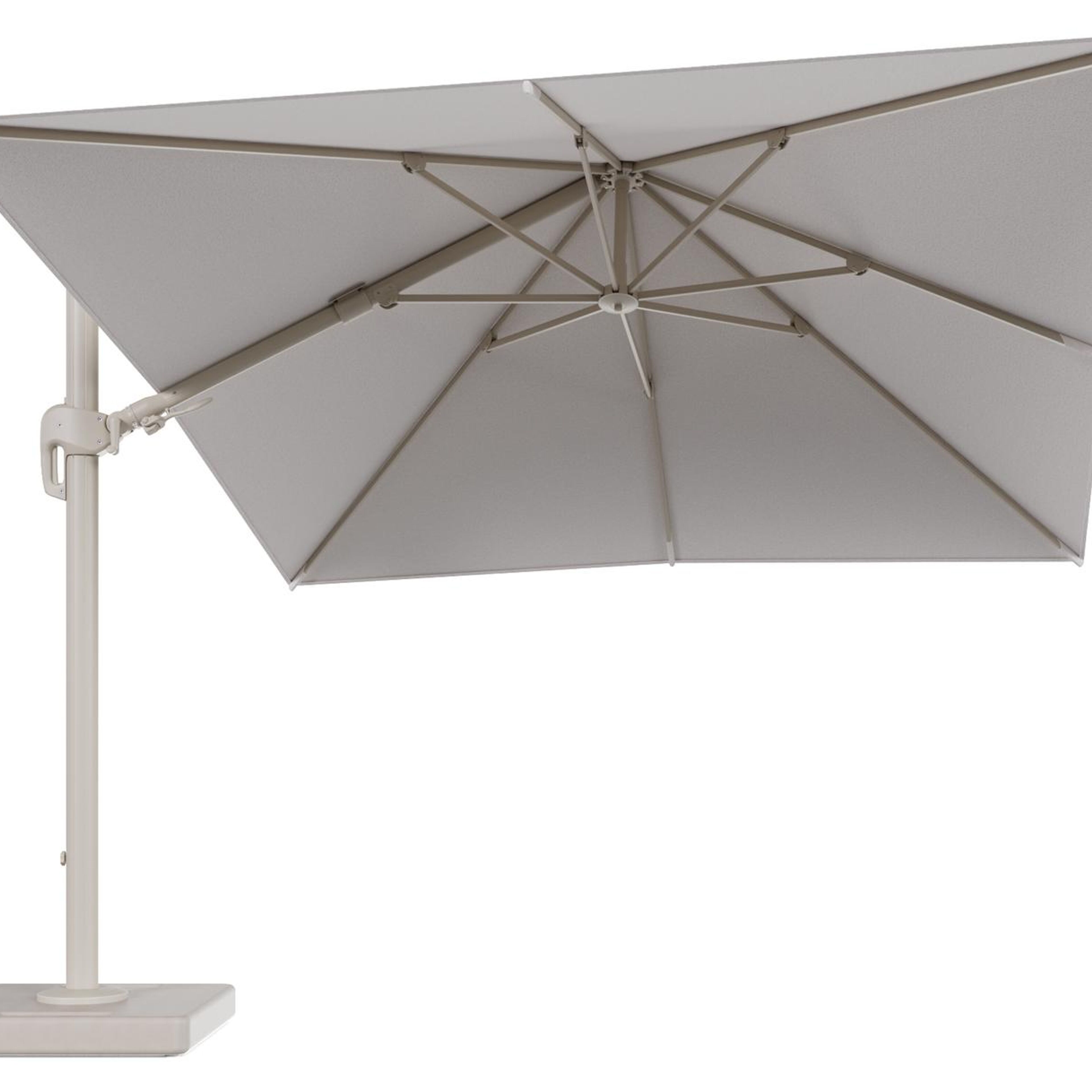 Parasol pendant Rufina avec fonction tilt en aluminium beige et toile de parasol en All Weather Solica Ego Eggshell - Lg.1 300 x Lg.2 300 cm avec pied de parasol Lapido 160 kg | Exterioo mobilier de jardin